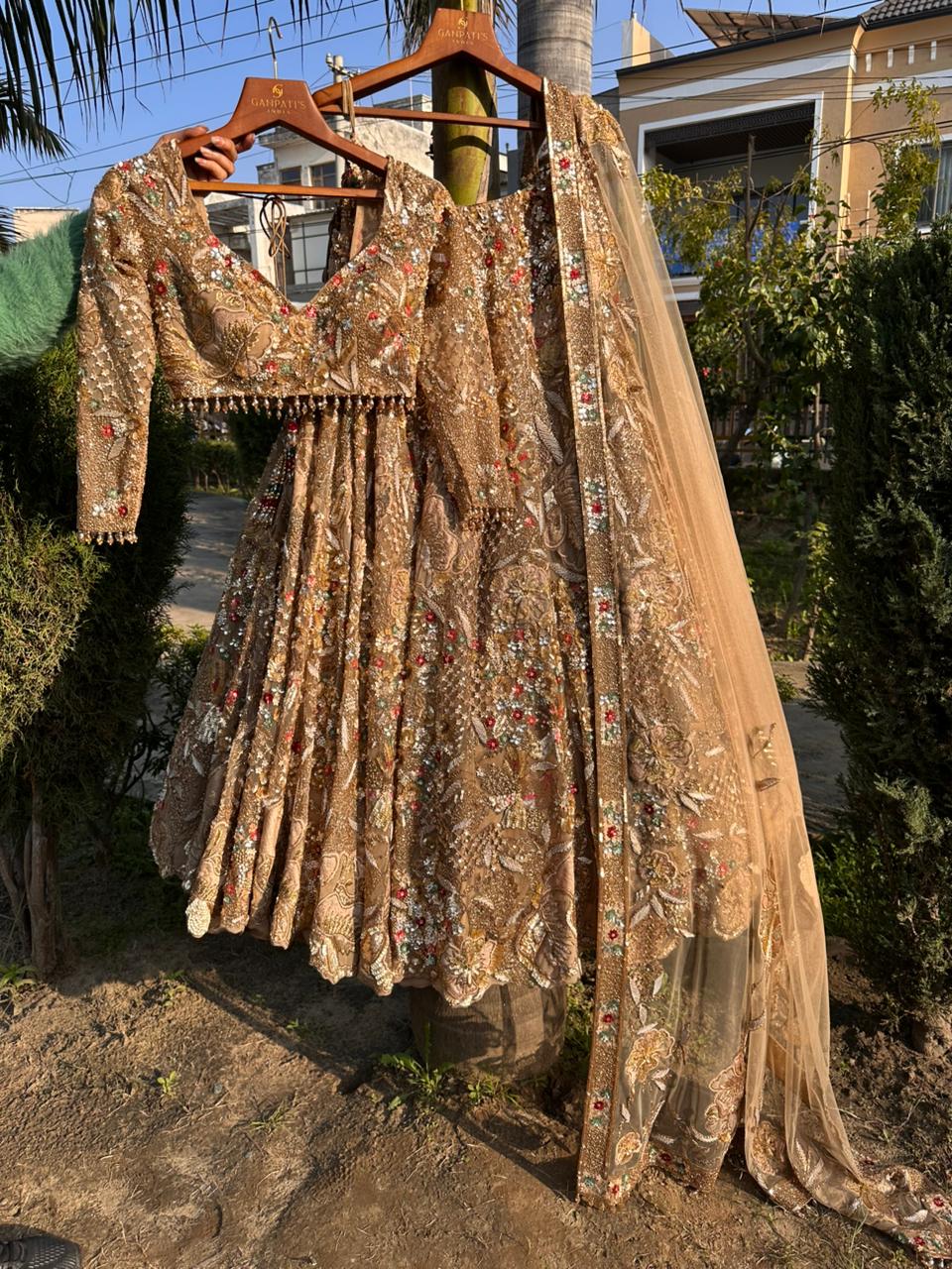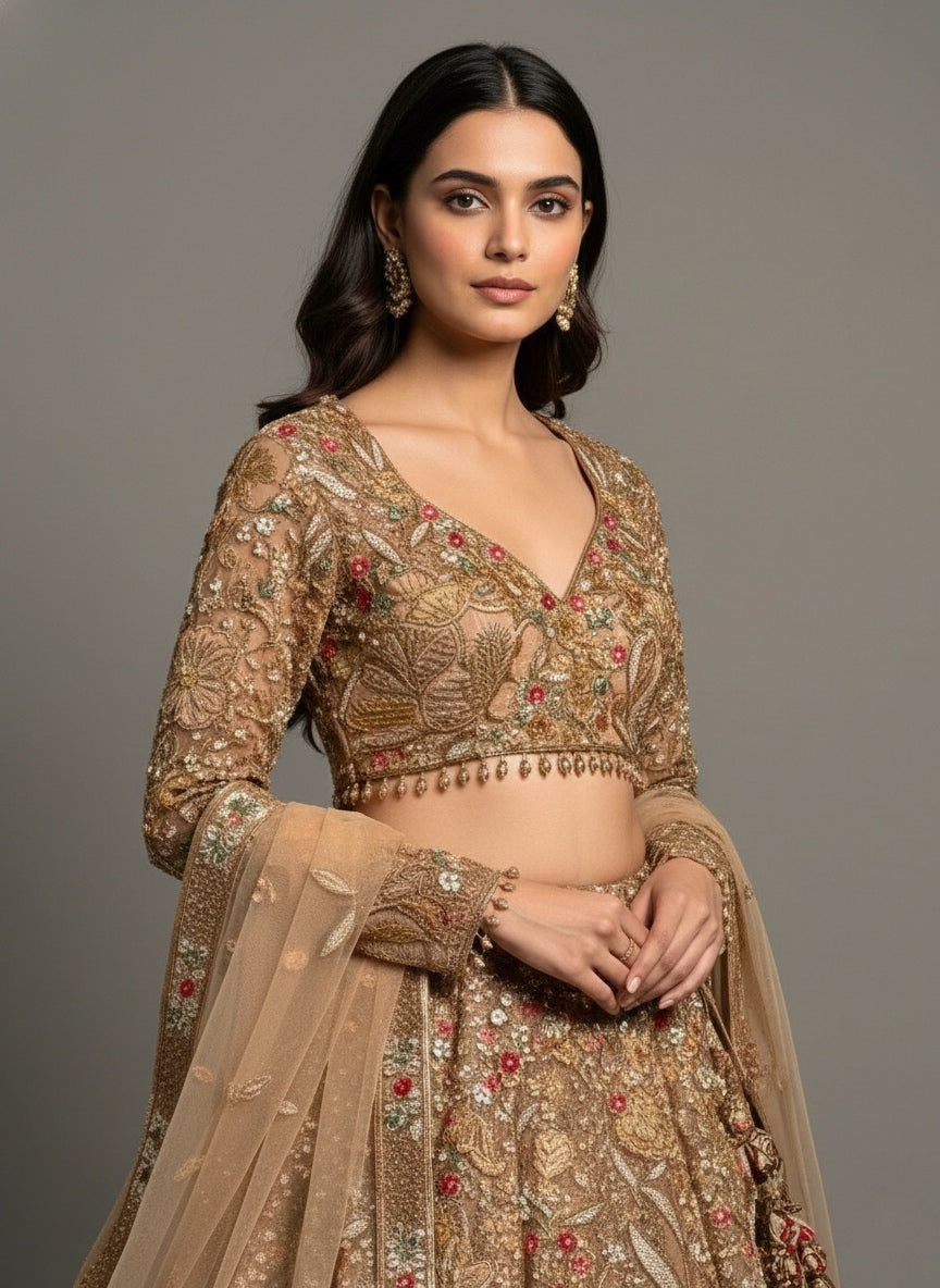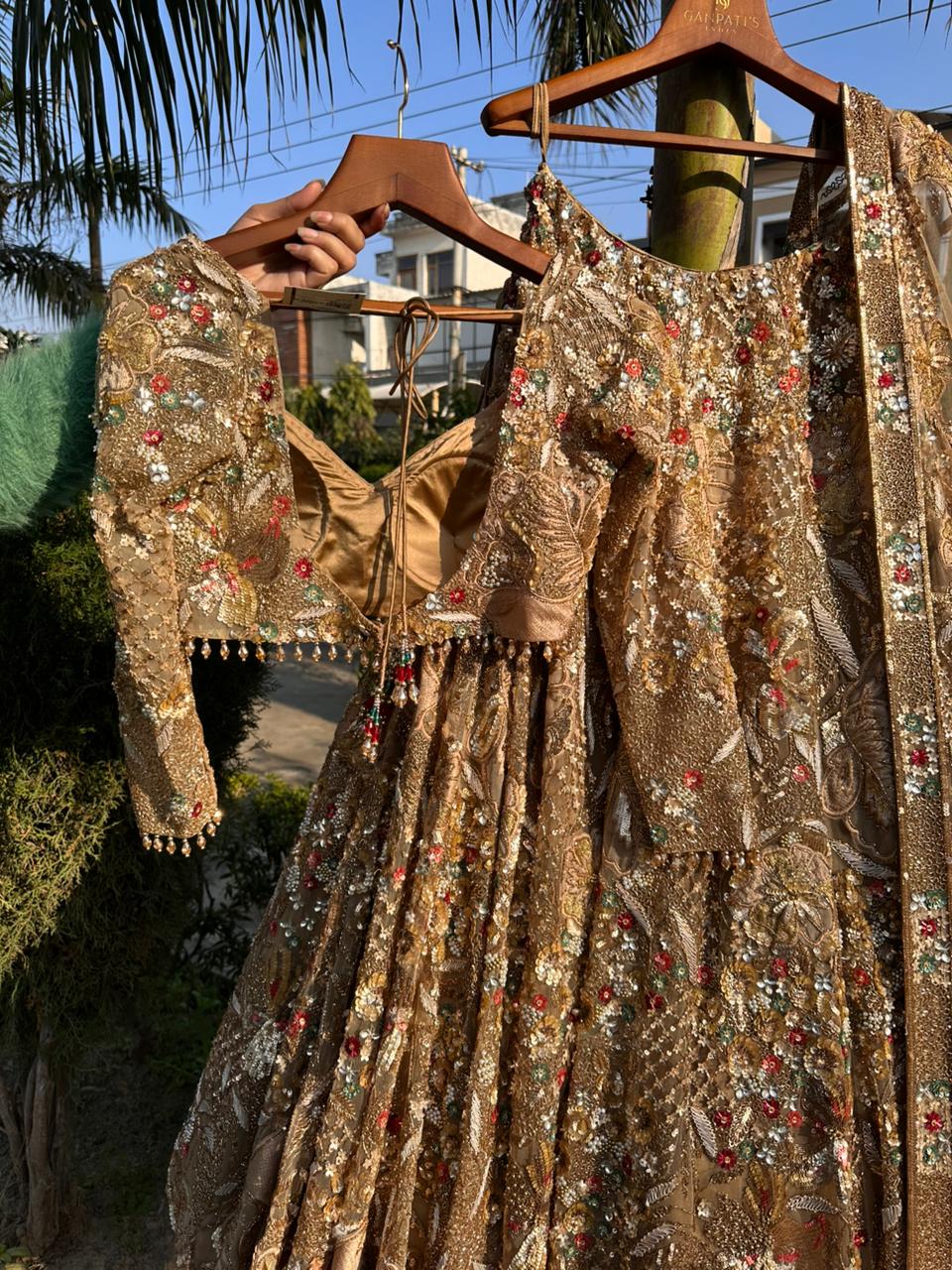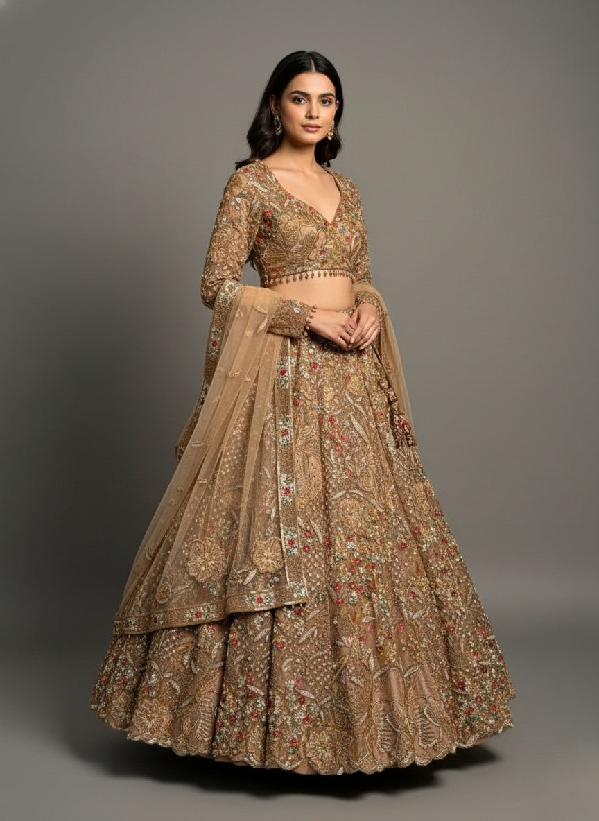 Hand-embroidered champagne gold net lehenga set