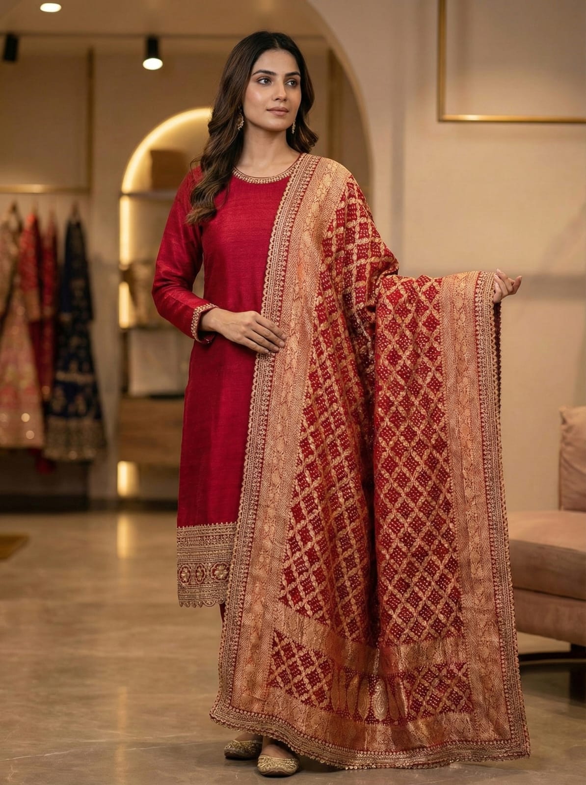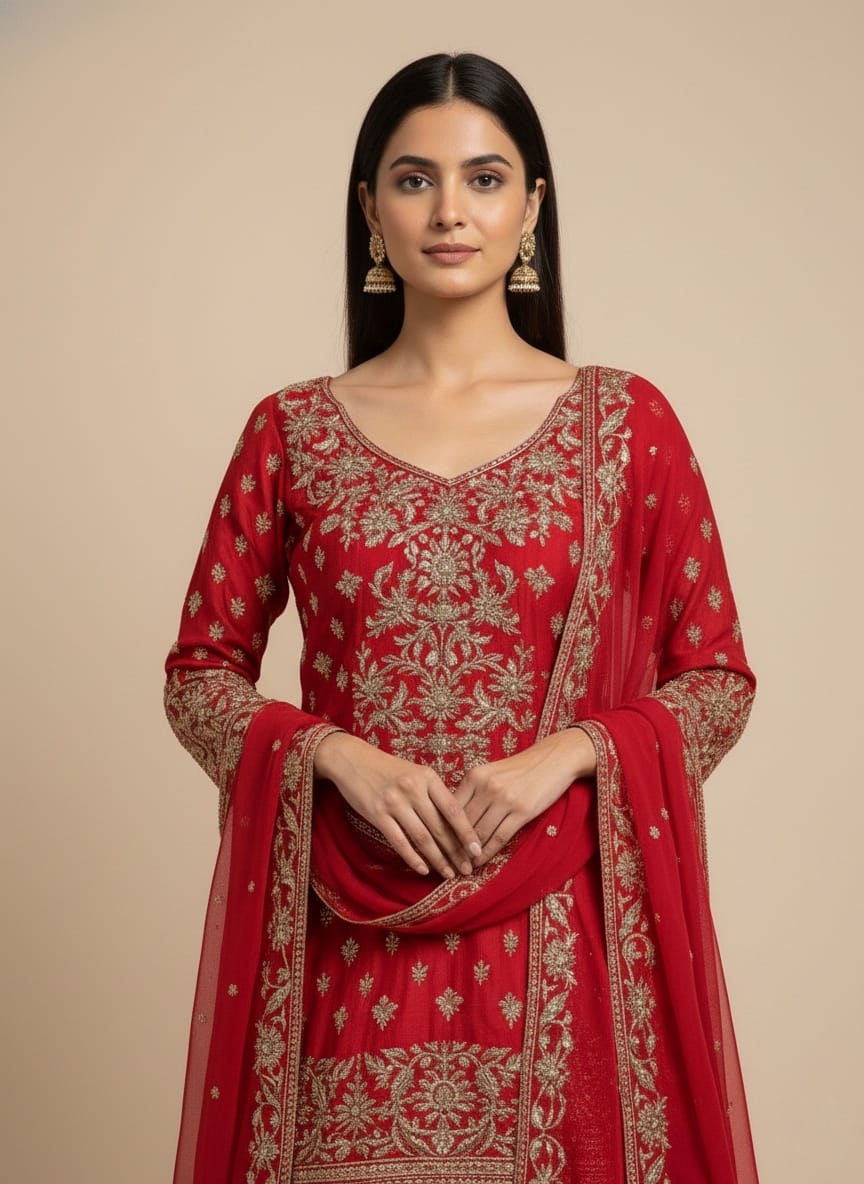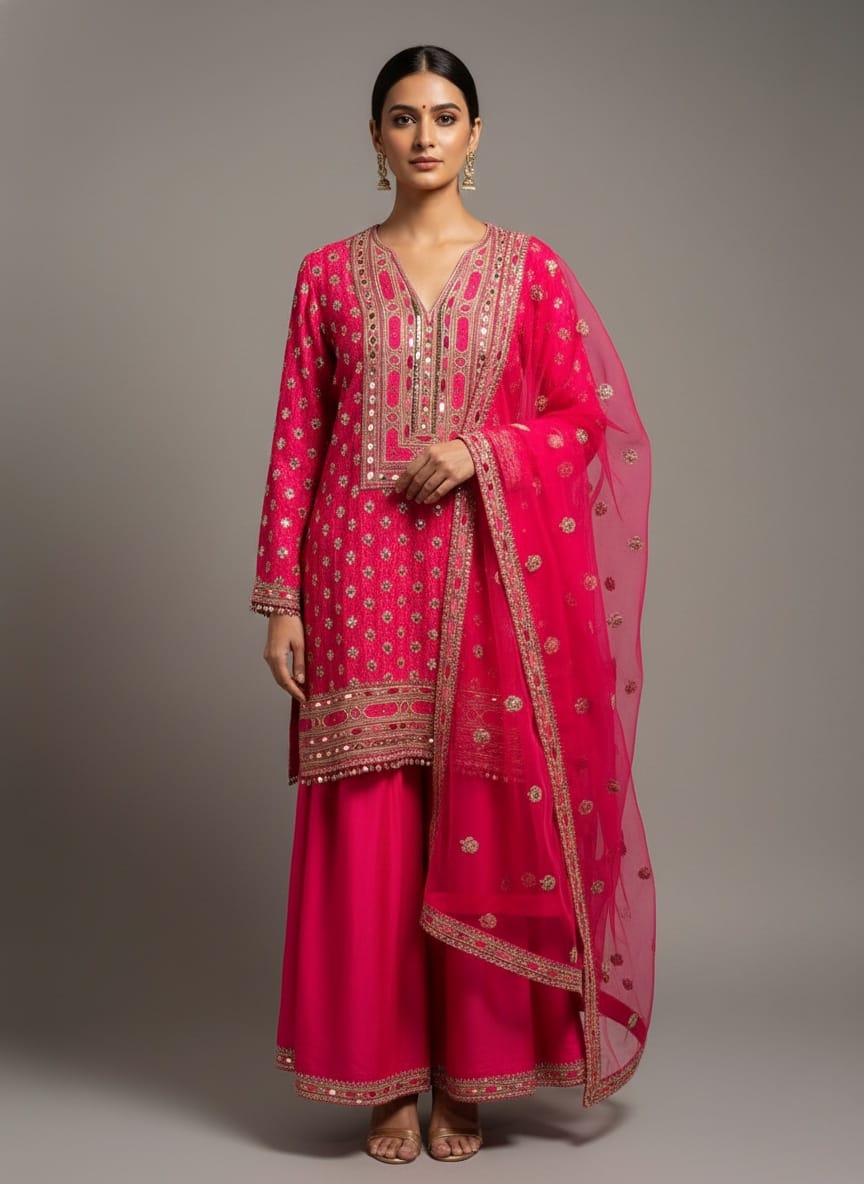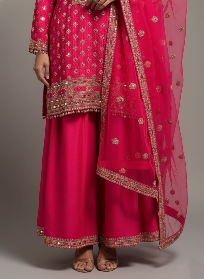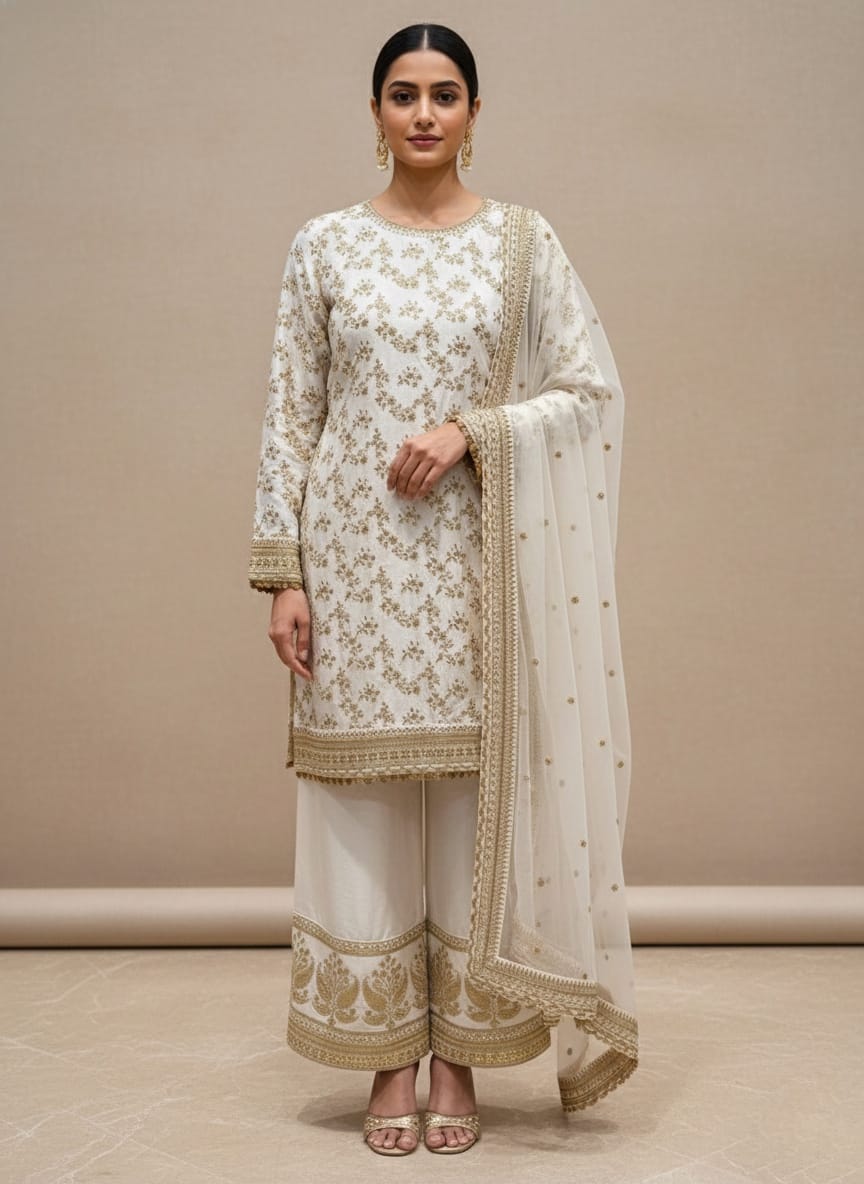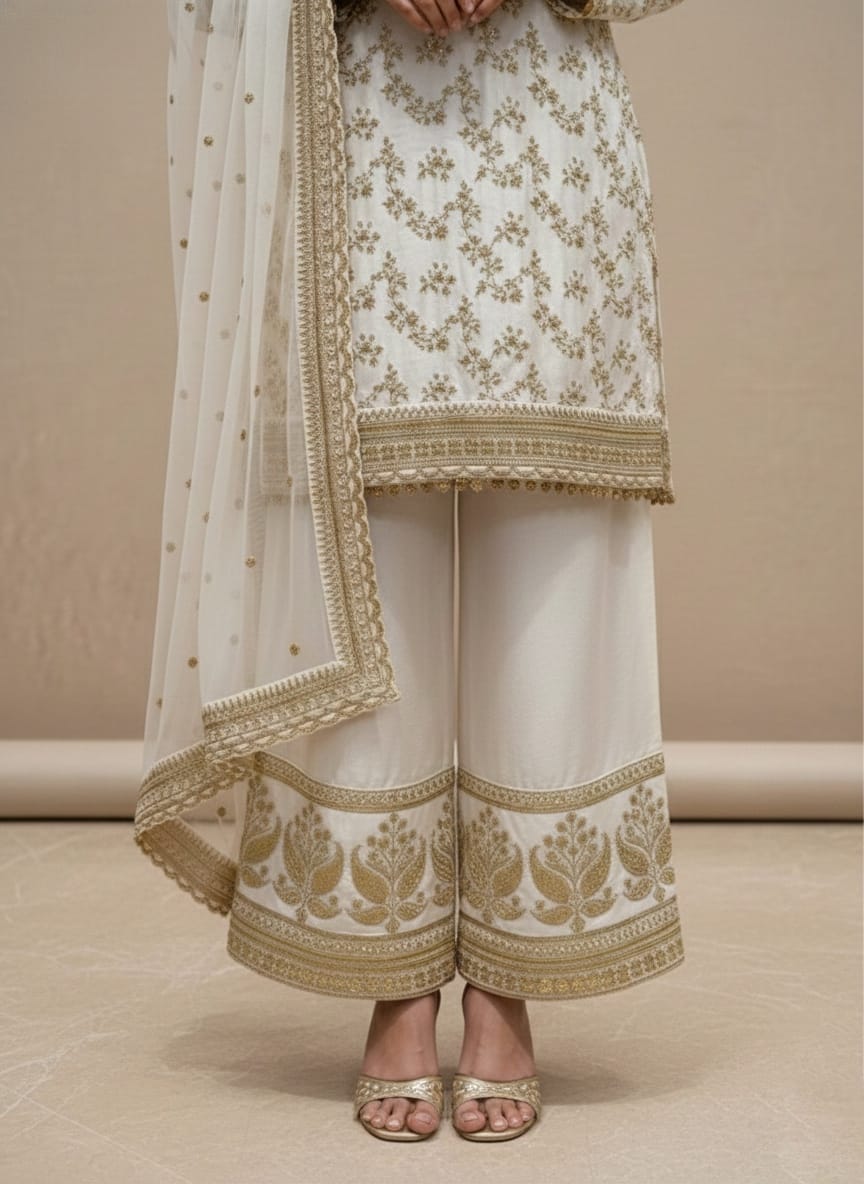 Pure raw silk ivory embroidered kurta palazzo set with dupatta