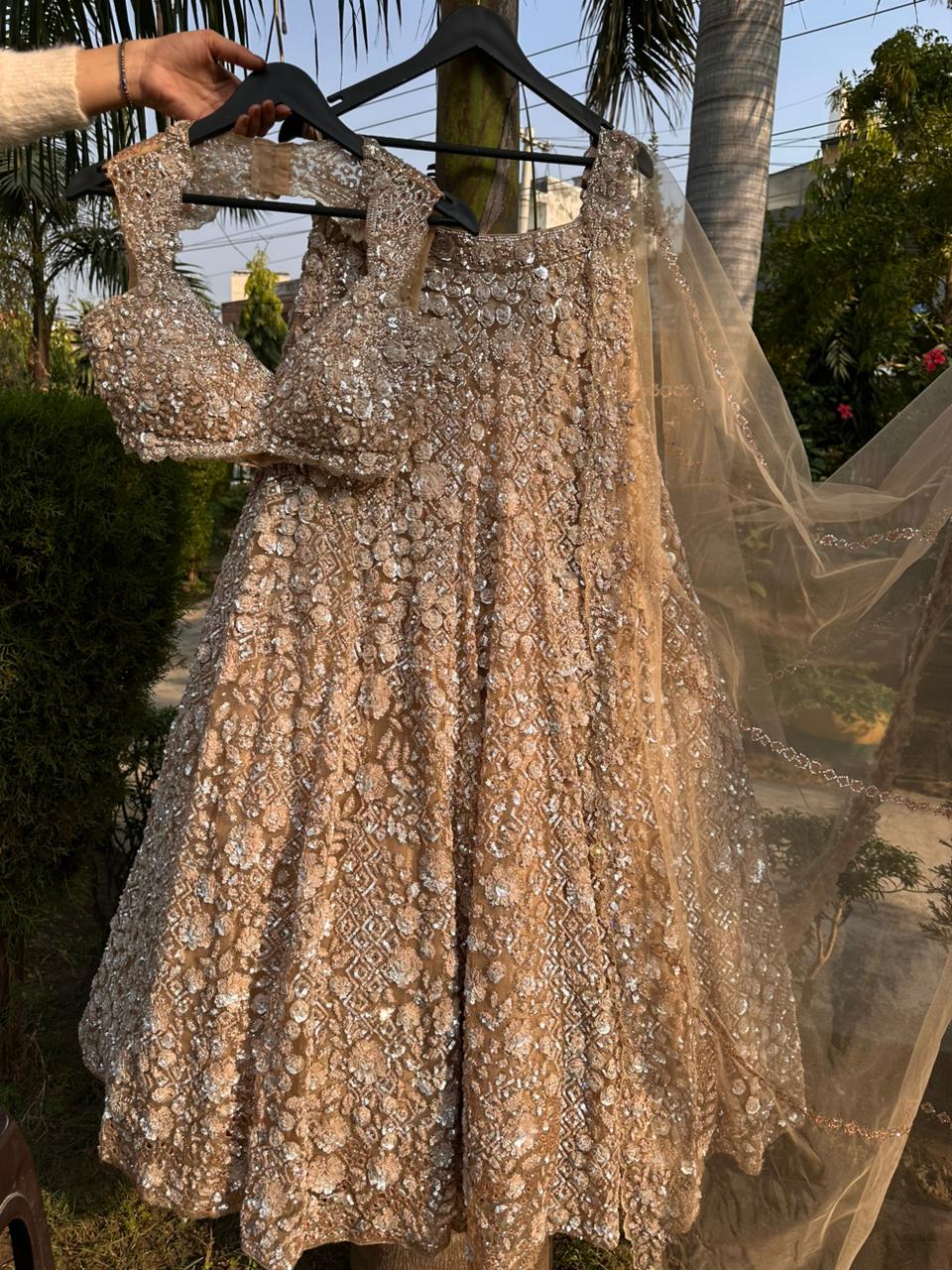 Step into elegance with this luxury champagne-gold lehenga set, crafted to make you shine at every celebration. The outfit features a heavily embellished flared lehenga adorned with intricate sequin, zari, and thread embroidery that catches the light beautifully from every angle. The matching hand-embroidered blouse is richly detailed, offering a glamorous and perfectly coordinated look. Completing the ensemble is a soft net dupatta in a matching champagne tone, decorated with a delicate sequin border for an extra touch of sparkle. Made from premium net and silk-blend fabric, this lehenga ensures both comfort and grandeur—perfect for weddings, engagements, receptions, sangeet nights, or any event where you want to stand out.