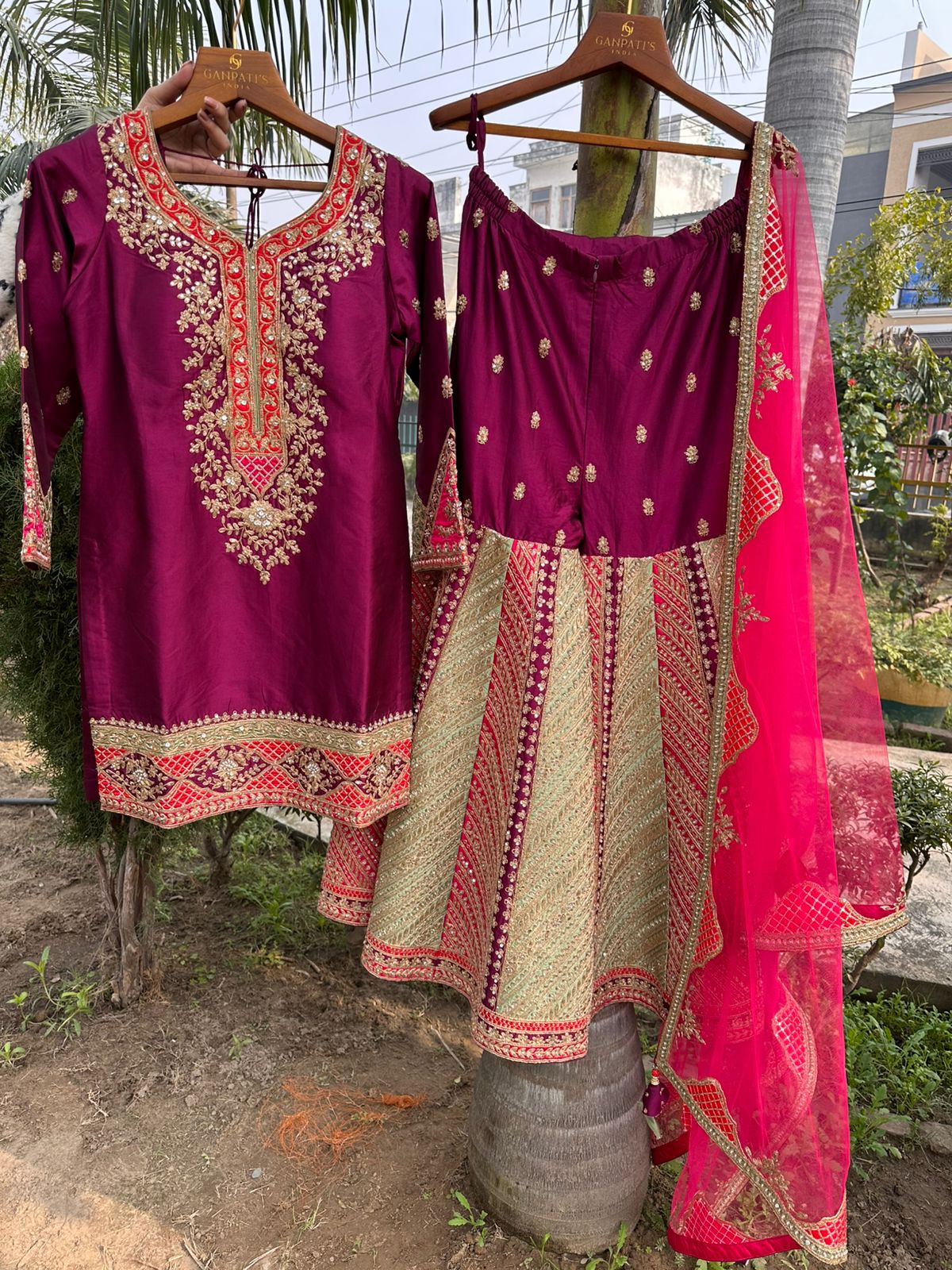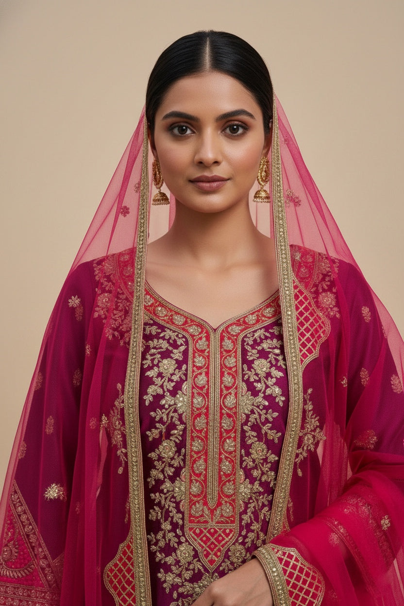 Step into elegance with this luxurious Pure Silk Kurti Sharara Set, designed in a rich wine maroon shade that exudes timeless charm. The kurti is beautifully adorned with intricate gold zari and thread embroidery along the neckline, sleeves, and hem, offering a refined and festive appeal. The matching sharara features delicate gold buttis on the upper portion and richly embroidered panels on the flared lower half, creating graceful movement and a royal silhouette. Completing the ensemble is a vibrant pink dupatta, enhanced with an ornate gold embroidered border that adds a striking contrast and festive richness. Perfect for weddings, festive celebrations, engagement functions, and traditional occasions, this ensemble showcases fine craftsmanship and premium silk fabric for an elegant and luxurious look.