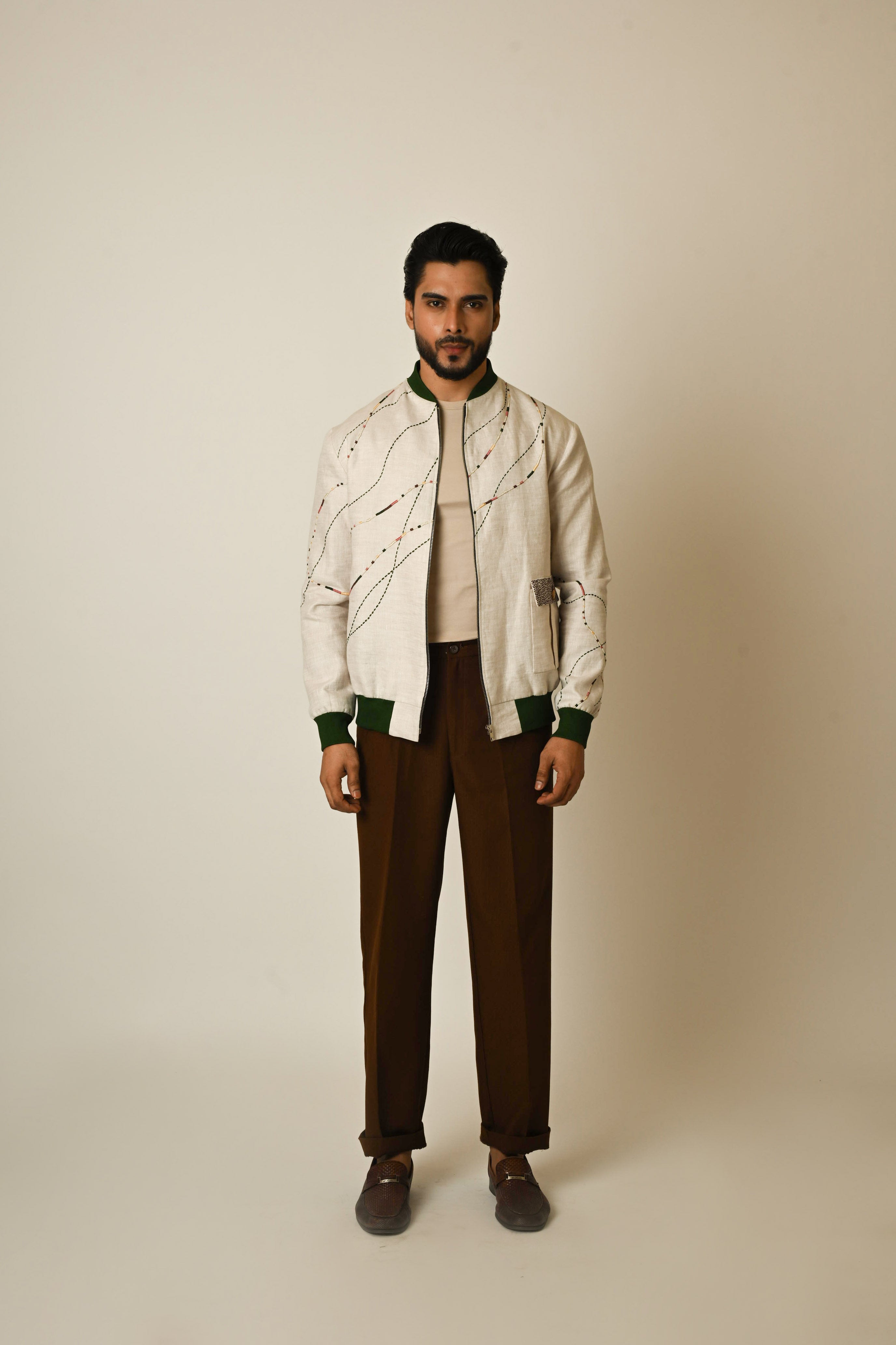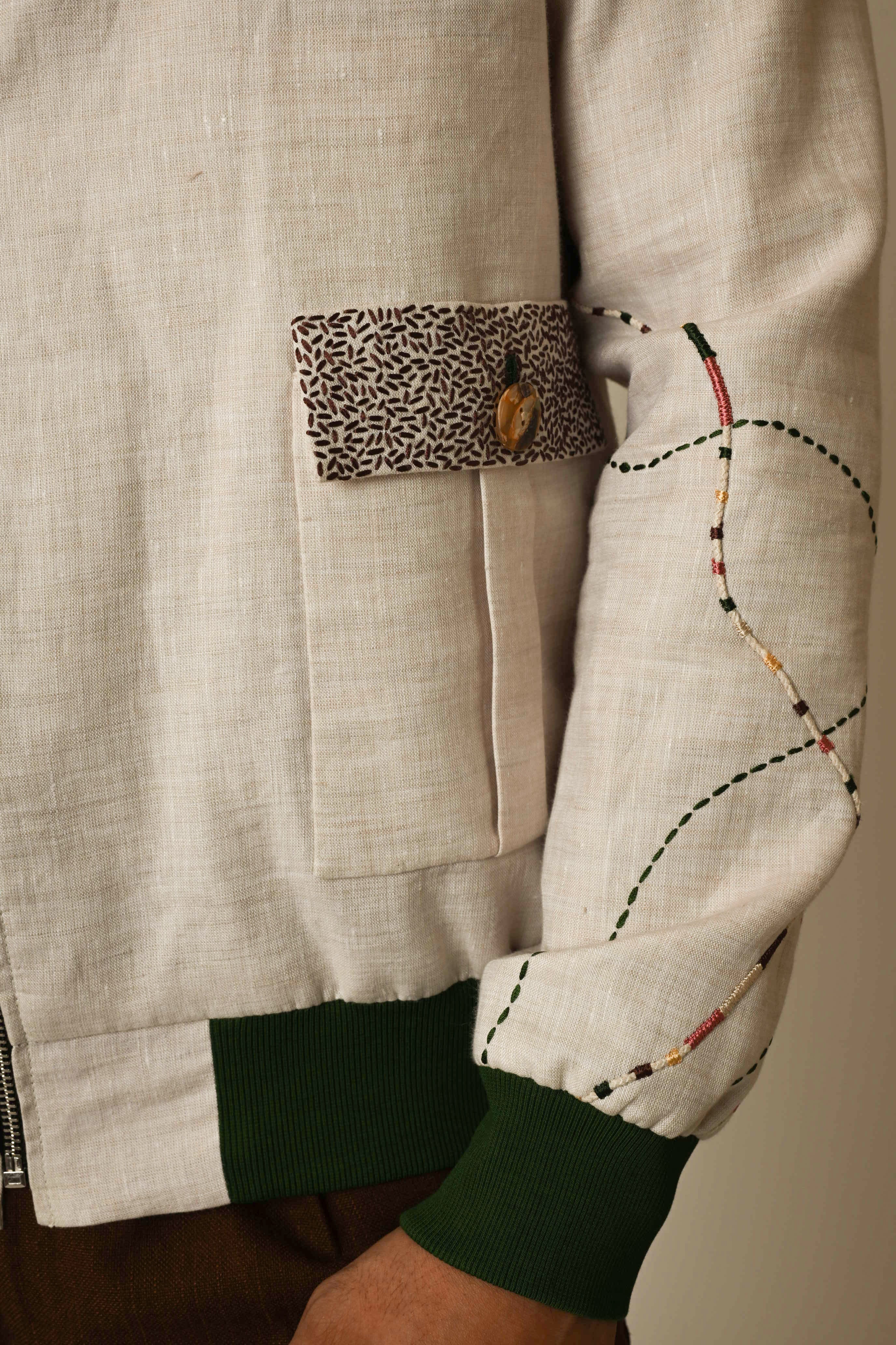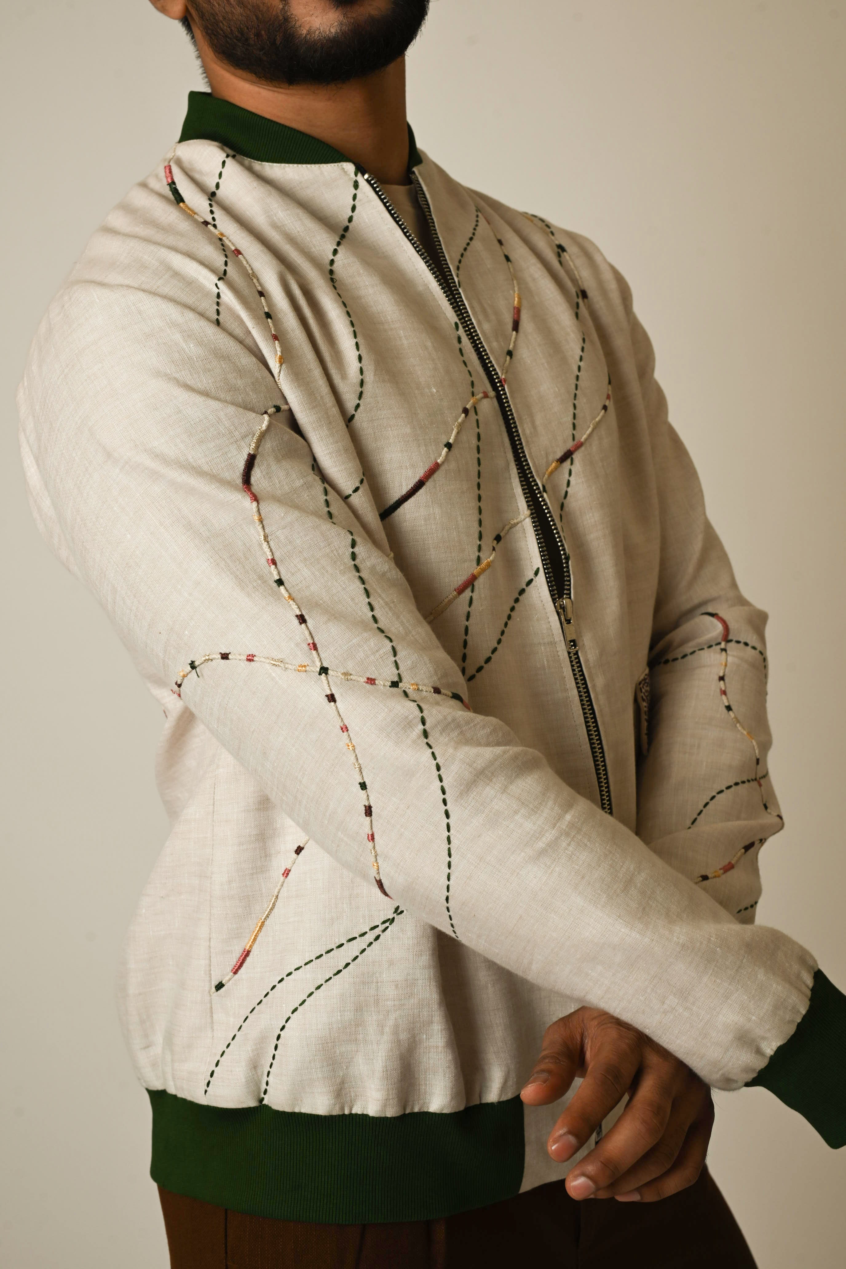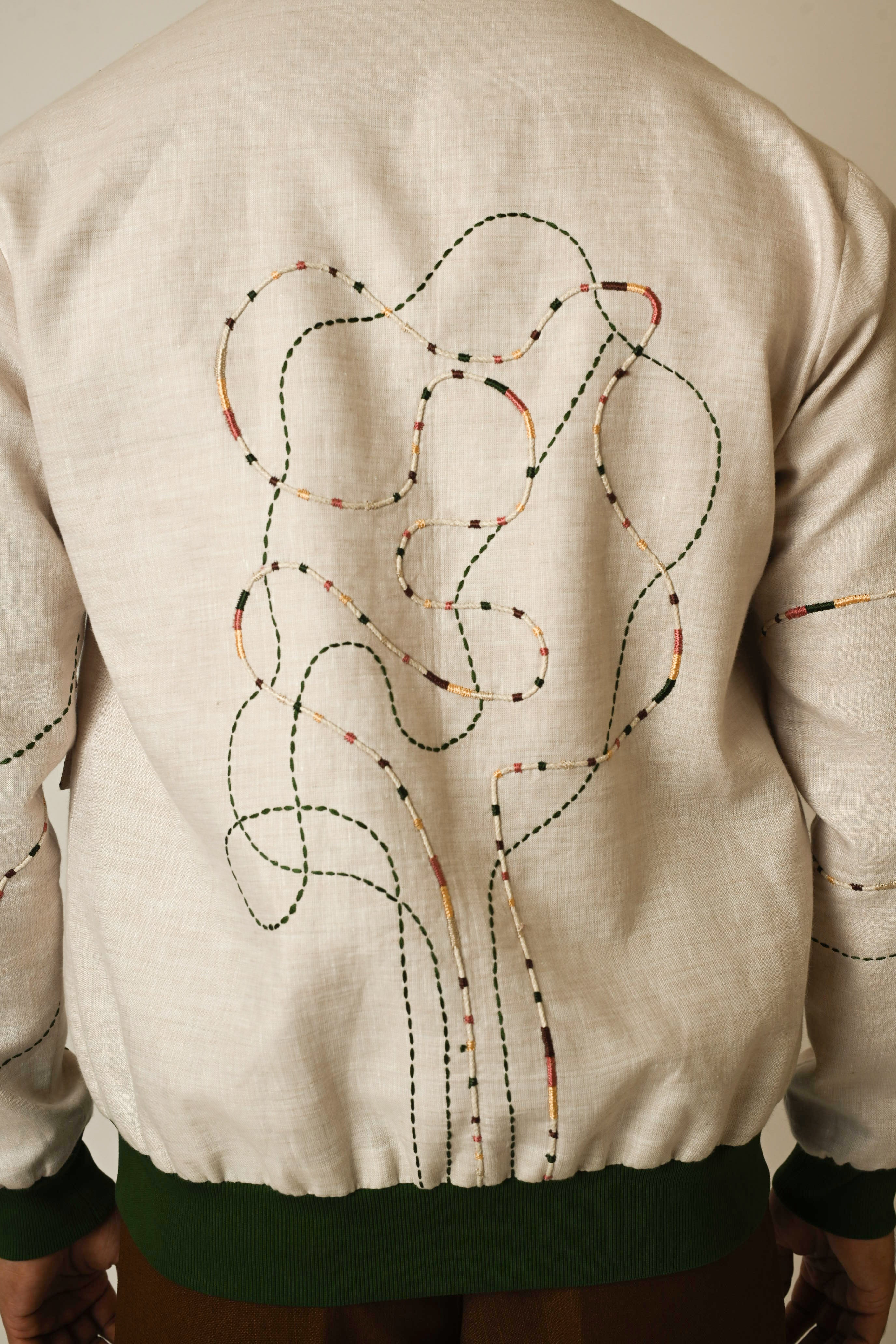 A dusty linen bomber jacket with line embroidery using techniques of threadwork to amp up the look we have used some show buttons