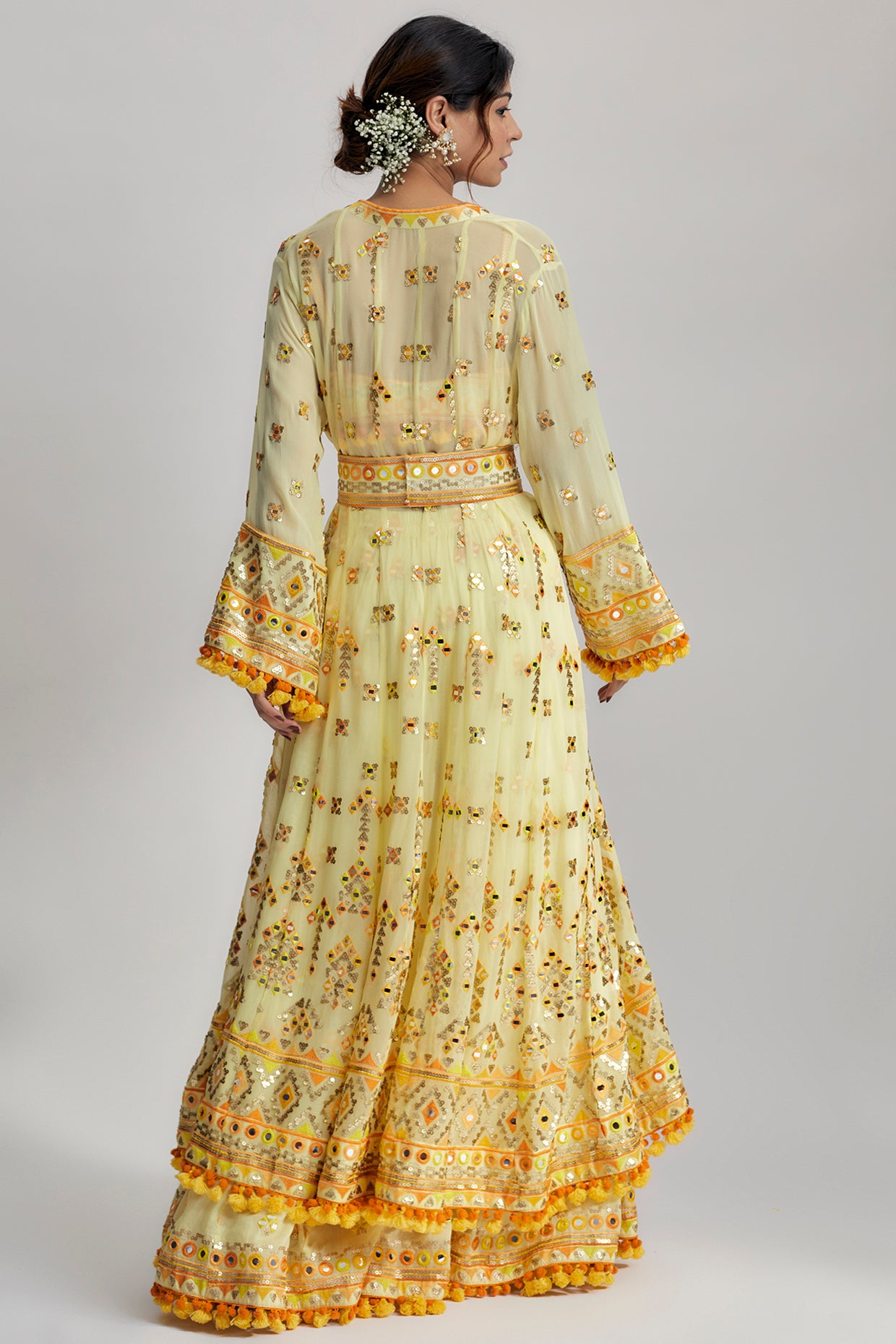 The combination of the mirror work, pompoms, tassels, embroidery, sequins, and colorful fabric creates a truly glamorous ensemble that is perfect for a wedding ceremony. The Mitali Jacket set with the Victorian Skirt exudes beauty, grace, and charm, making you feel like the belle of the ball. Prepare to captivate hearts and leave a lasting impression on your special day with this mesmerizing attire.