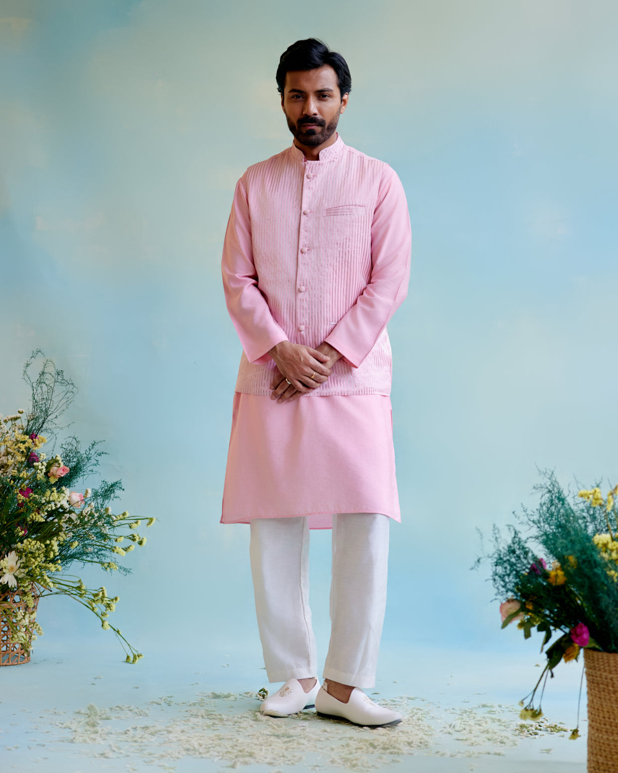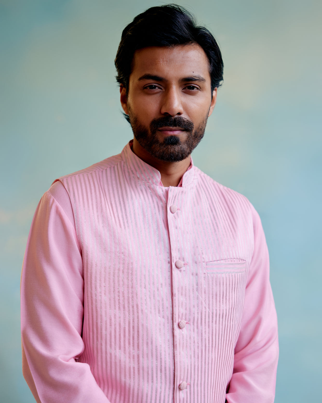 -Men's Nehru Jacket in Rosy Glow in Stripe tissue fabric.
