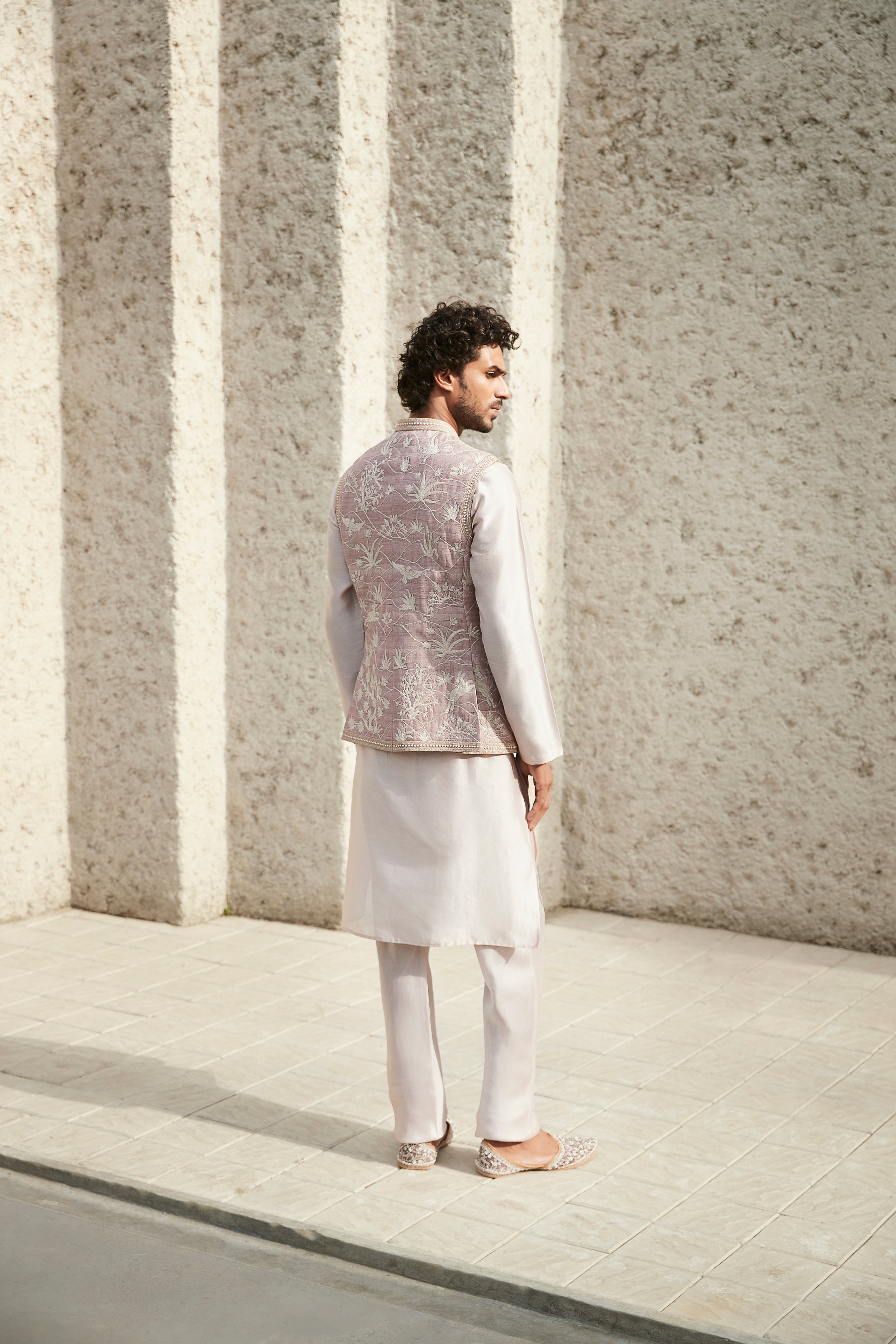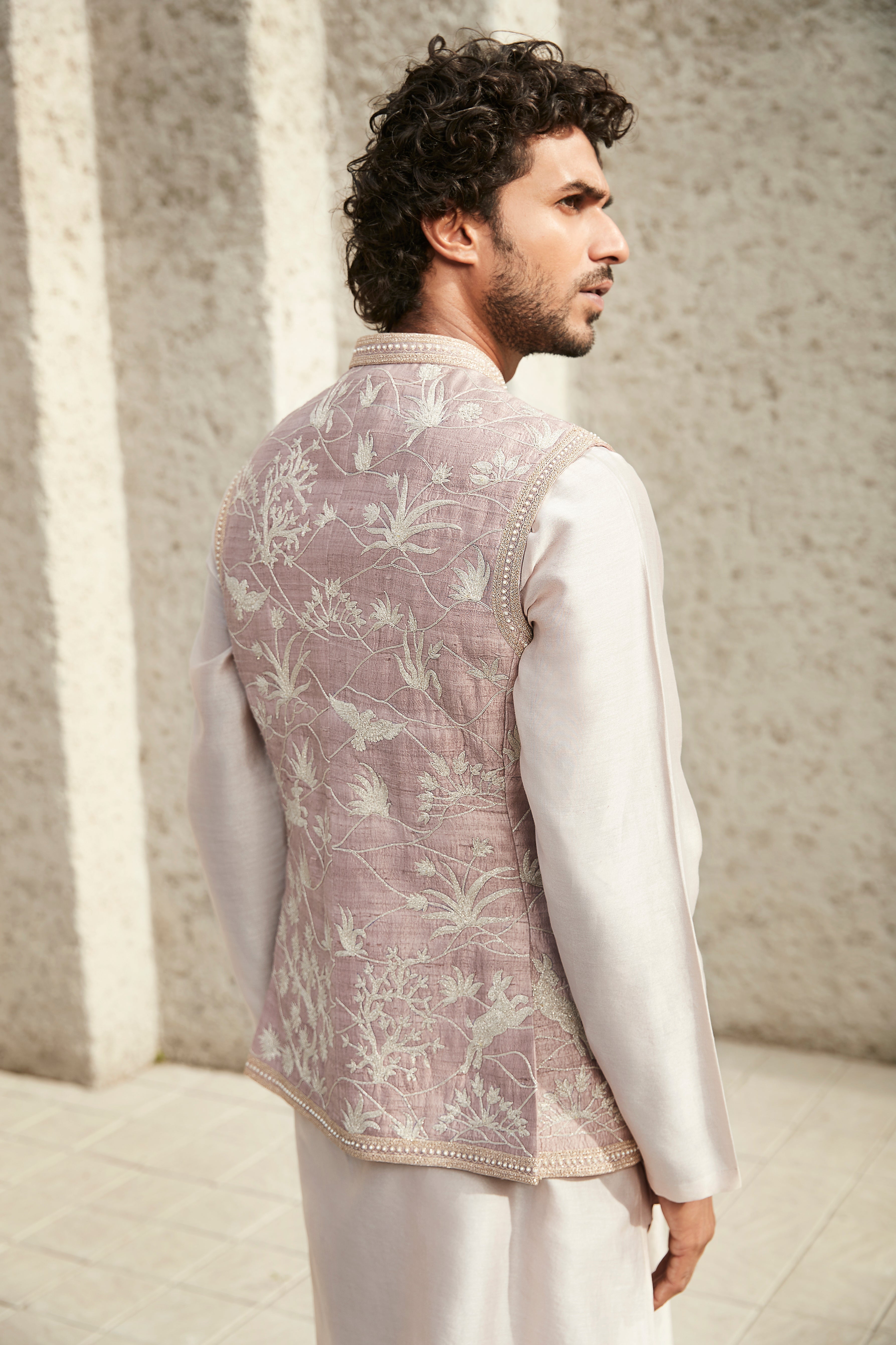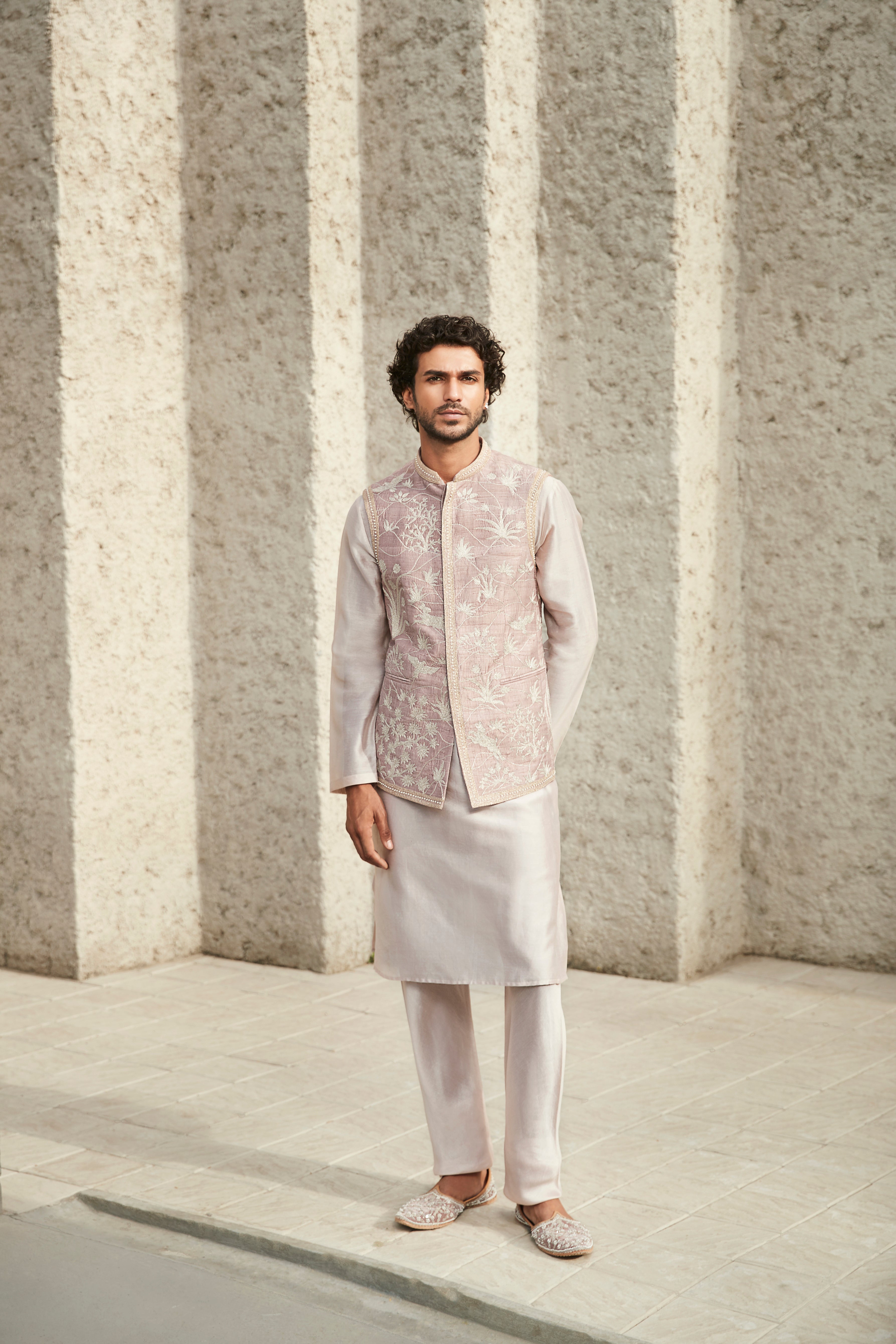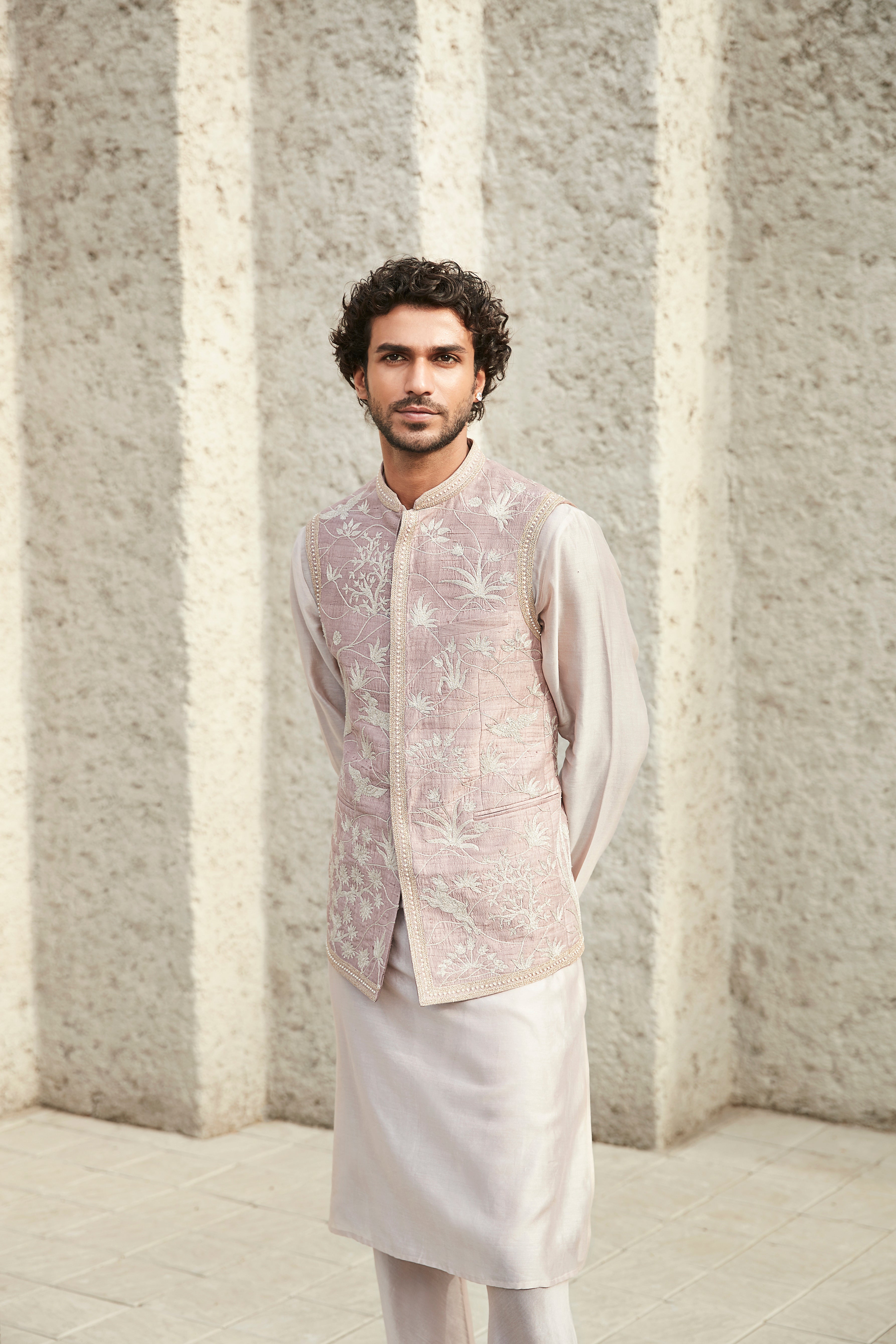 Delicate and dapper, our pink embroidered jacket is crafted in luxe raw silk and is a versatile ethnic wardrobe addition! Spotlighting exceptional crafts like dori work with siver zari thread and hand-work pearl accents, it makes the perfect layer for our pink embroidered kurta set or other ethnic separates from your closet.