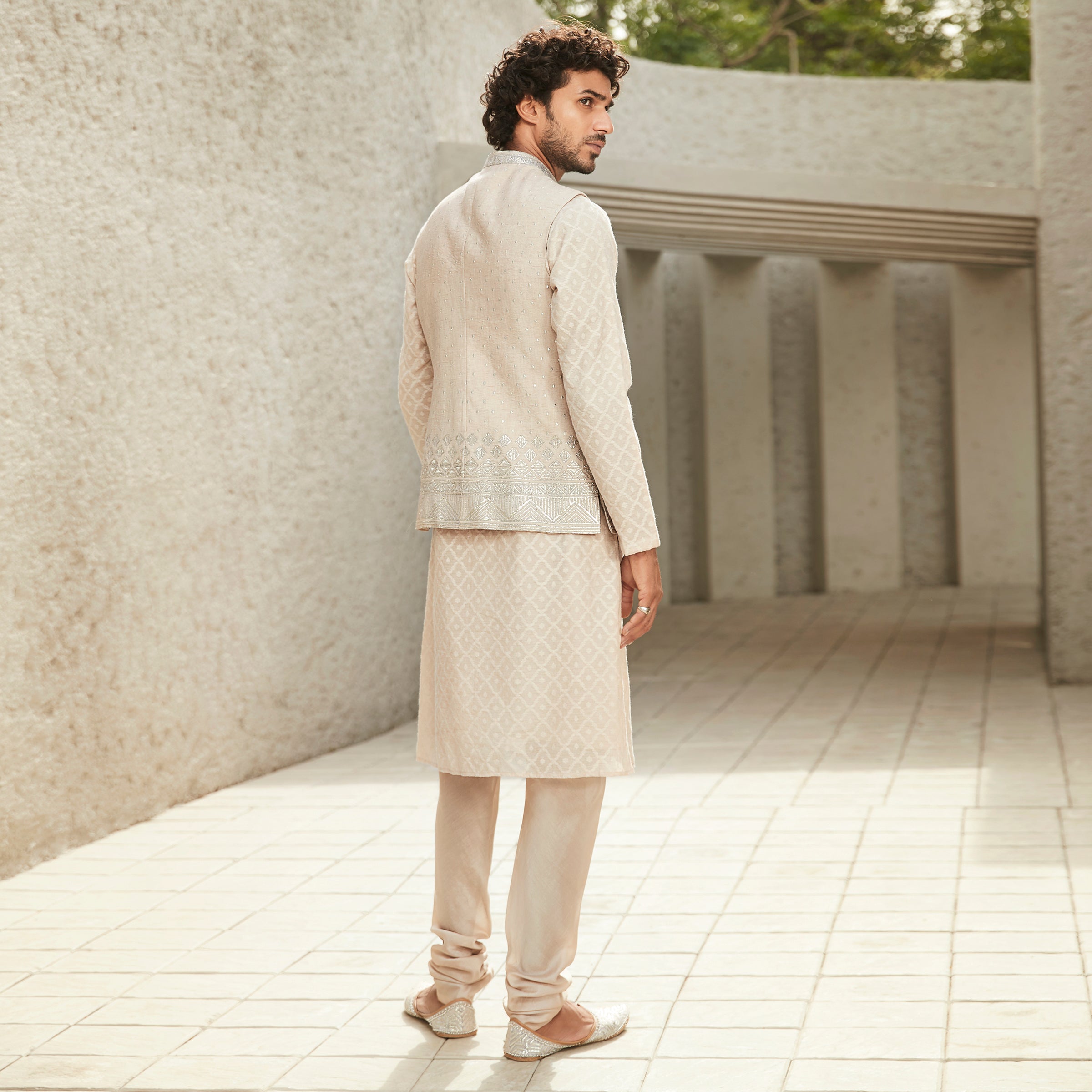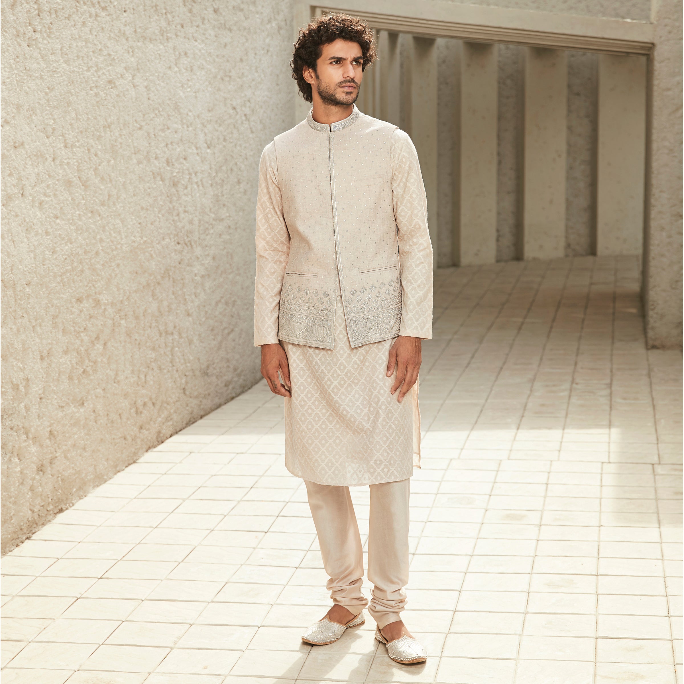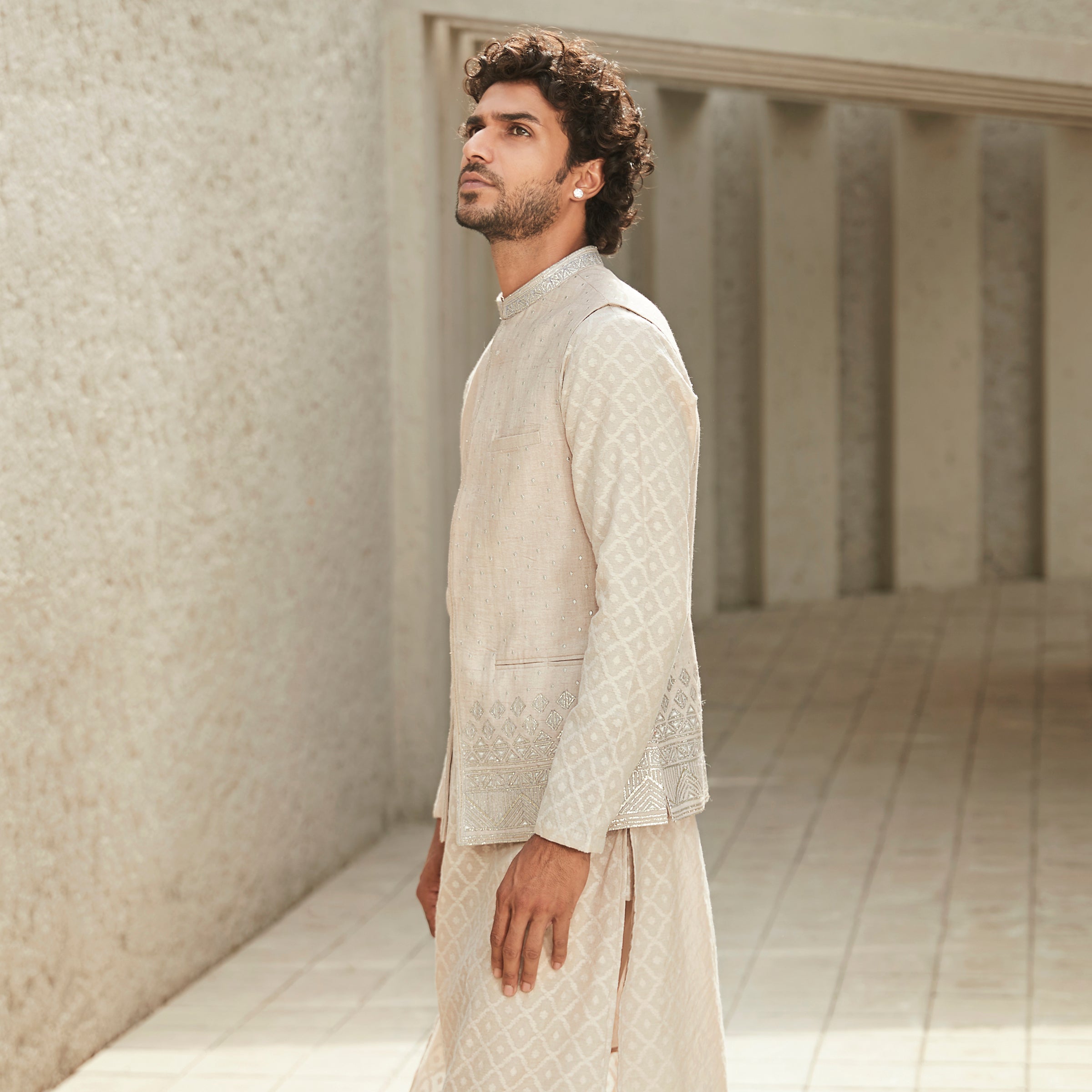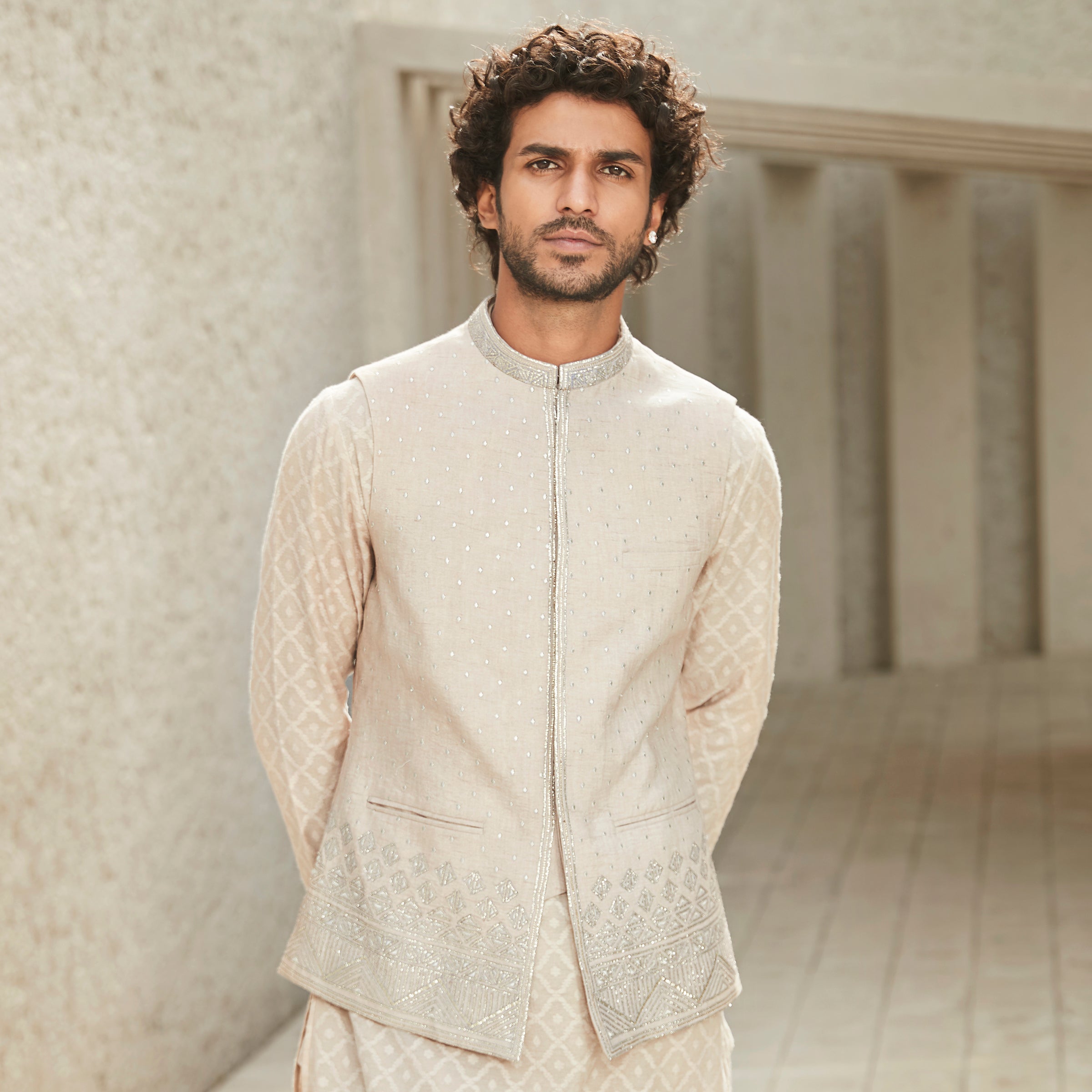 With an understated and unmatched appeal, this off-white Jodhpuri jacket from Heritage Pret '23 is meticulously crafted in raw silk, with a delicate texture and zari threadwork. The artisanal separate is rooted in Indian culture and made for the man of today who shares similar sensibilities.