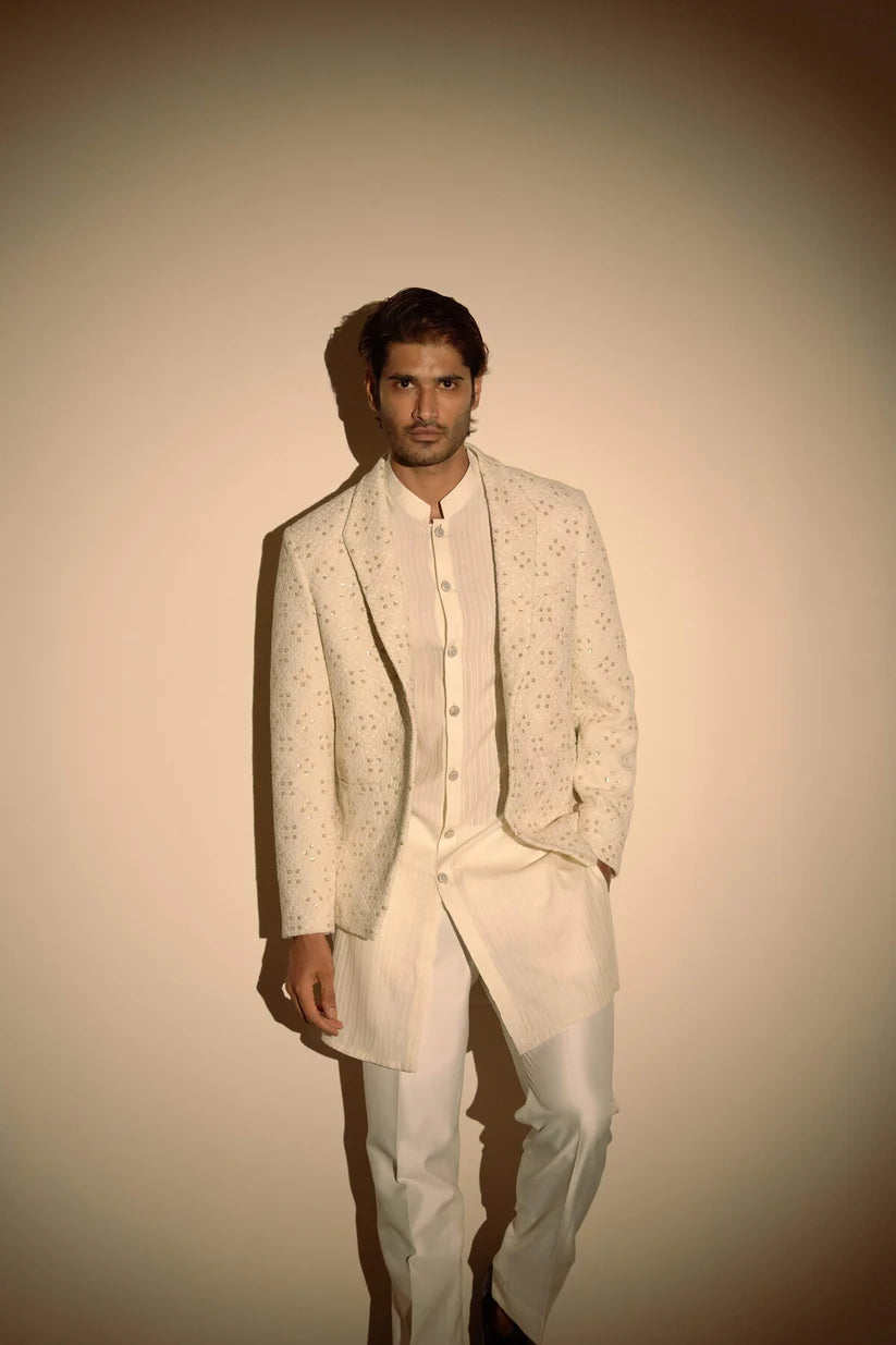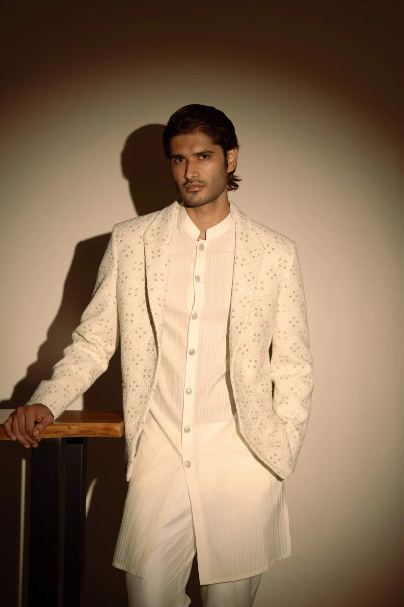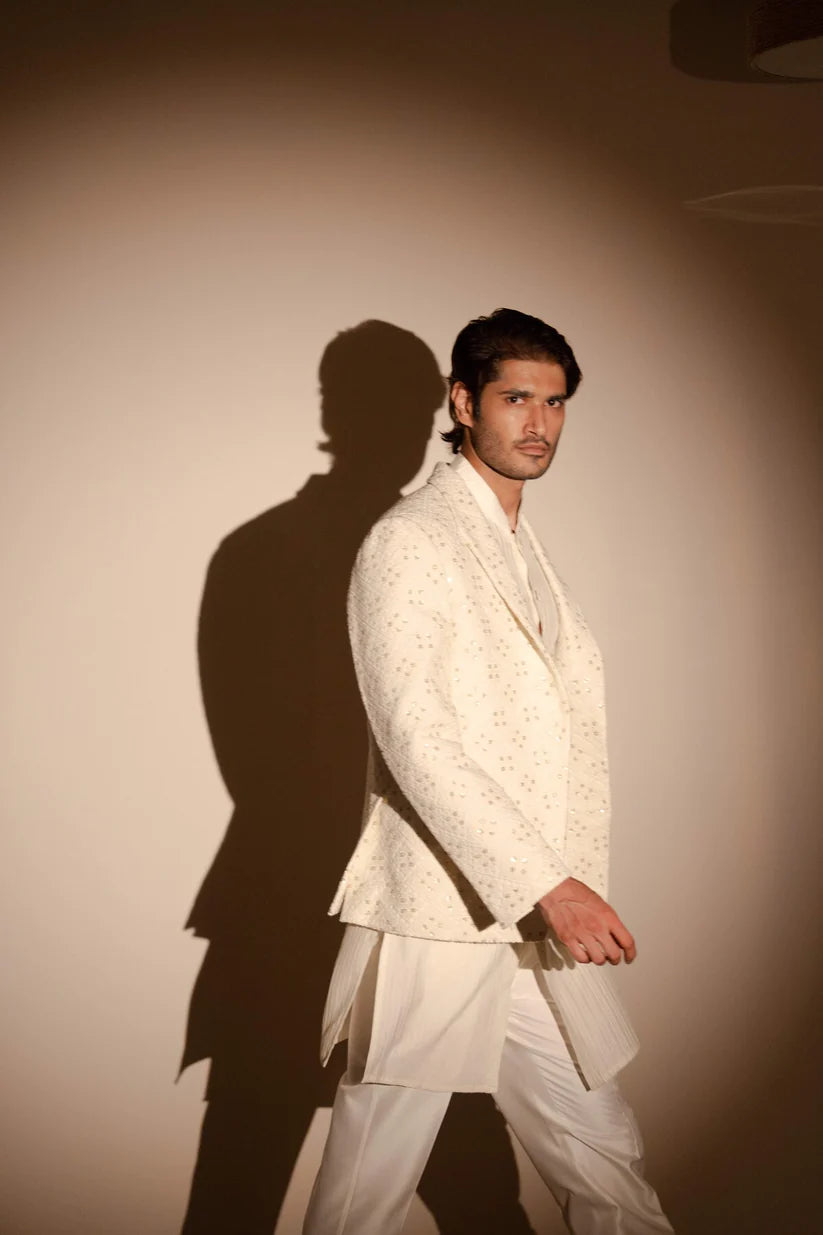 White pintucks kurta set with chikankari jacket