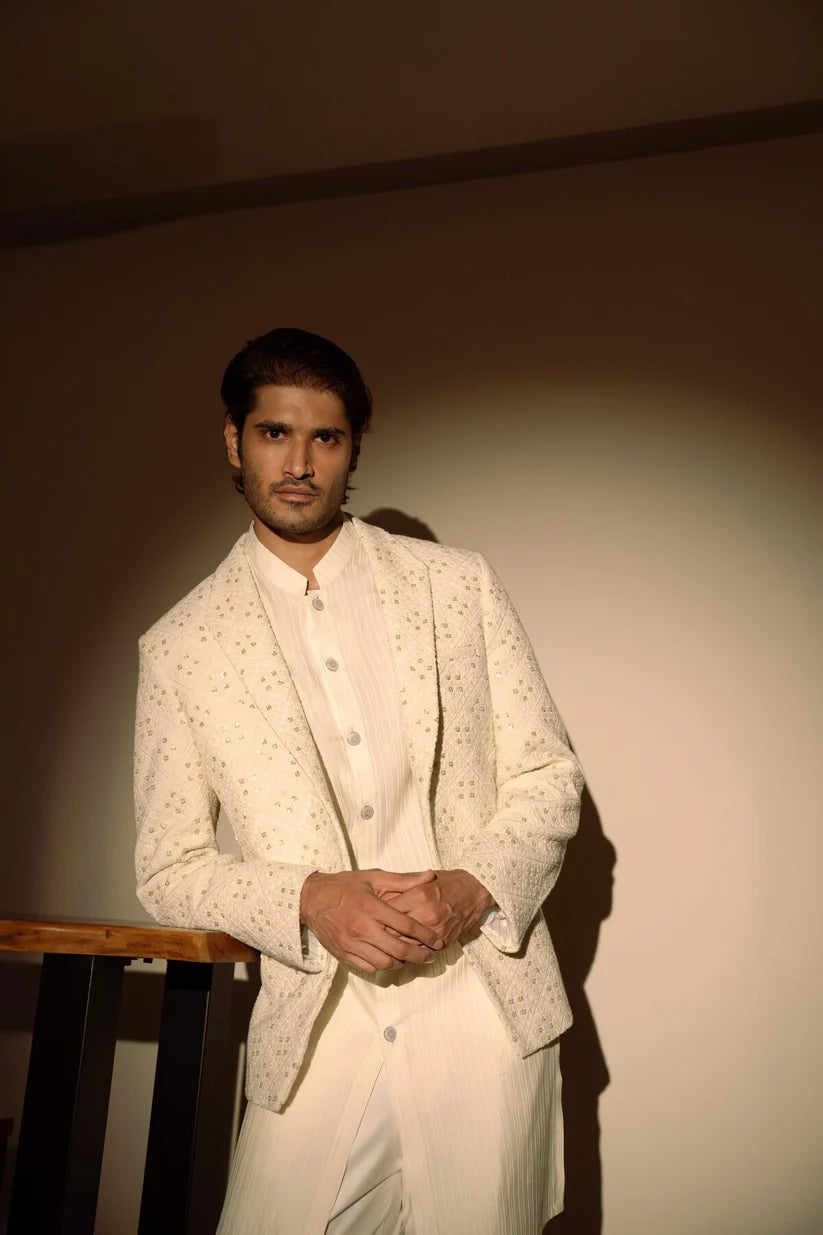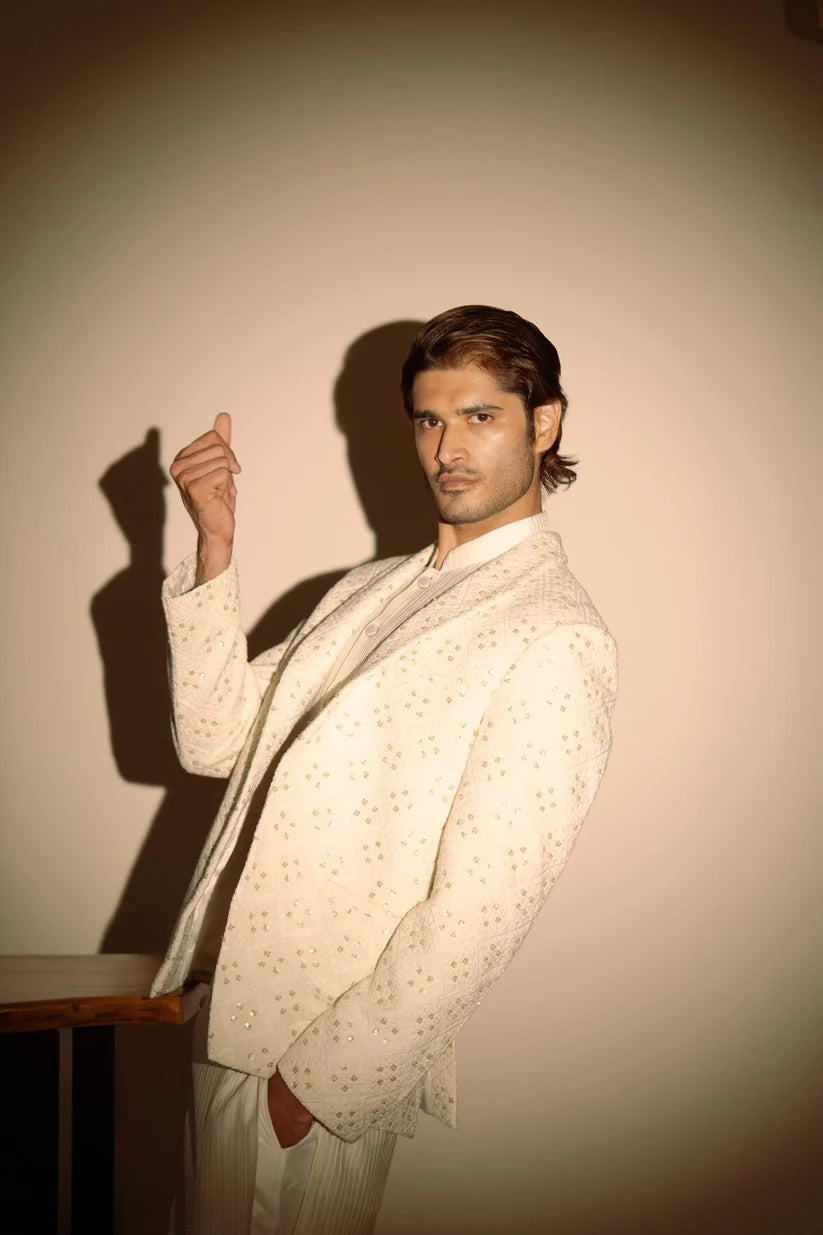 The highlight of this ensemble is the Chikankari jacket, adorned with intricate hand embroidery. The Chikankari work, renowned for its delicate threadwork and intricate motifs, adds a touch of timeless beauty to the jacket. Each stitch is a testament to the skilled craftsmanship and attention to detail, creating a masterpiece that exudes grace and sophistication.