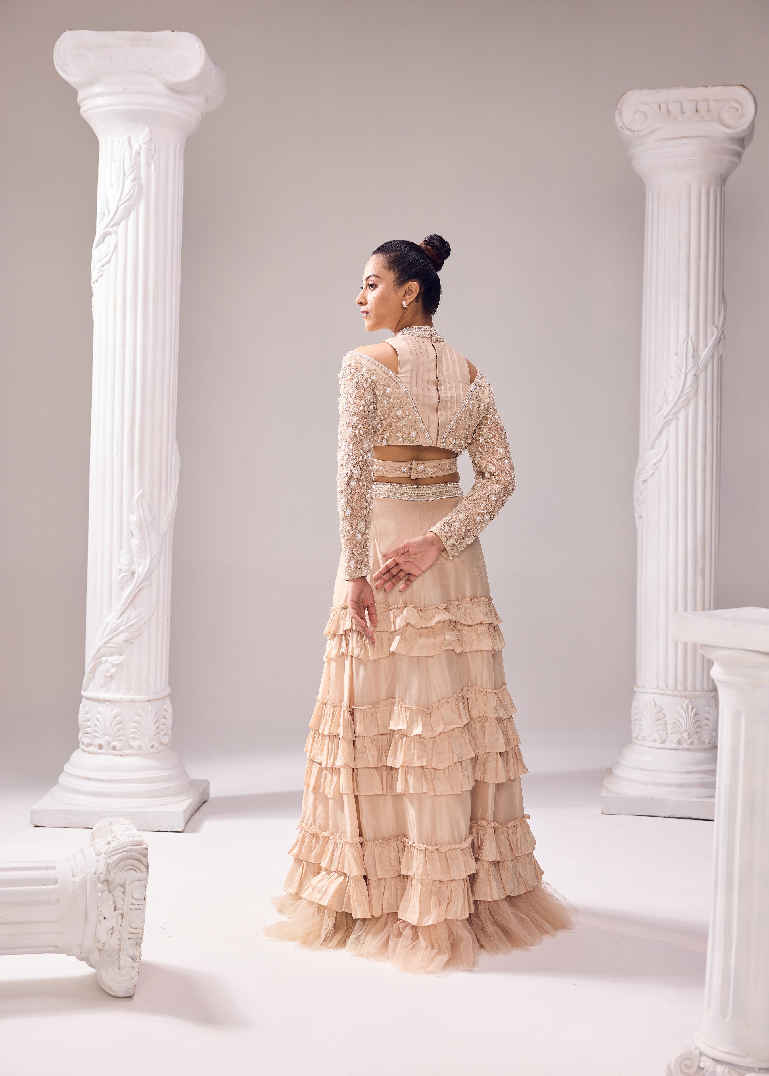 The skirt has a three tier ruffle detail complemented with a net ruffle at the bottom. The blouse has a halter neckline with a meticulously embroidred sleeves. The ensemble is adorned with pearl and katdana intricate aari work.