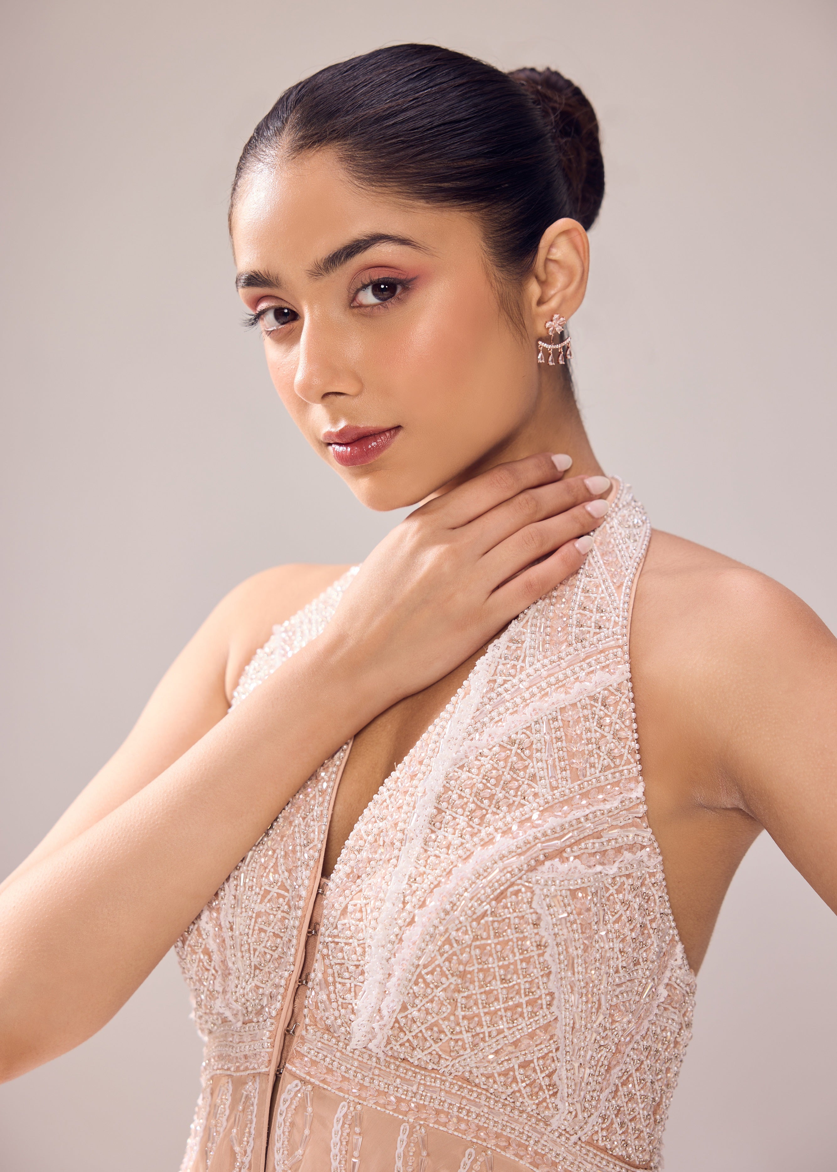 | The subtle colour palette on the crepe fabric is a delight for the eyes. It features our intricate garment construction and is further engineered with detailied pearl and lace embroidery. Adding a biased-cut dupatta gives it the traditional twist. |