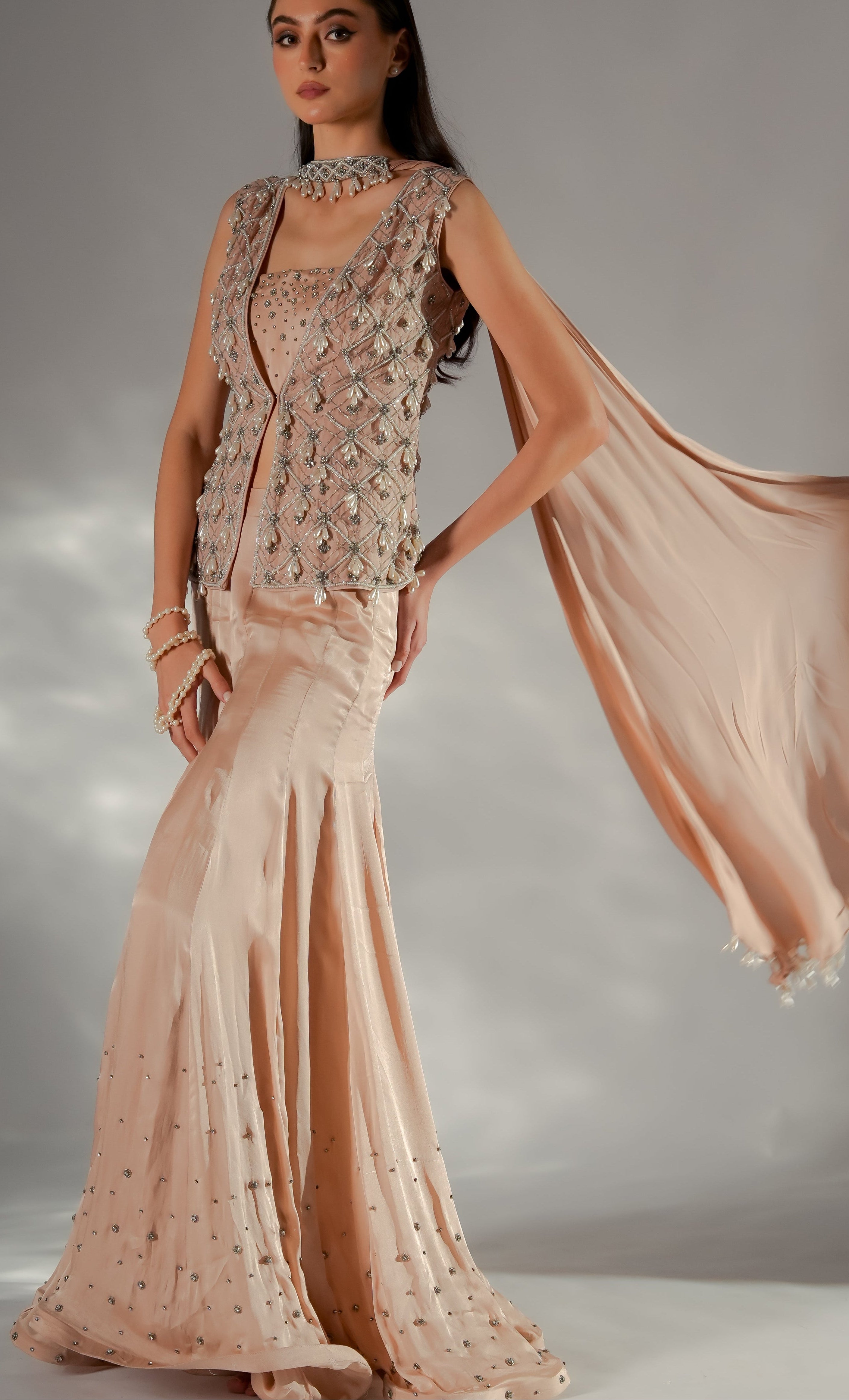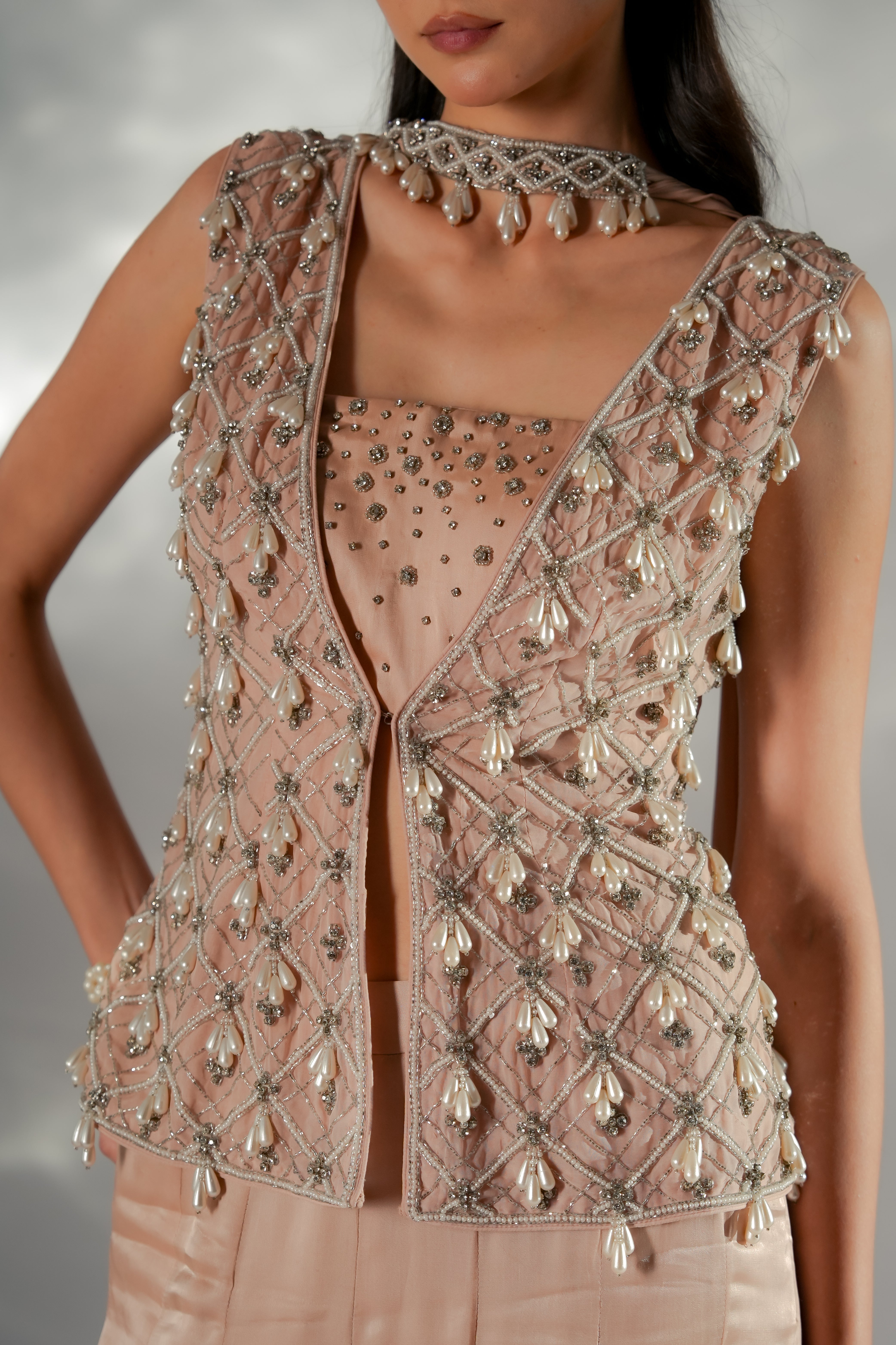 | A statement pearl and stone embroidered jacket paired with a sleek tube blouse and a flowing Kali sharara. The sharara features delicate bootie embroidery near the hem, adding subtle detail and elegance, while the jacket is finished with hanging pearl accents that bring movement and a touch of glamour to the ensemble. |
