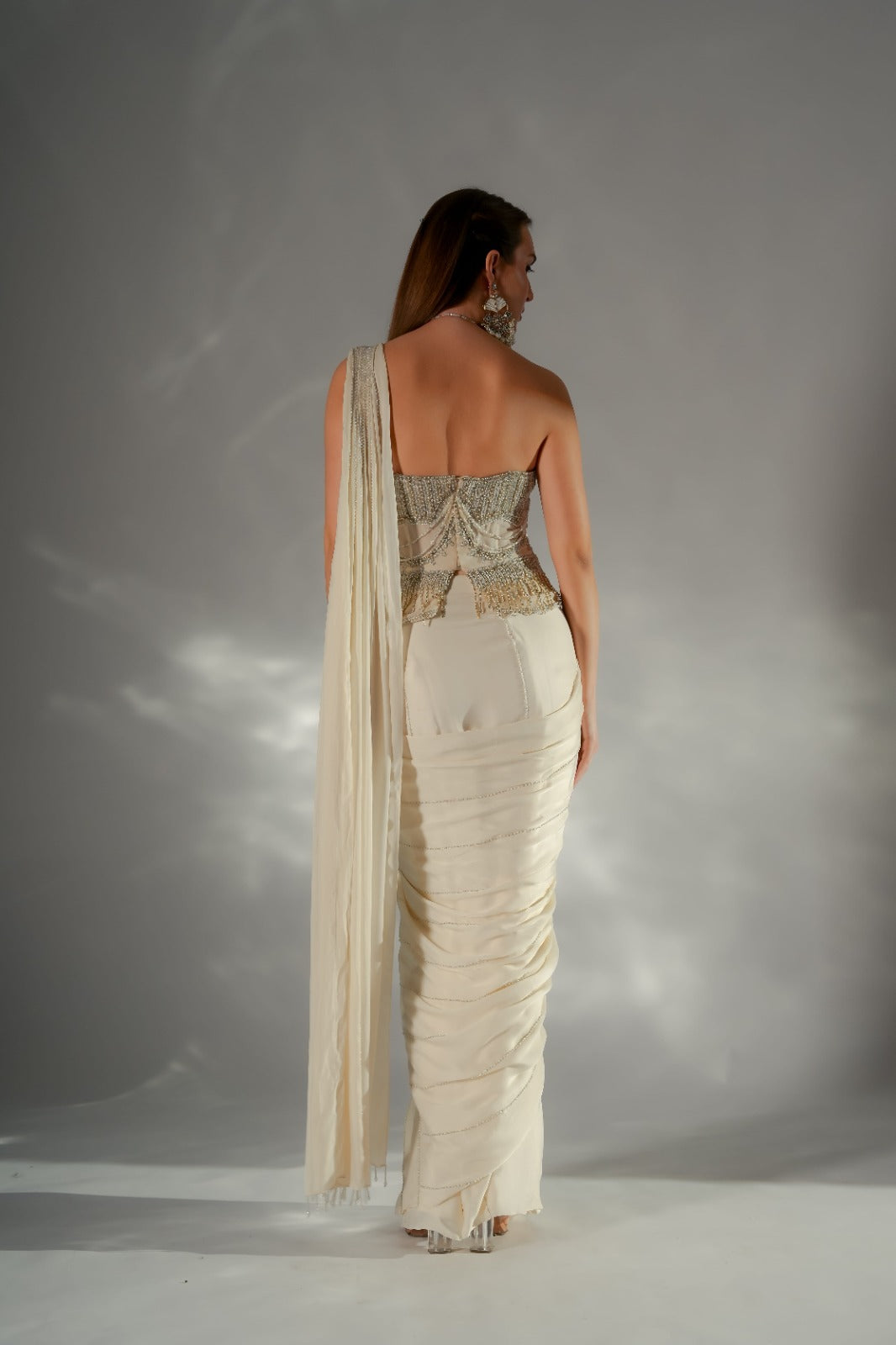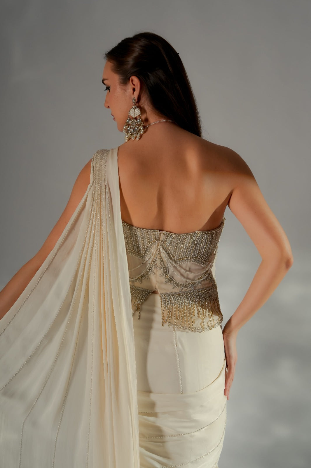 | An elegant off-white draped saree paired with a sheer corset blouse that features a transparent panel at the waist. The corset is adorned with delicate hand embroidery of pearls, metal elements, crystals, and silver stones, while the saree is finished with a refined embroidered border along the edges, creating a timeless and sophisticated look |