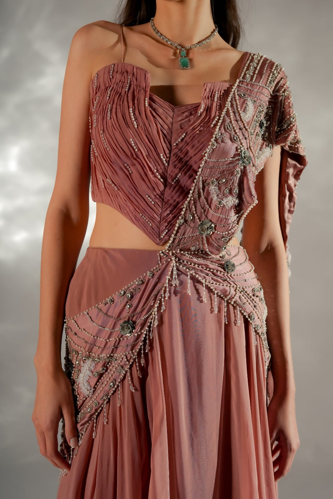 | A statement draped saree with voluminous pleats supported by can-can, paired with a ruched organza corset blouse. The look features a hand-embroidered hip cowl that extends into a dramatic floor-length pallu with soft ruffles, adorned with intricate pearls, crystals, kardana, and silver stones, creating an elegant couture silhouette |