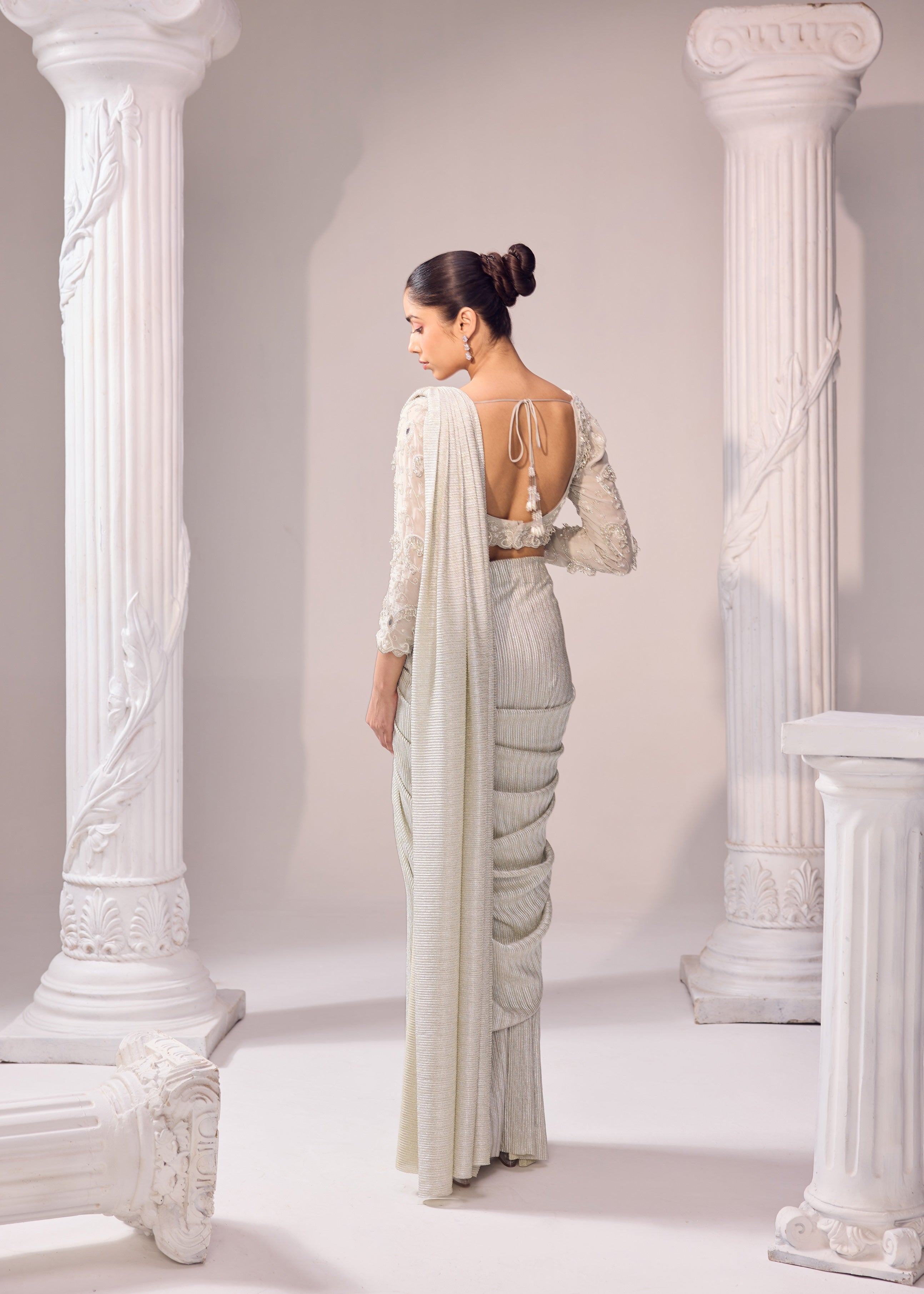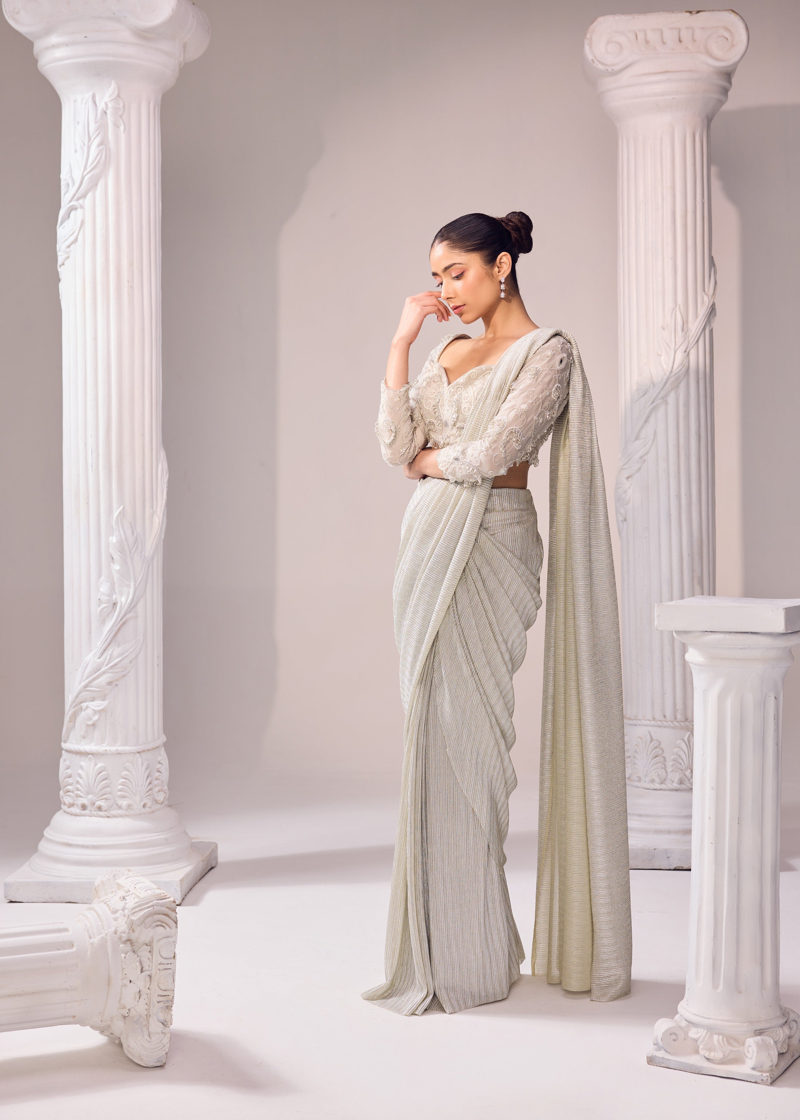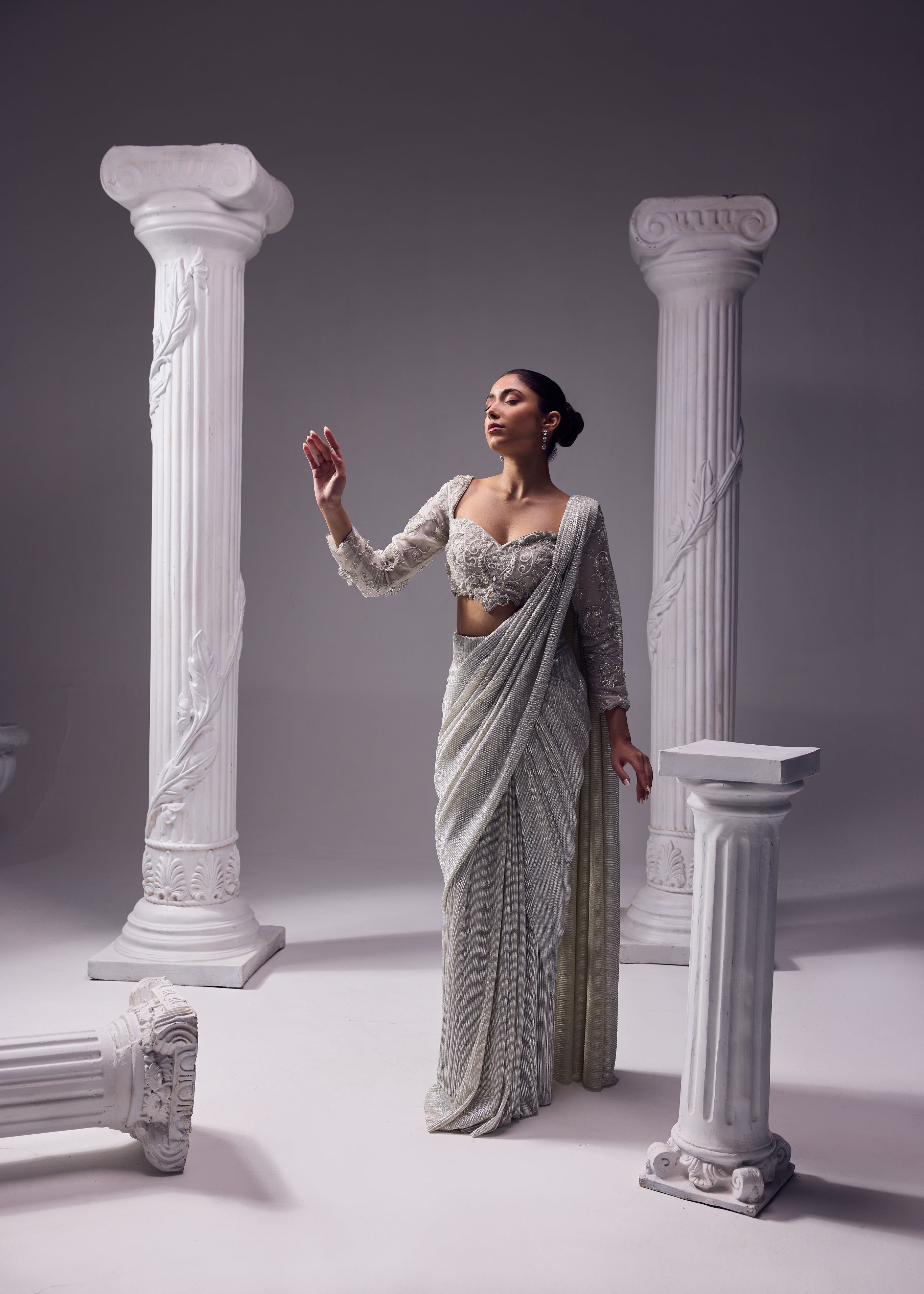 An artistic symphony of fine aari embroidery adorns the blouse with full sleeves. It has 3D katdana loops, this unreal detailing enhance the ethreal look of the outfit.