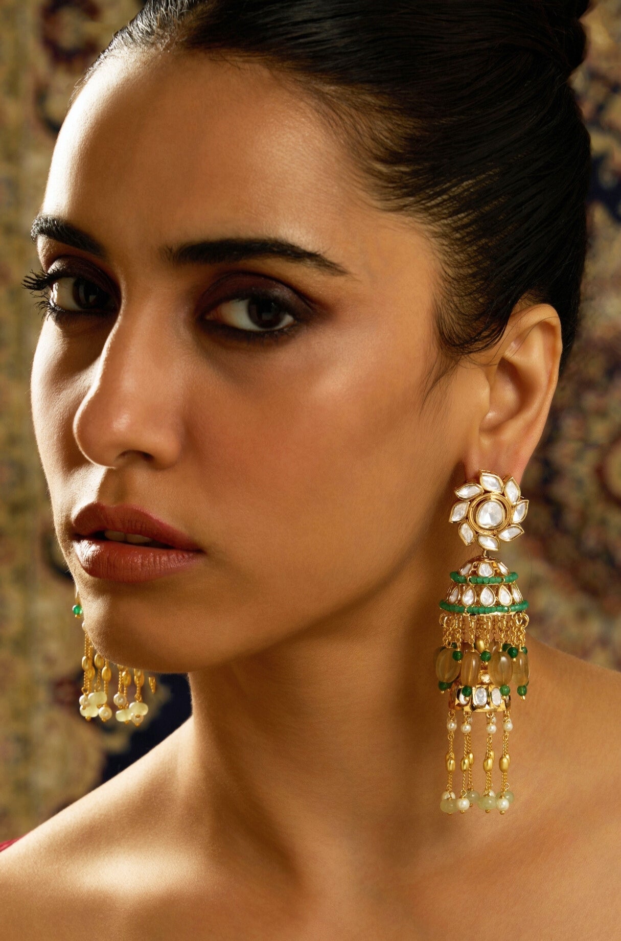 Designed To Accentuate Long Necks, The Elara Longline Jhumka Features A Slender Silhouette With Intricate Detailing. Crafted In Gold With Delicate Motifs, This Piece Is Perfect For Adding A Touch Of Regal Sophistication To Festive Or Bridal Looks. The Extended Length Offers A Graceful Drape, Enhancing Your Elegance With Every Movement.