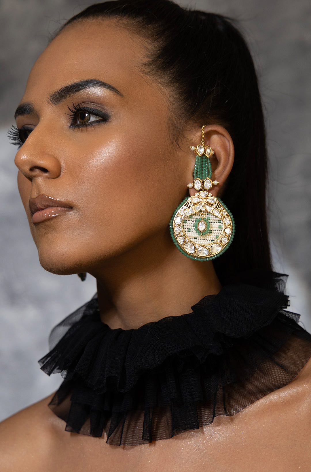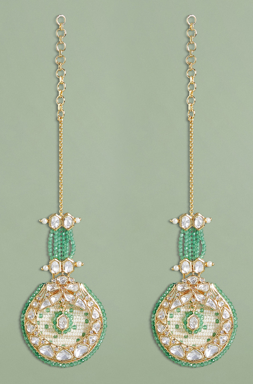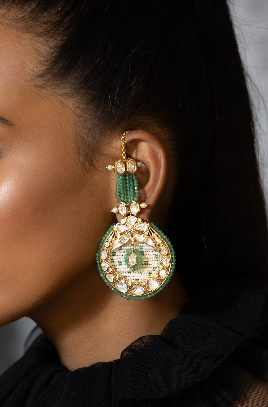 Radiate elegance with our 22Kt Gold Plated Earrings, designed for weddings, parties, festivals, or personal milestones. The enchanting hydro polkis, lustrous  pearls, alluring agate beads, and captivating green jade stones create a harmonious blend of beauty. Embrace the allure of these exquisite earrings and make every occasion shine with your grace.