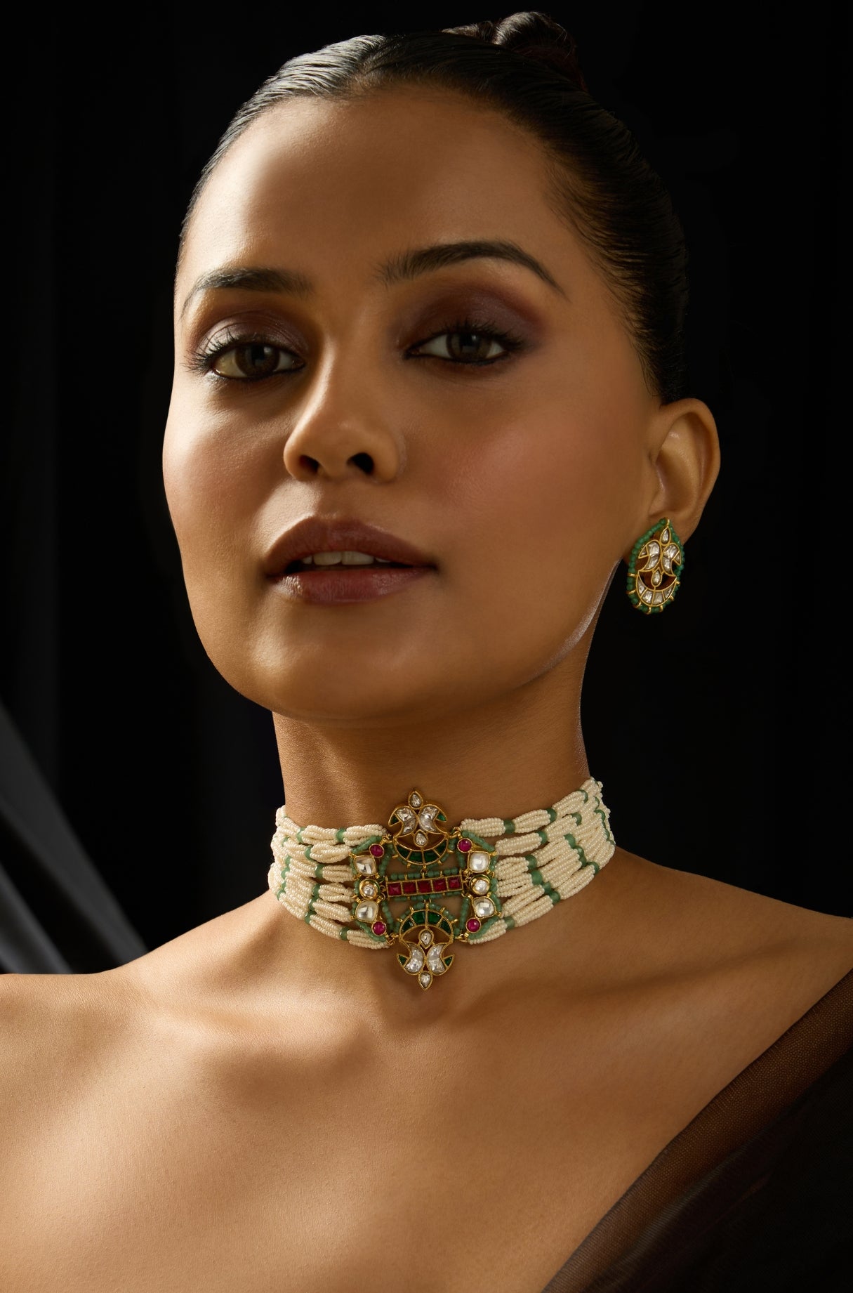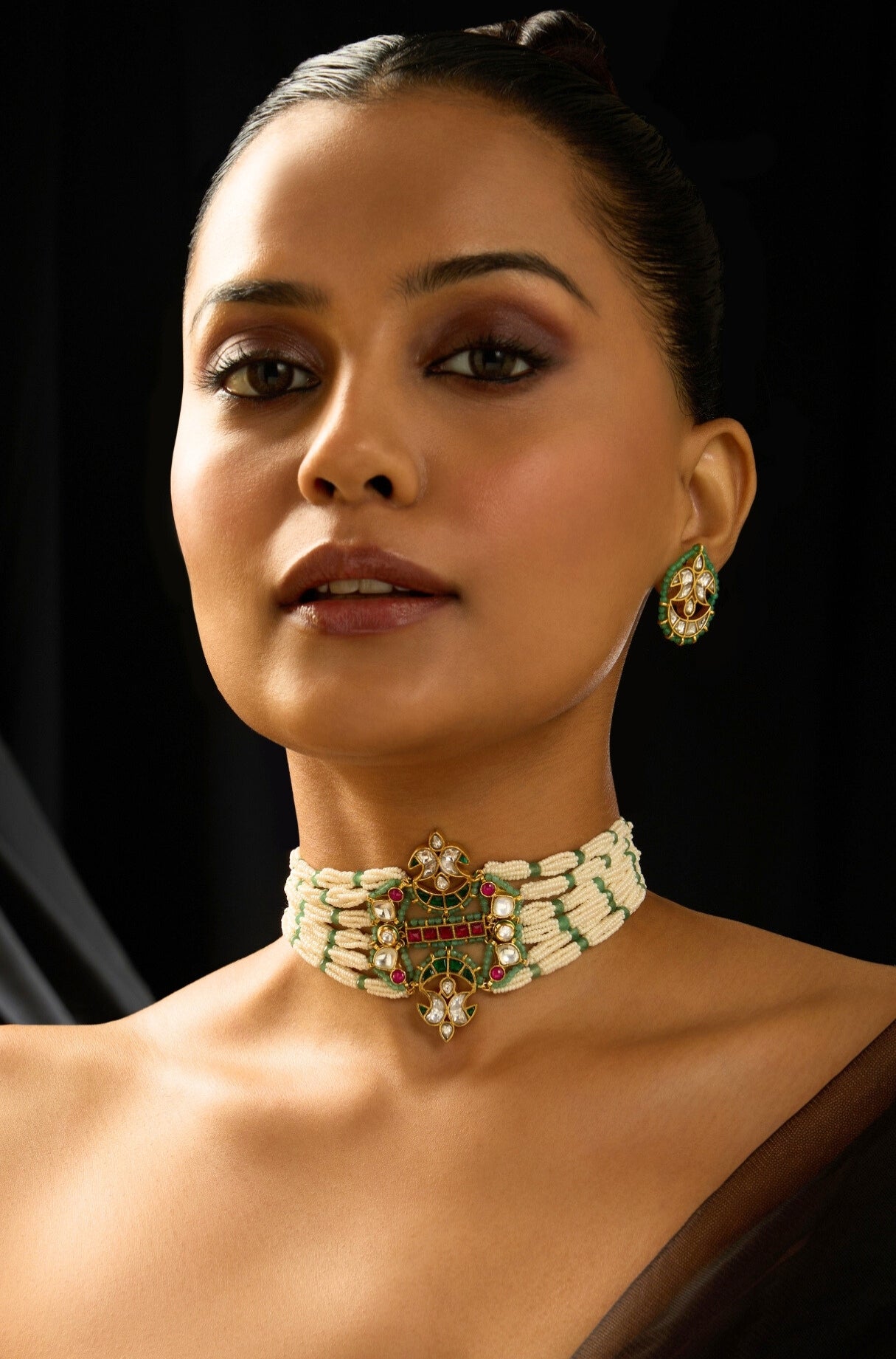 This Enchanting Choker Necklace Set Showcases Intricate Rajwadi Motifs, Elegantly Adorned With Lustrous Pearls. The Design Captures The Essence Of Traditional Craftsmanship, Blending Cultural Richness With Contemporary Flair. Ideal For Special Occasions Or Festive Celebrations, This Necklace Set Promises To Enhance Your Style And Add A Regal Touch To Any Ensemble.