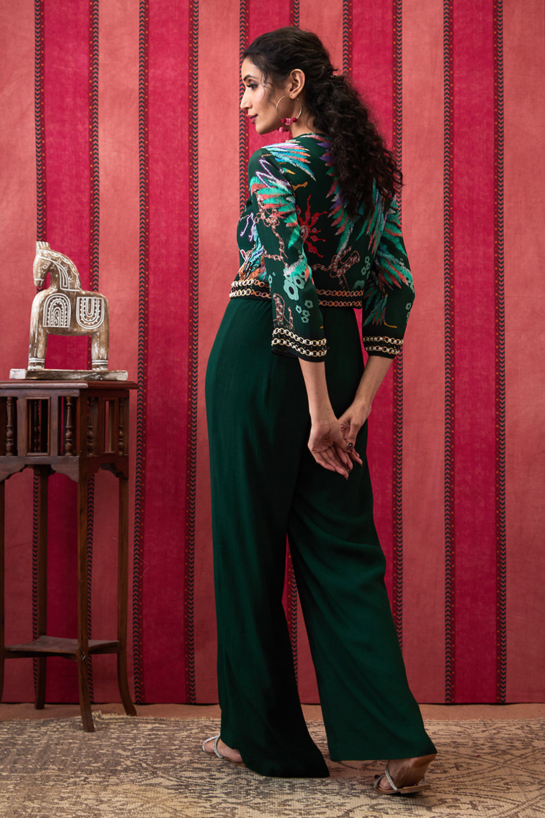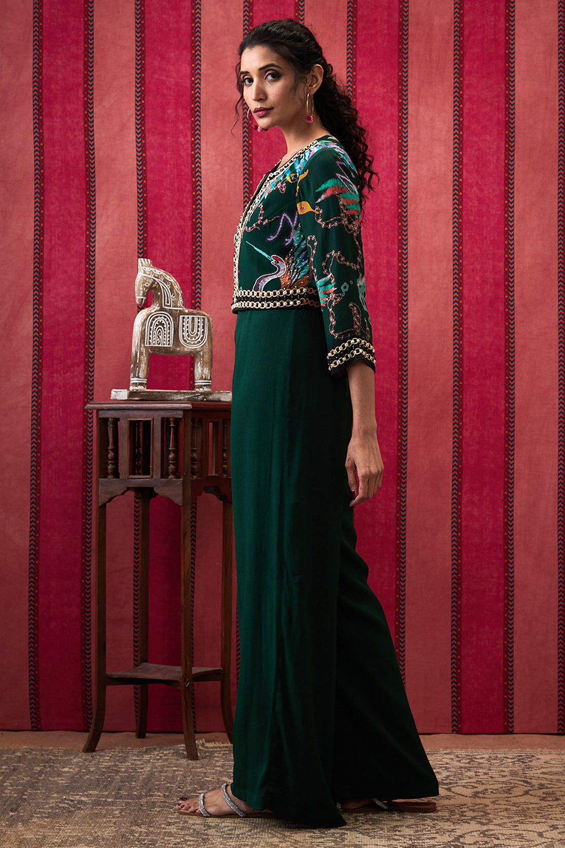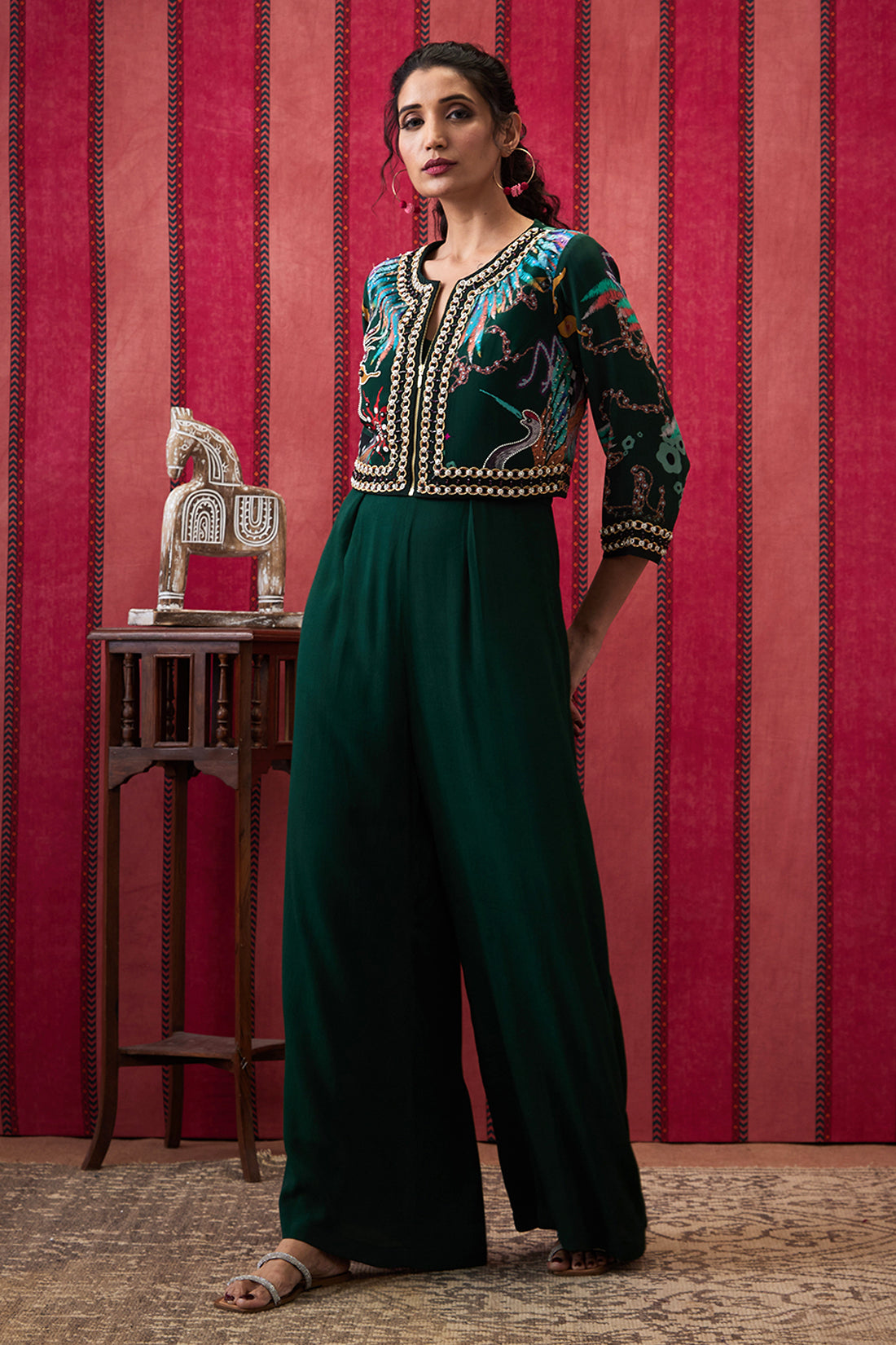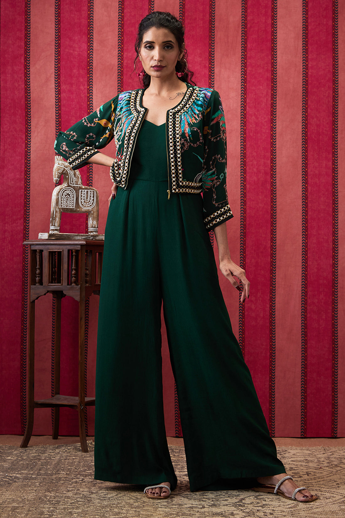 Featuring a Bottle green Jumpsuit in crepe fabric. It is paired with an embroidered jacket