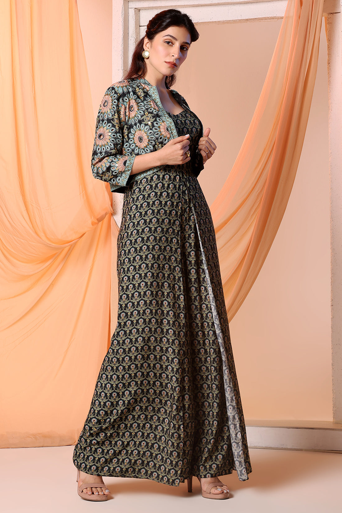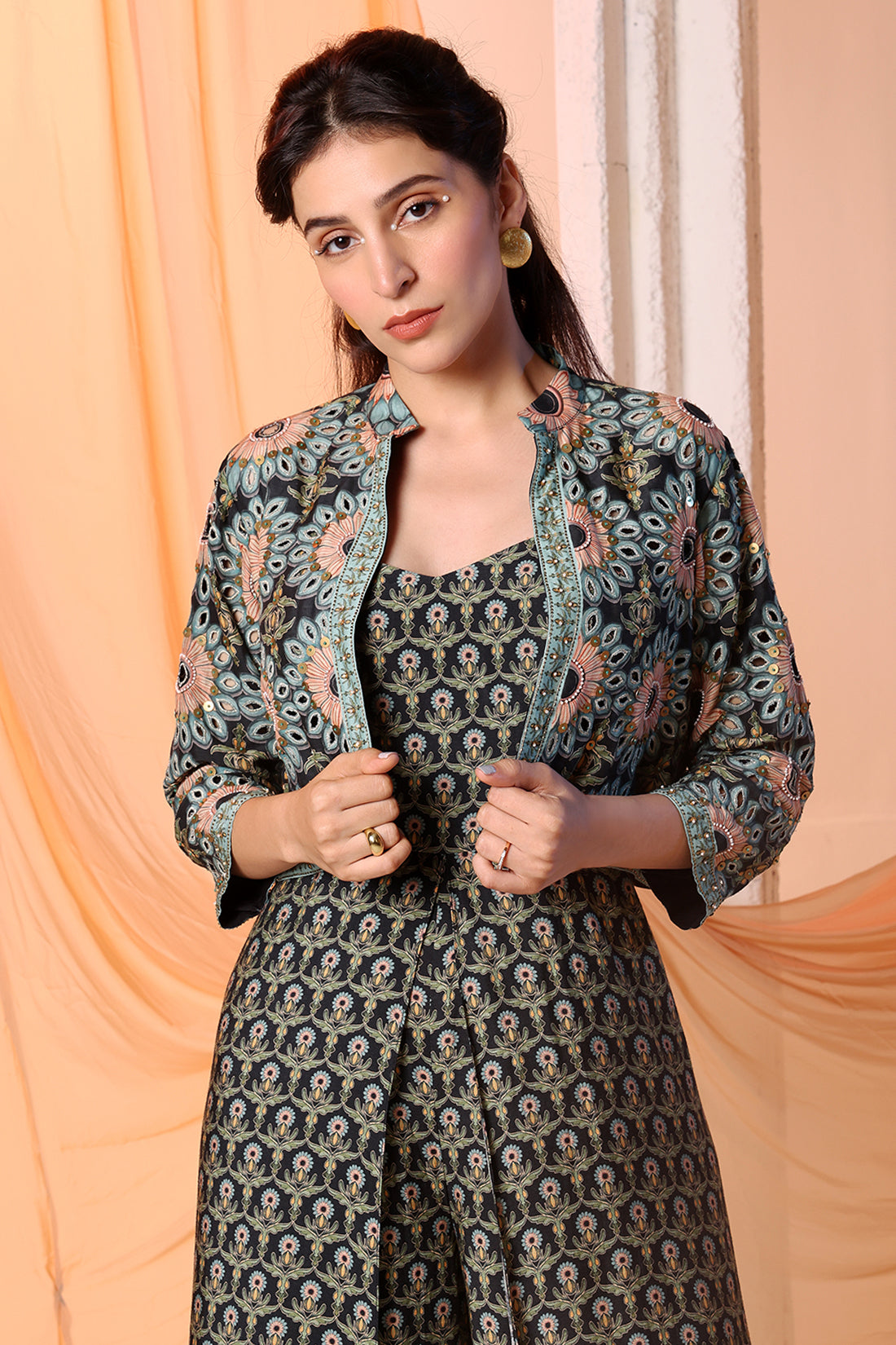 Black Eraya embellished linen crop jacket paired with a green printed jumpsuit.
