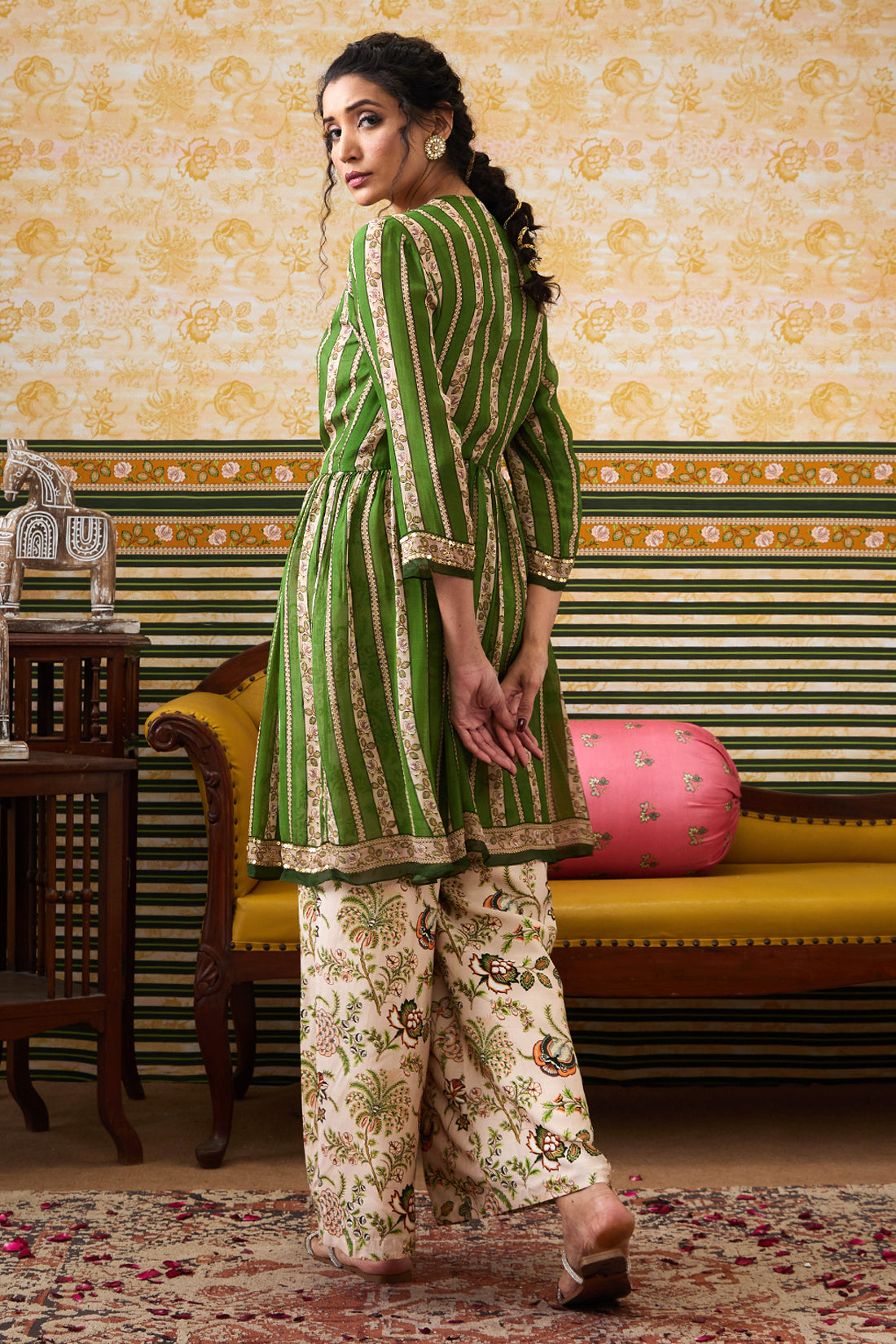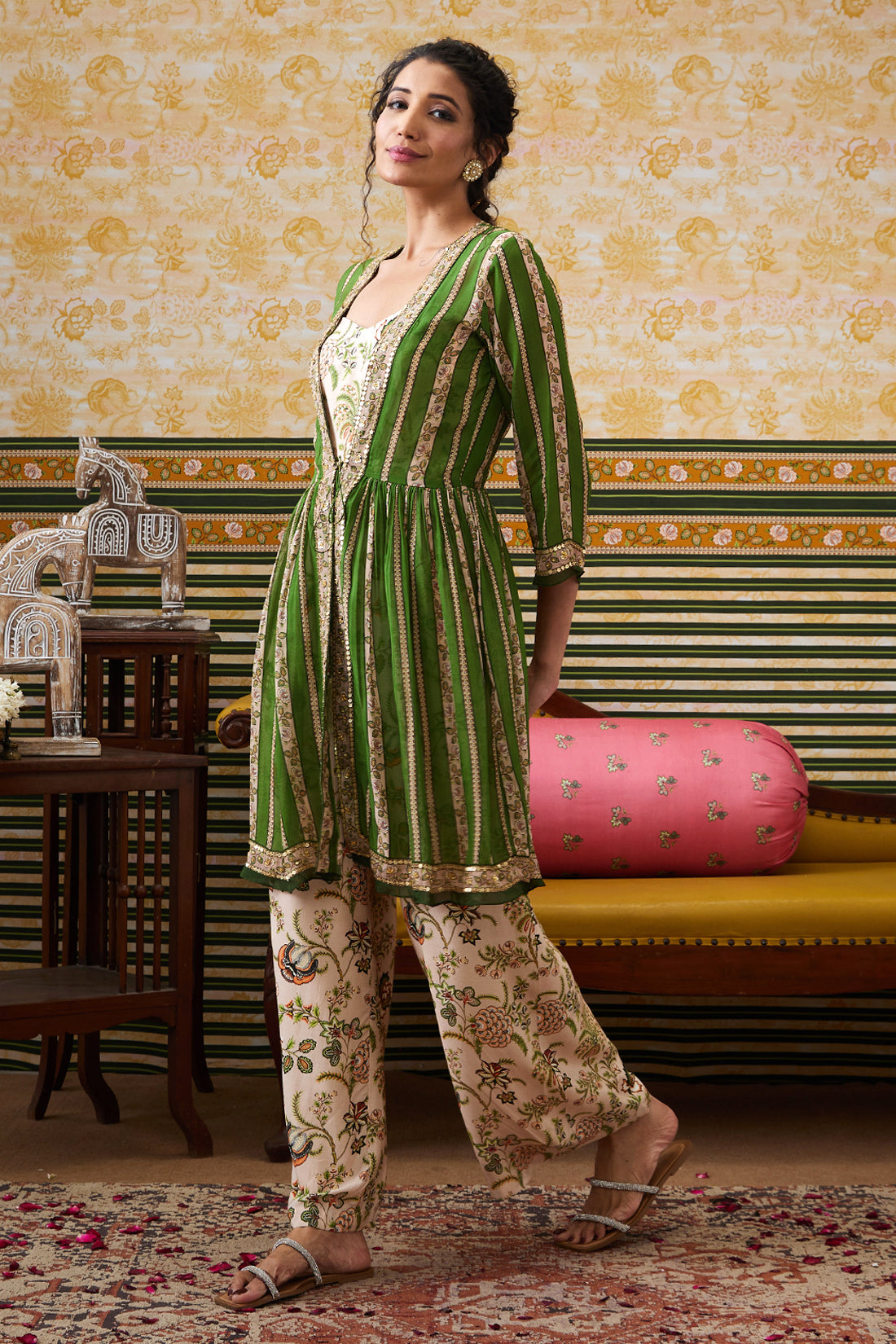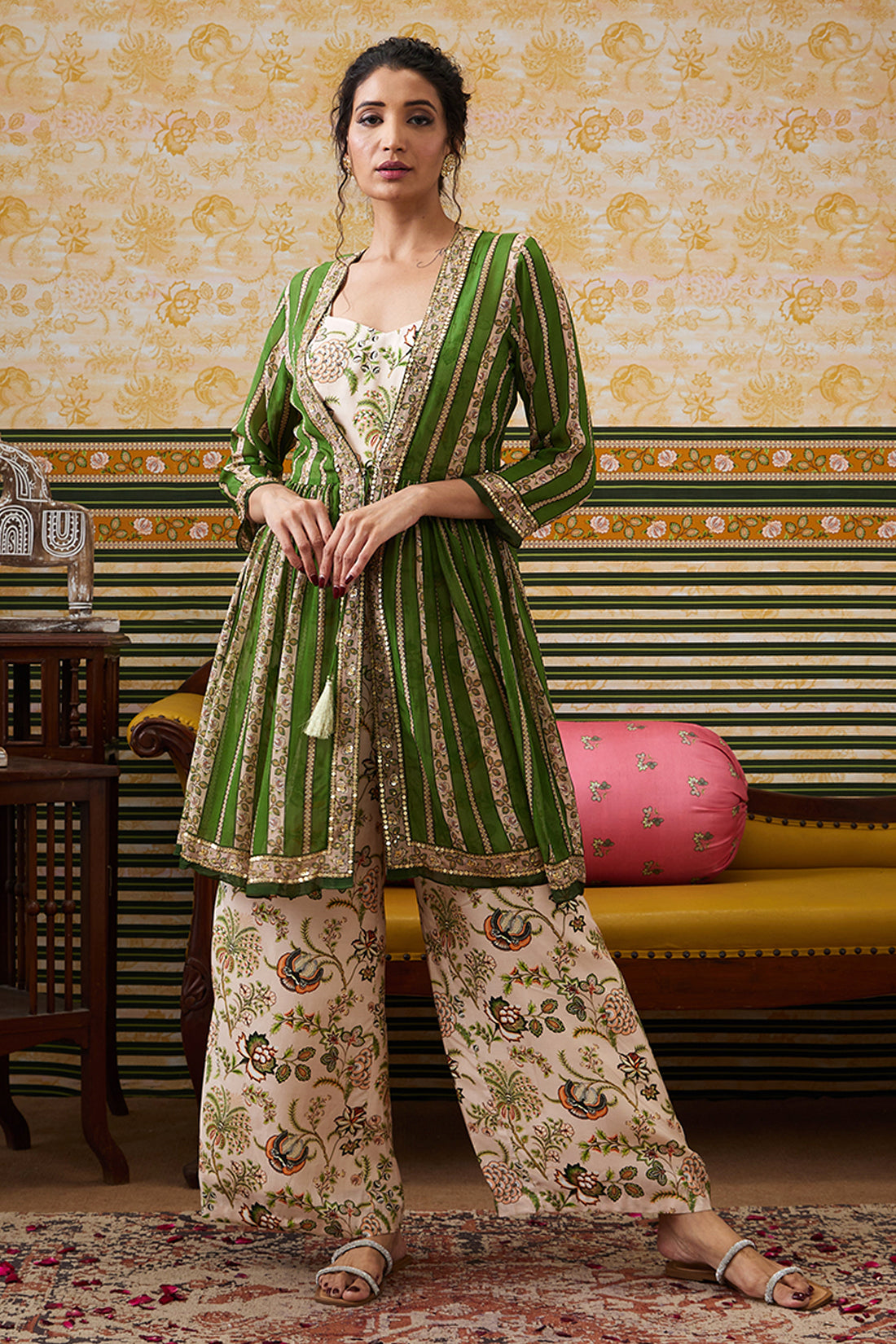 Featuring a green & beige Jumpsuit in crepe fabric. It is paired with an embellished top.
