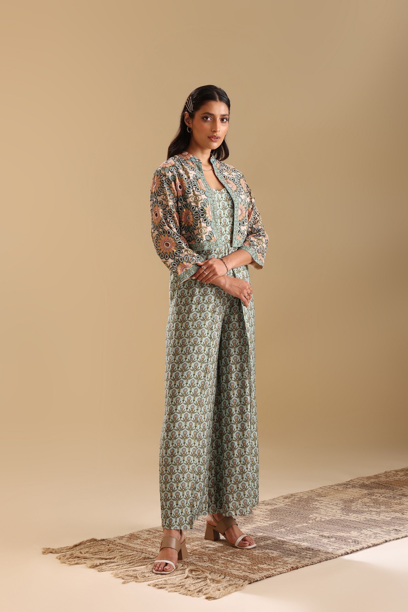 "Green Eraya embellished linen crop jacket paired with a green printed jumpsuit