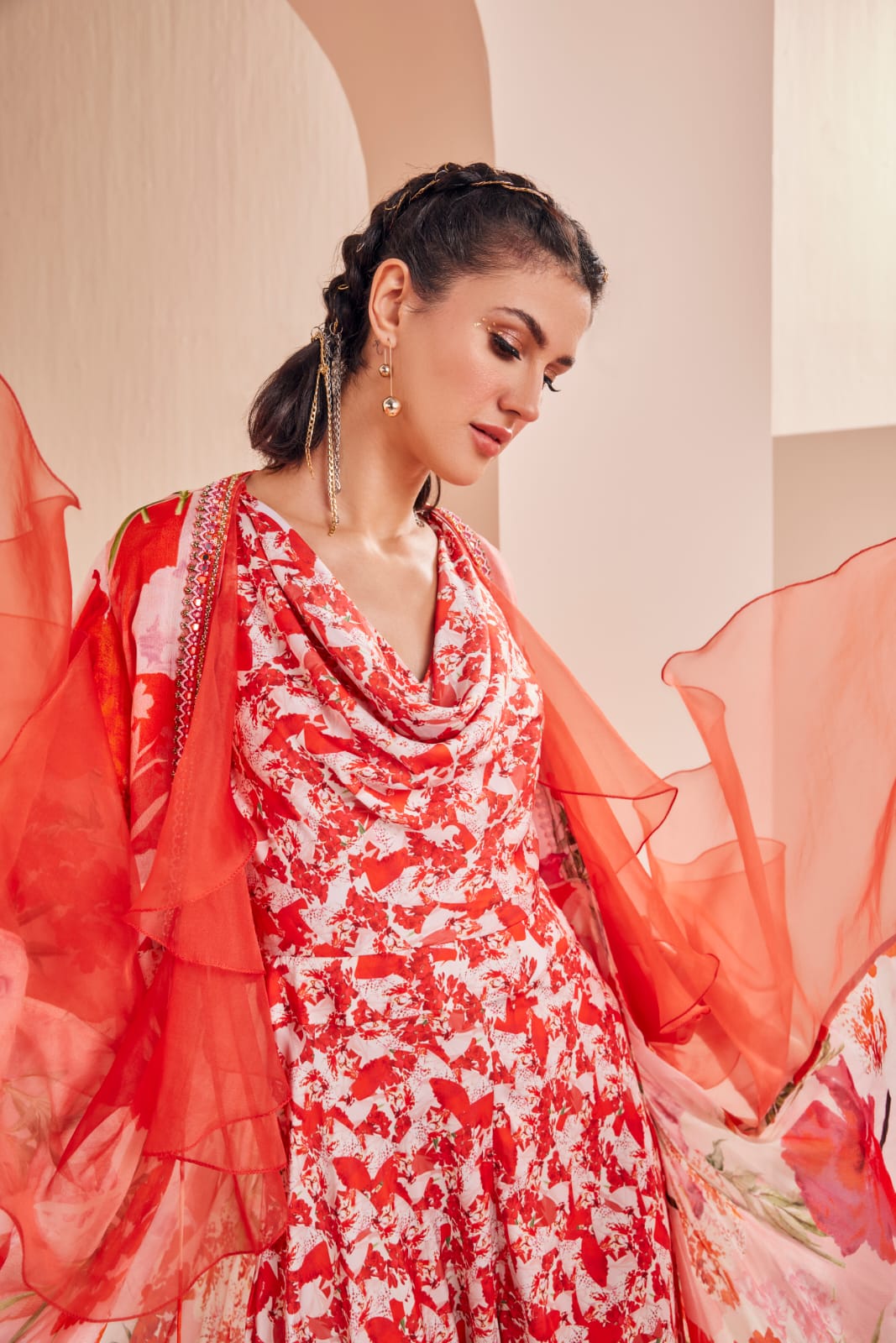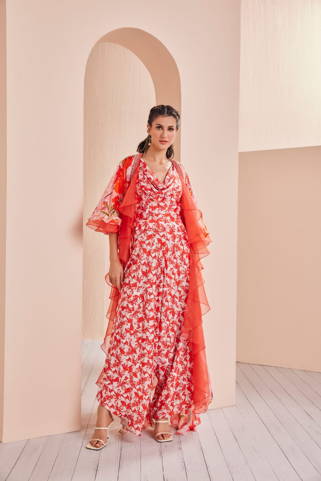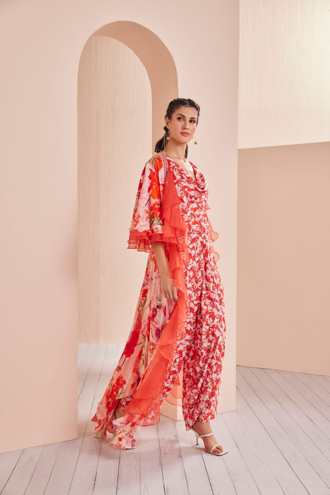 | Step into the world of chic and contemporary fashion with this printed satin jumpsuit. The jumpsuit features a stylish cowl neckline that adds an air of sophistication and drapes gracefully, enhancing the overall look. Its draped legs create a unique silhouette that exudes elegance and style. Paired with this jumpsuit is a chiffon cape with bell sleeves, adding an extra layer of drama and flair to your outfit. The cape is layered with dyed organza ruffles that create a playful and eye-catching effect with every step you take. This ensemble effortlessly combines modern design with a touch of whimsy, making it a striking choice for various occasions where you want to make a fashion statement. |