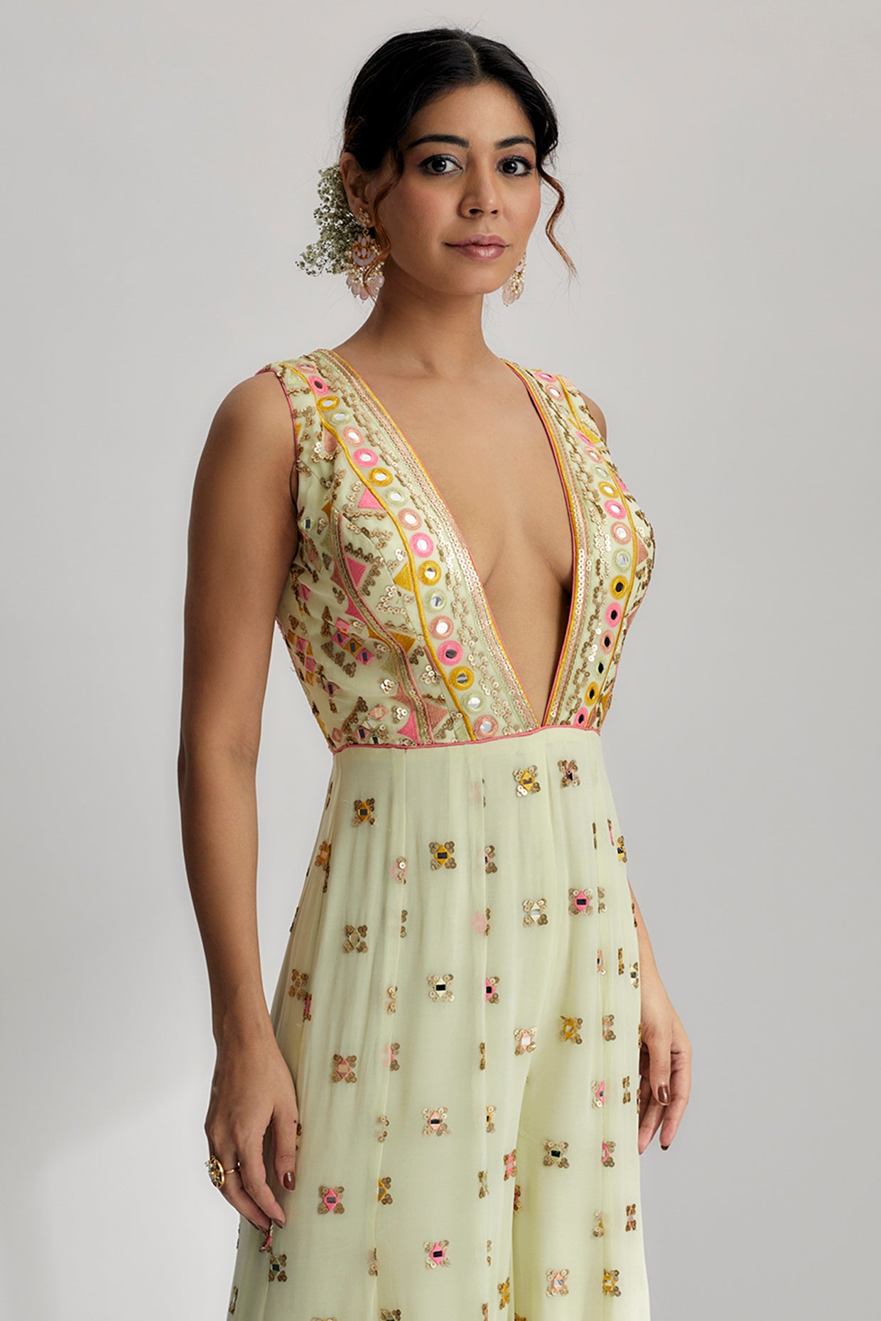 Introducing the stunning Rihanna Jumpsuit, a masterpiece of fashion that combines exquisite craftsmanship with vibrant design elements. This jumpsuit is a true work of art, showcasing intricate hand and machine embroidery, adorned with sequins, colorful pompoms, and mesmerizing tassels.