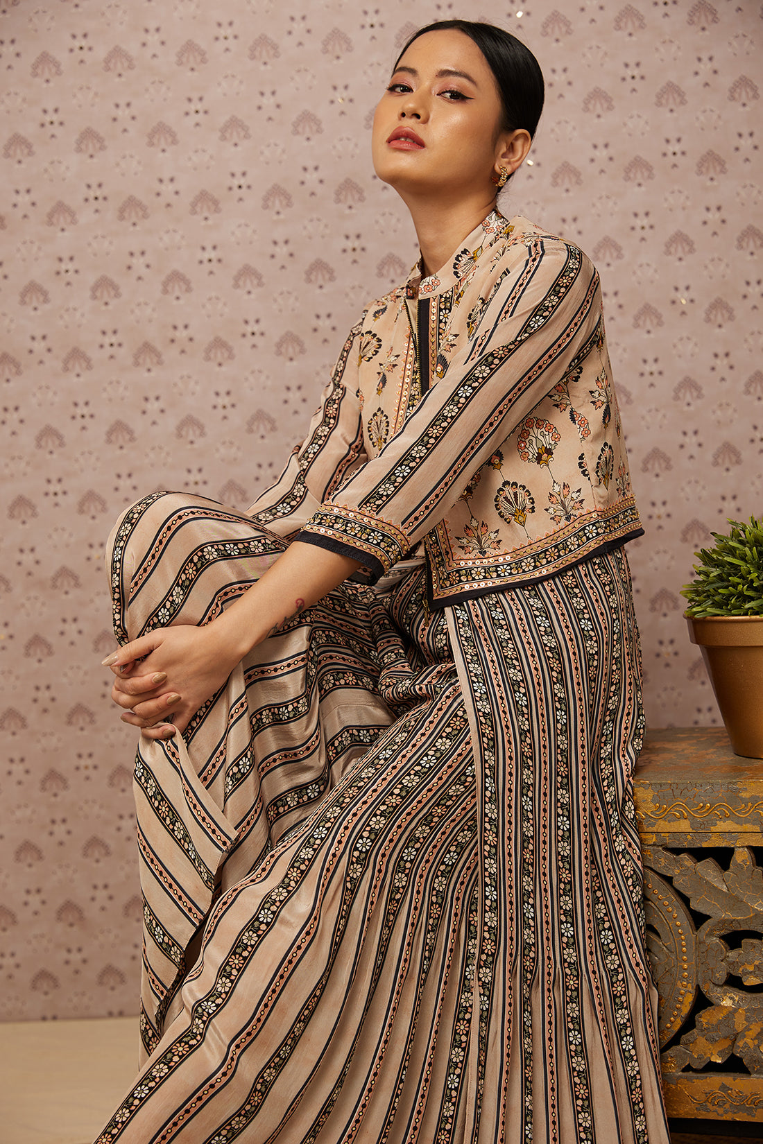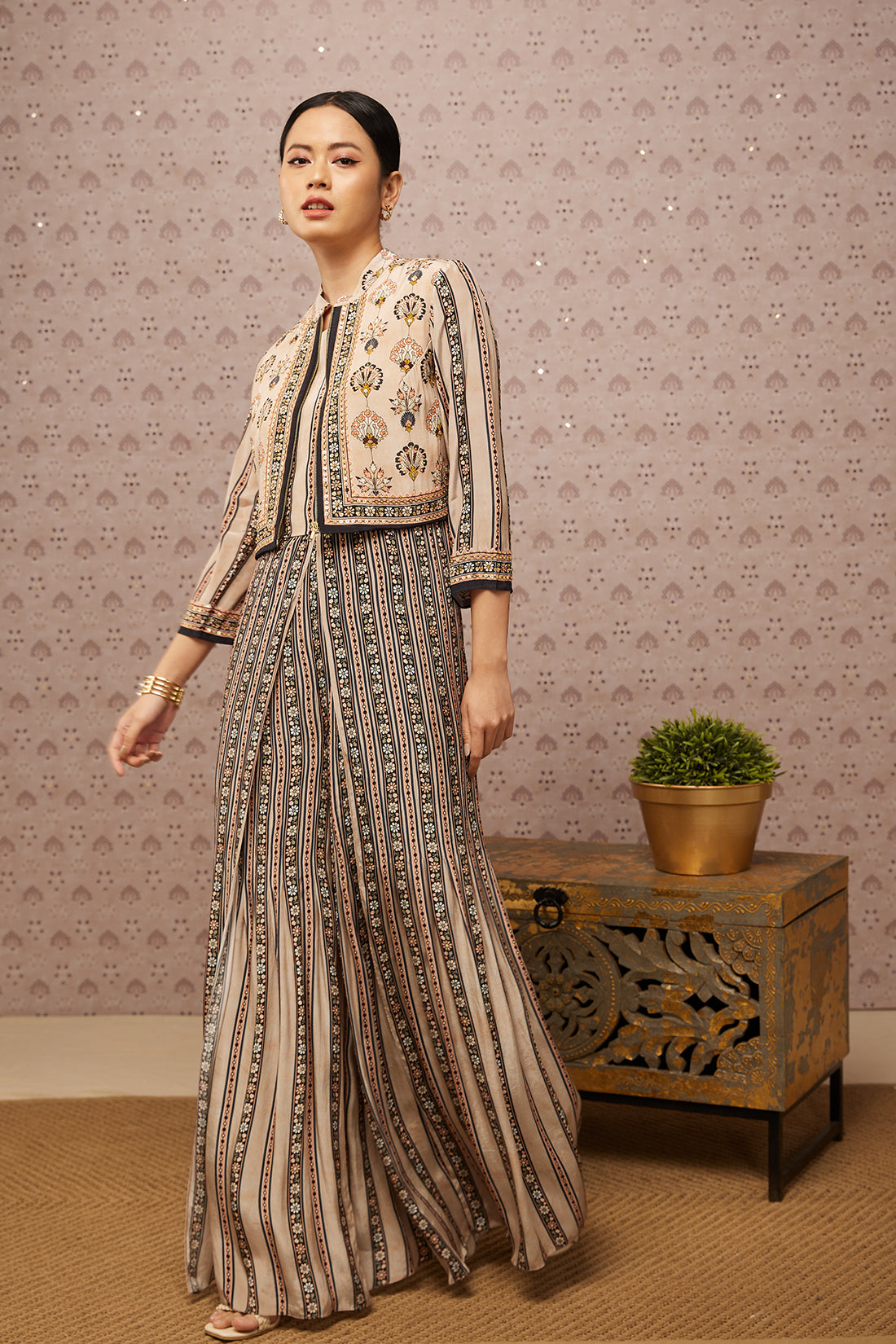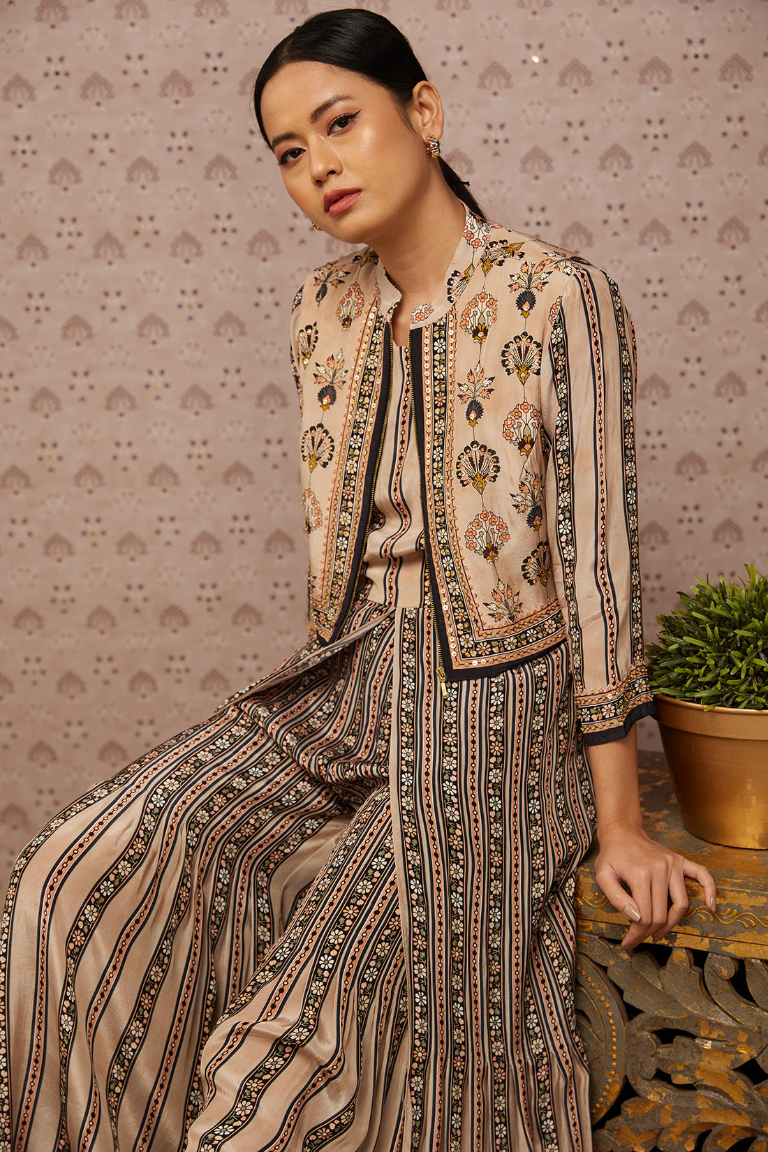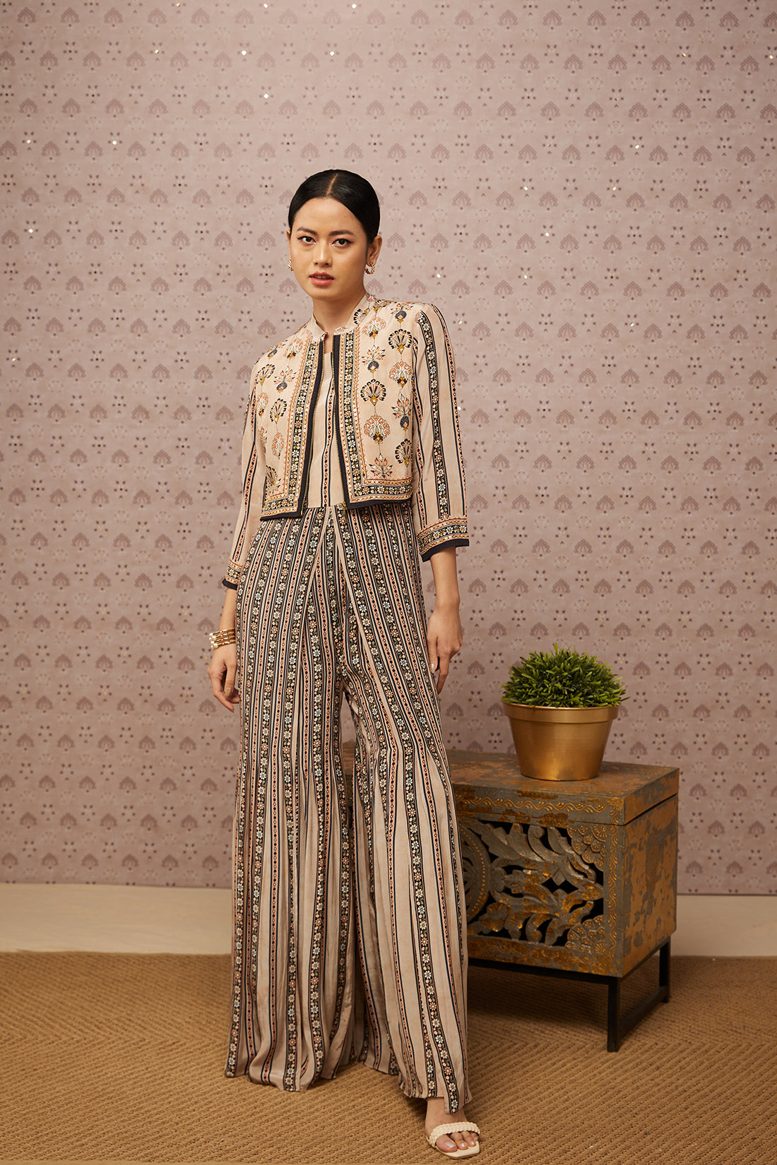 Featuring a beige printed jumpsuit. It is paired with a jacket.