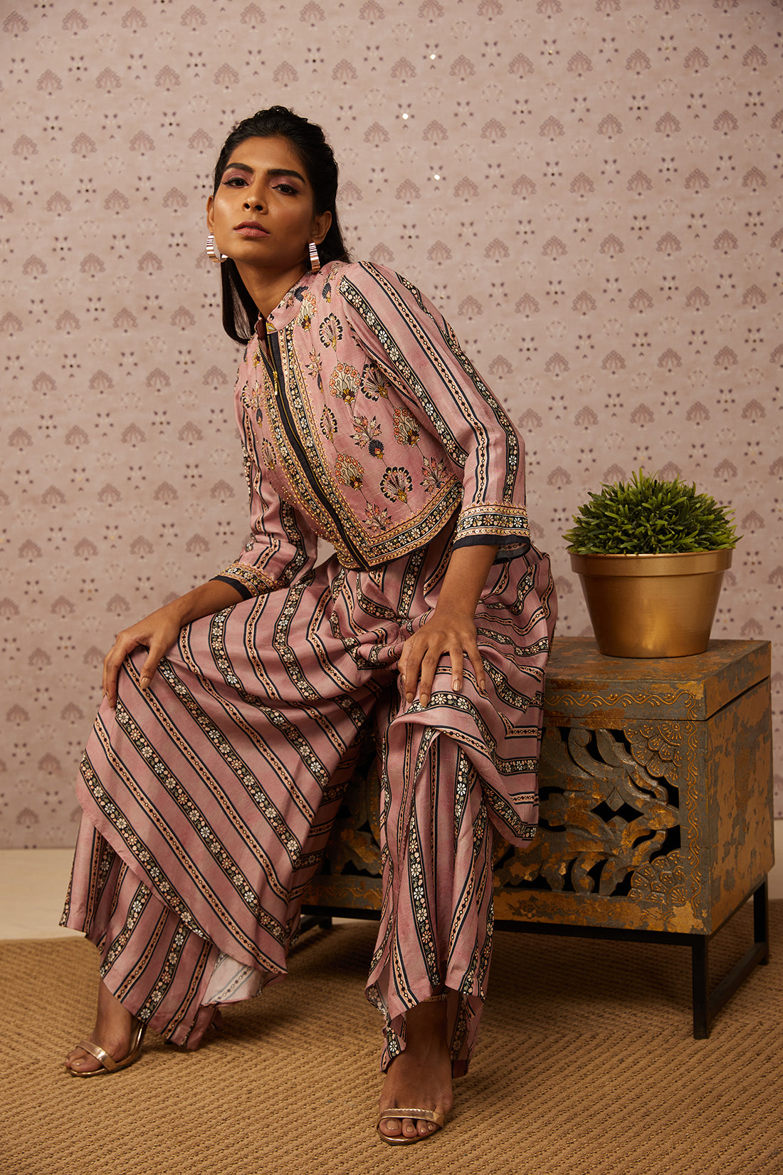 Featuring a pink crepe based layered jumpsuit. It is paired with an embroidered jacket.