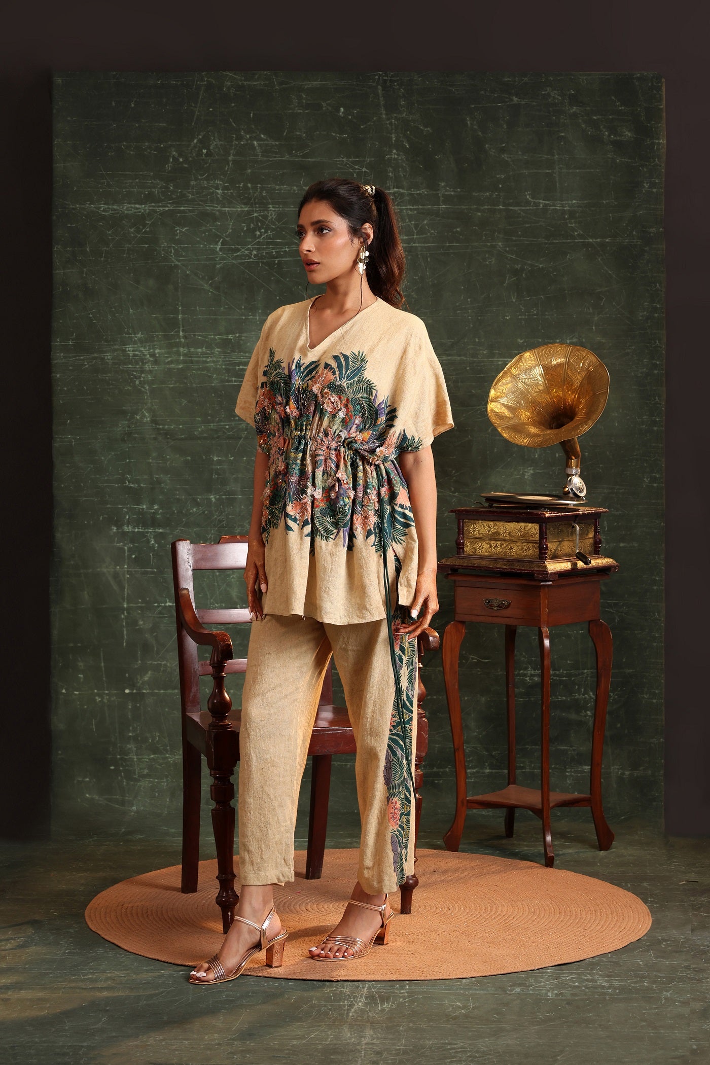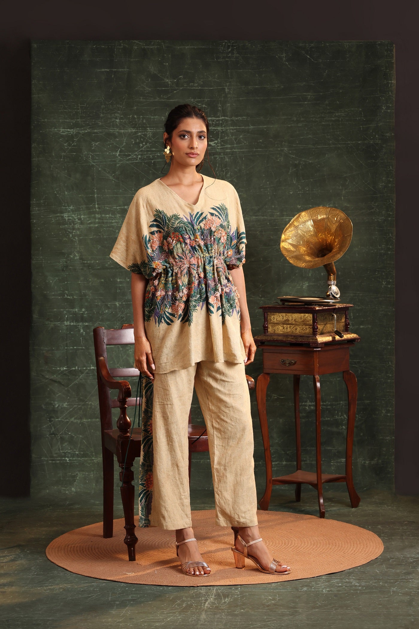 | Beige Kaira Embellished Kaftan Top with Waist Tie-Up paired with Cotton Pants Fit: Relaxed Wash Care: Dry Clean Only |
