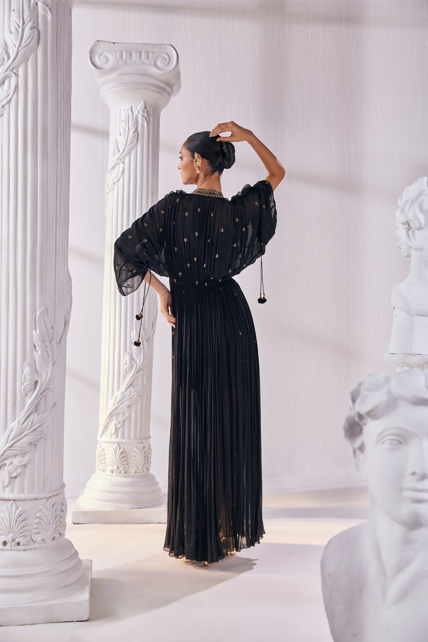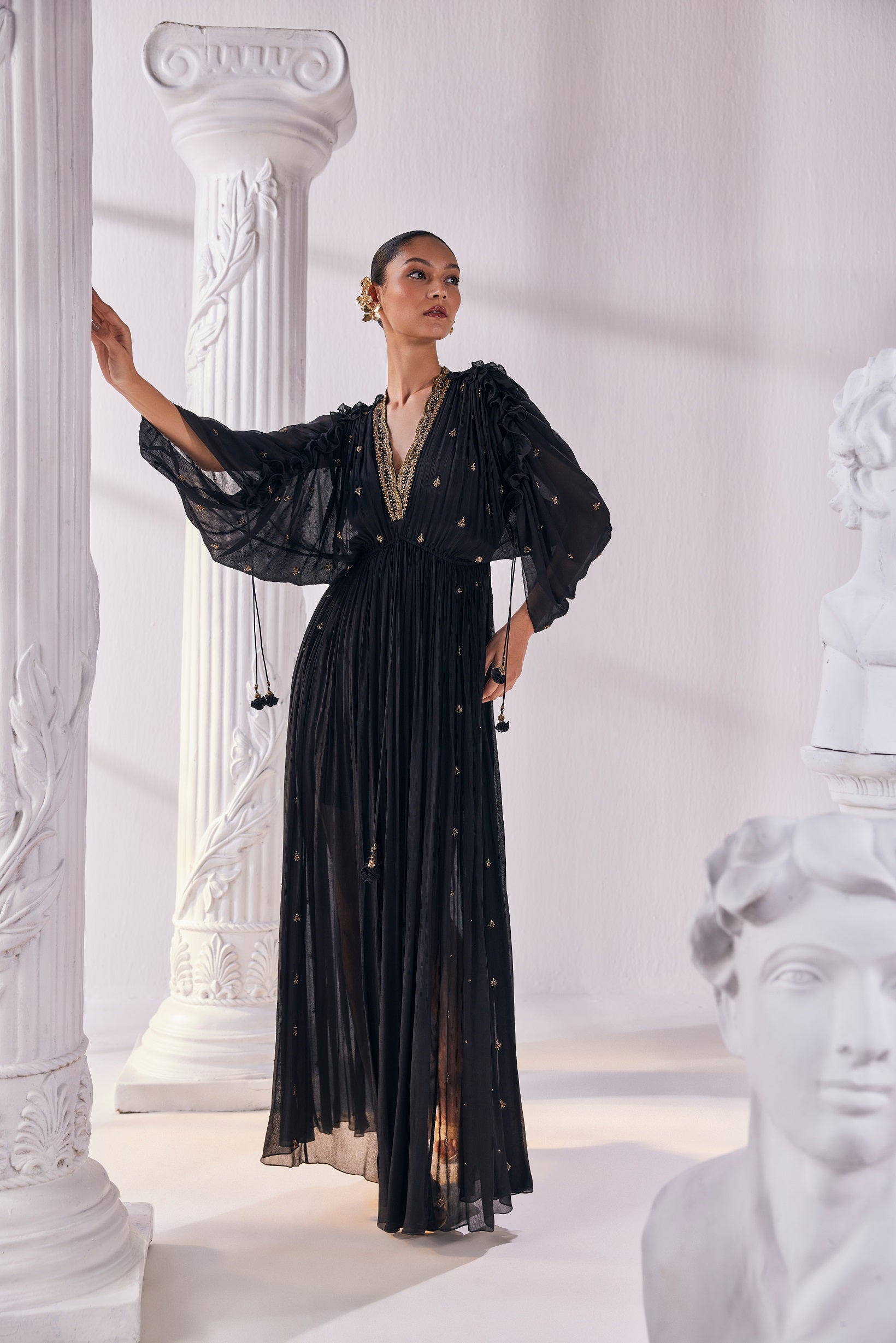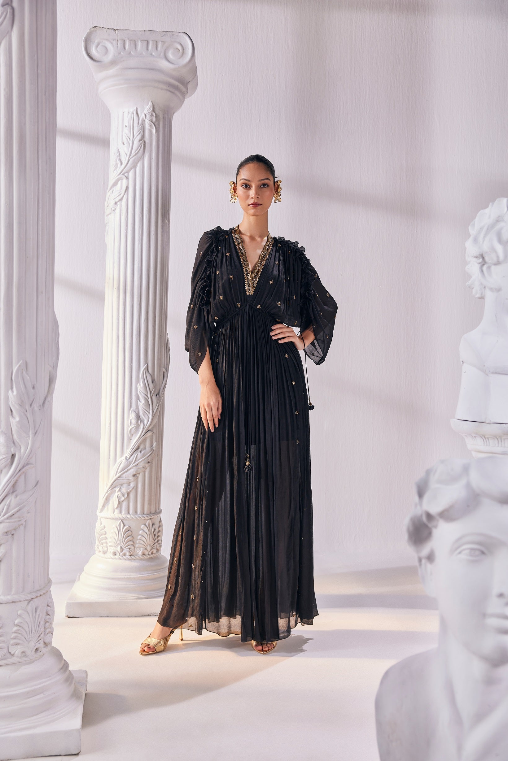 Chiffon kaftan dress featuring an emroidered plunging neckline.