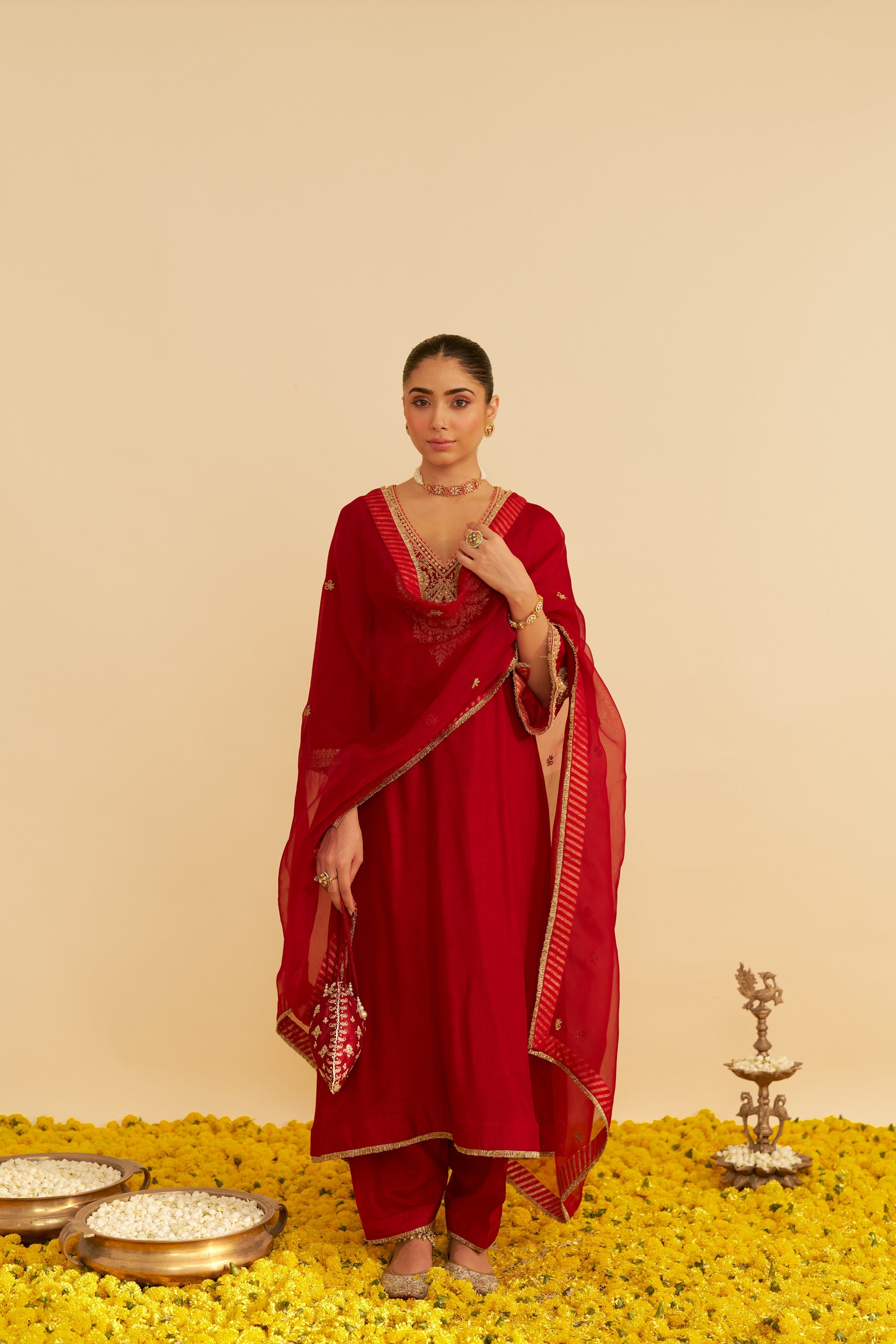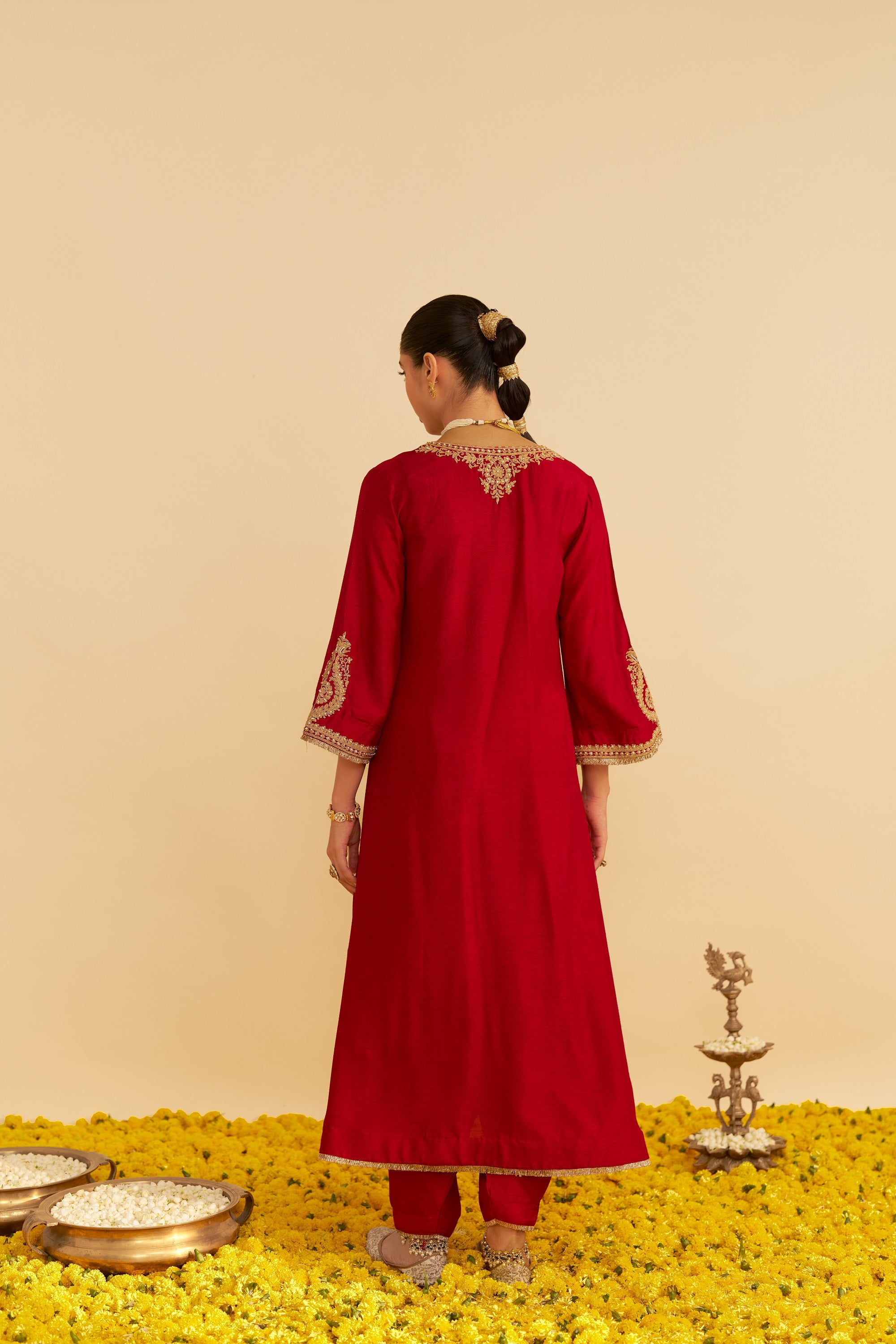The Haayat Ensemble Is Crafted From Pure Upada Silk, Exuding Richness And Elegance. The Outfit Is Beautifully Adorned With Intricate Kiran Dori Embroidery, Highlighted With Delicate Pearls For A Subtle Yet Luxurious Finish. The Long Kaftan Features A Broad And Deep V-Neckline At The Front, A Zero Neckline At The Back, And Three-Quarter Sleeves Finished With Traditional Kiran Detailing. It Is Paired With A Classic Dogri Salwar, Complementing The Overall Silhouette. The Ensemble Is Completed With Contrasting Banarasi Fabric And Gota Accents, Adding A Refined And Festive Touch To The Look.