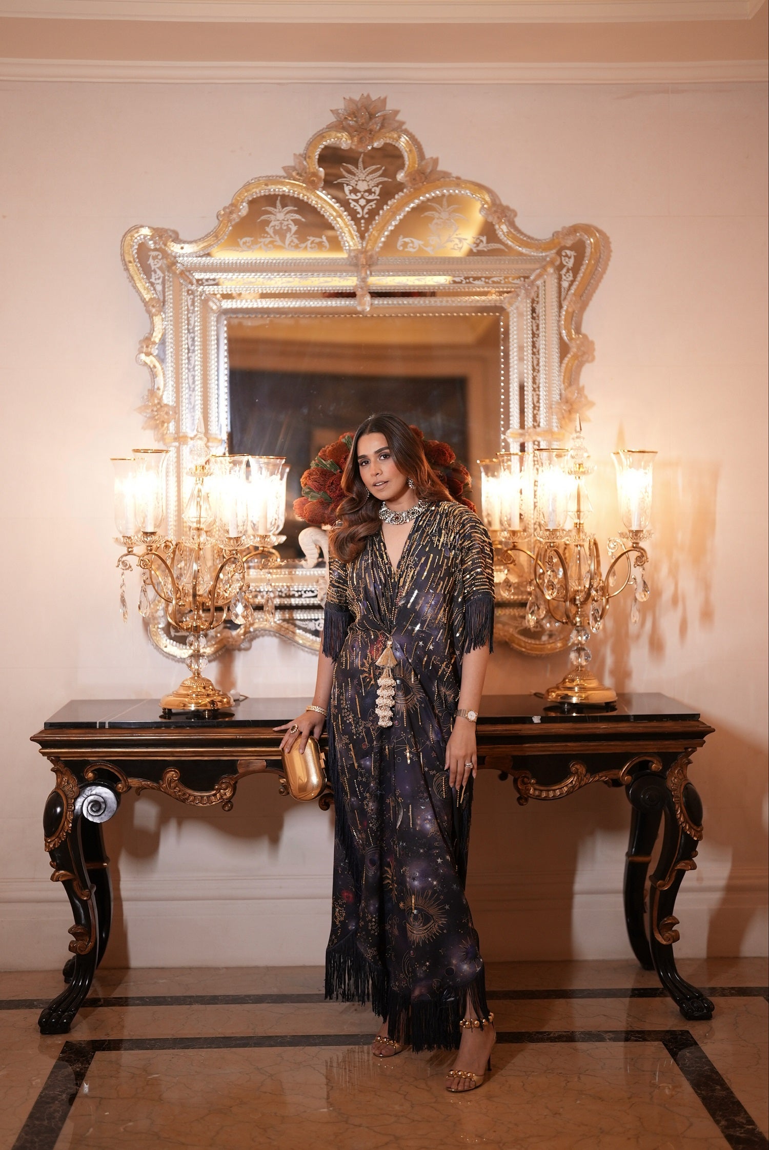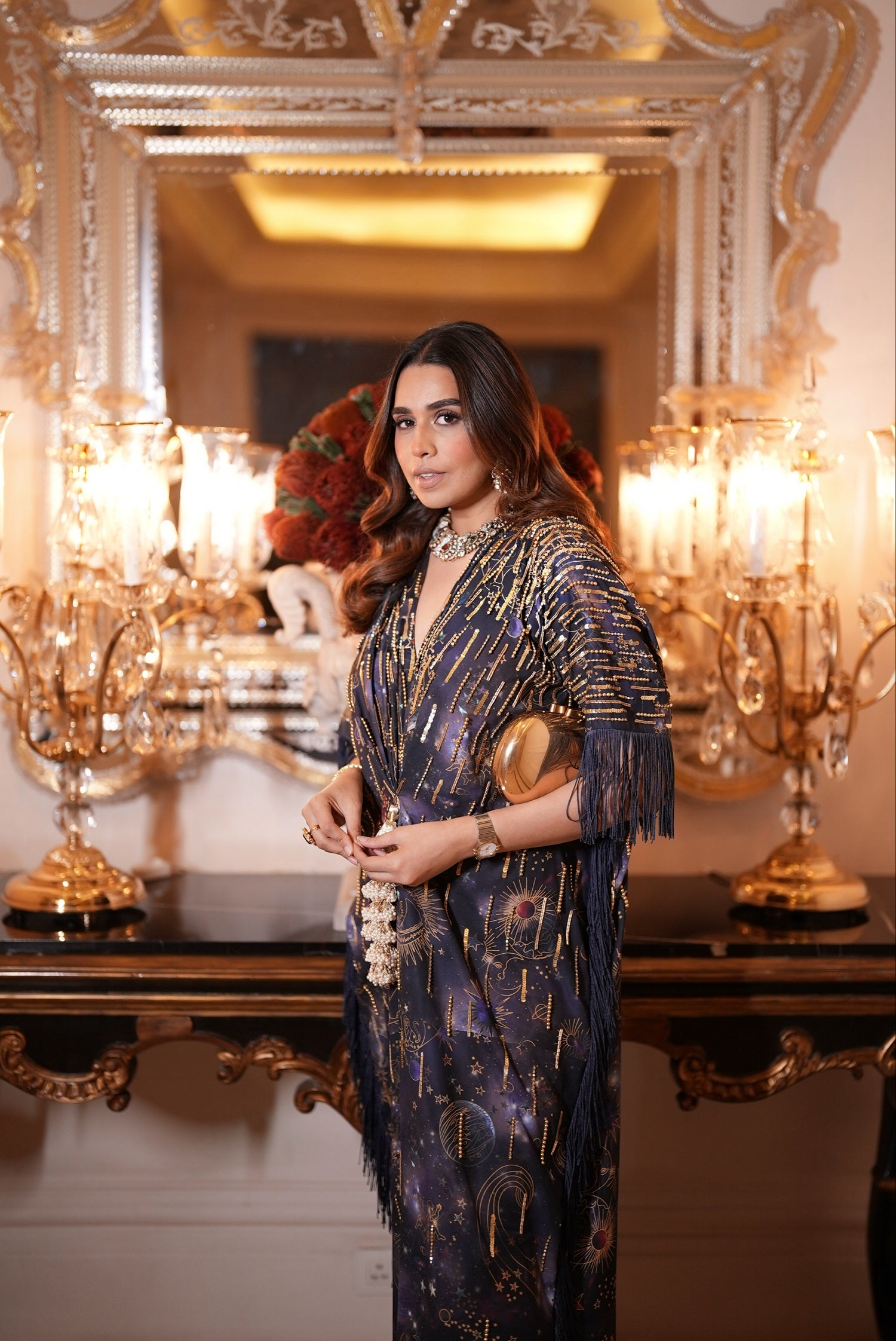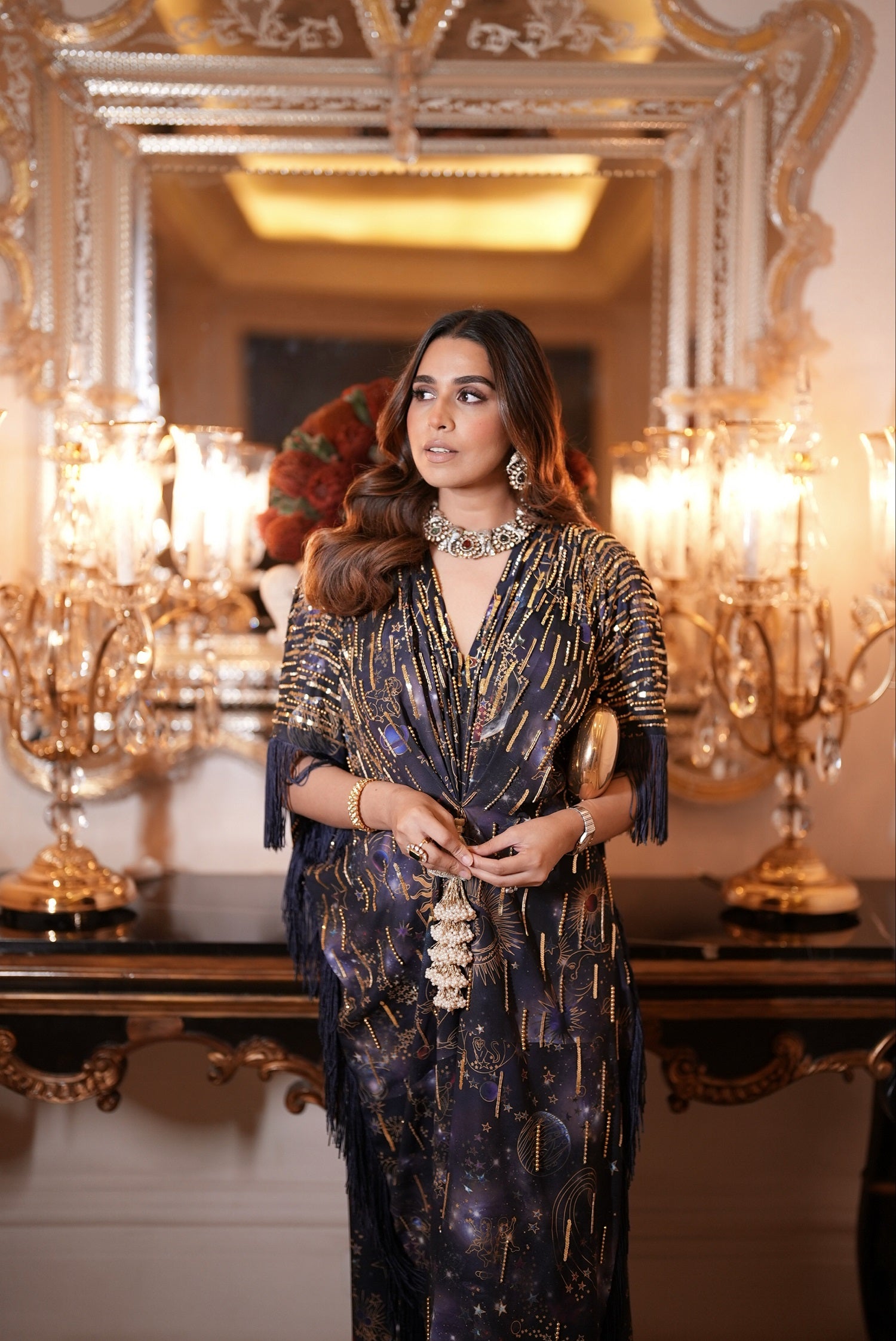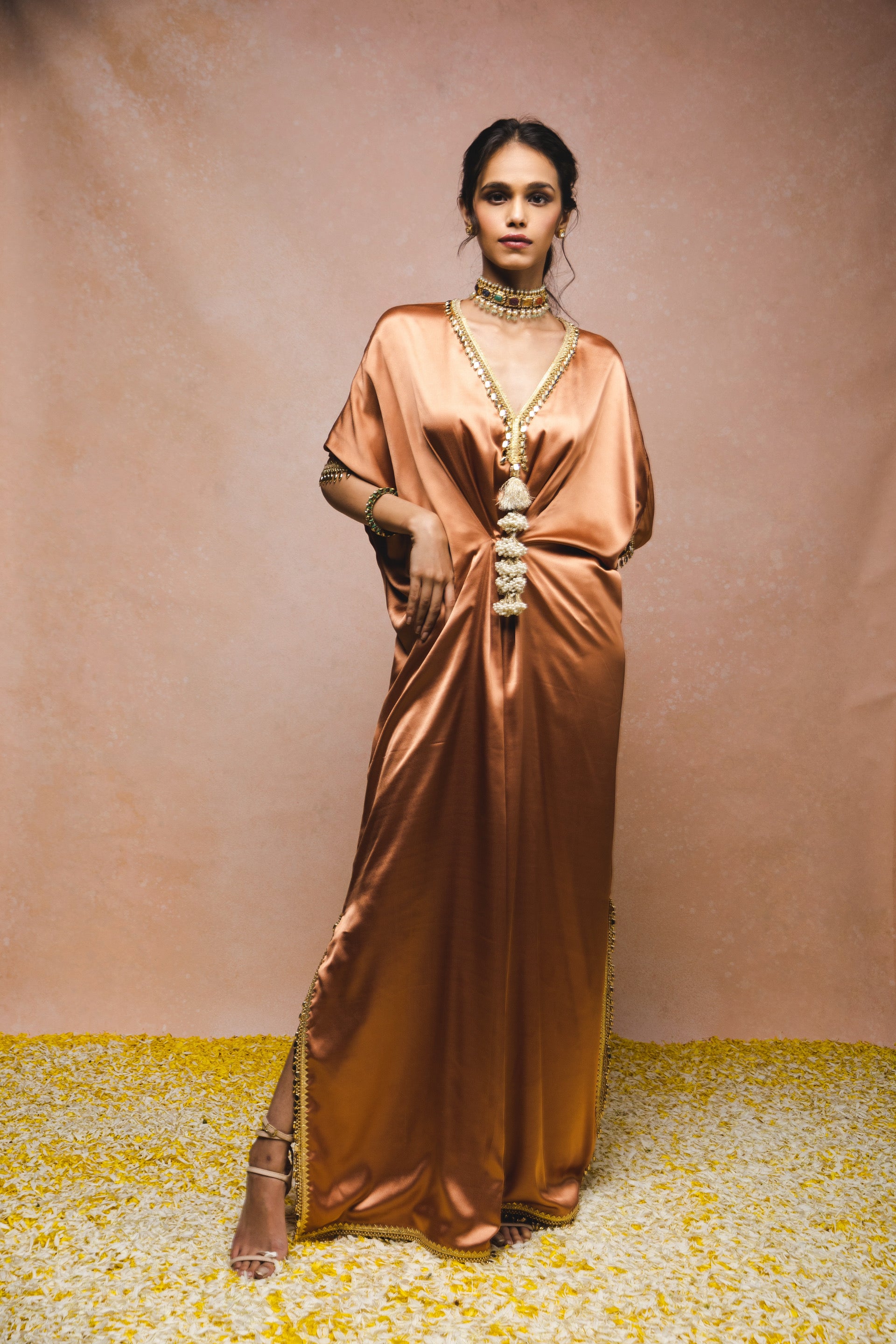 Gold cord draped kaftaan