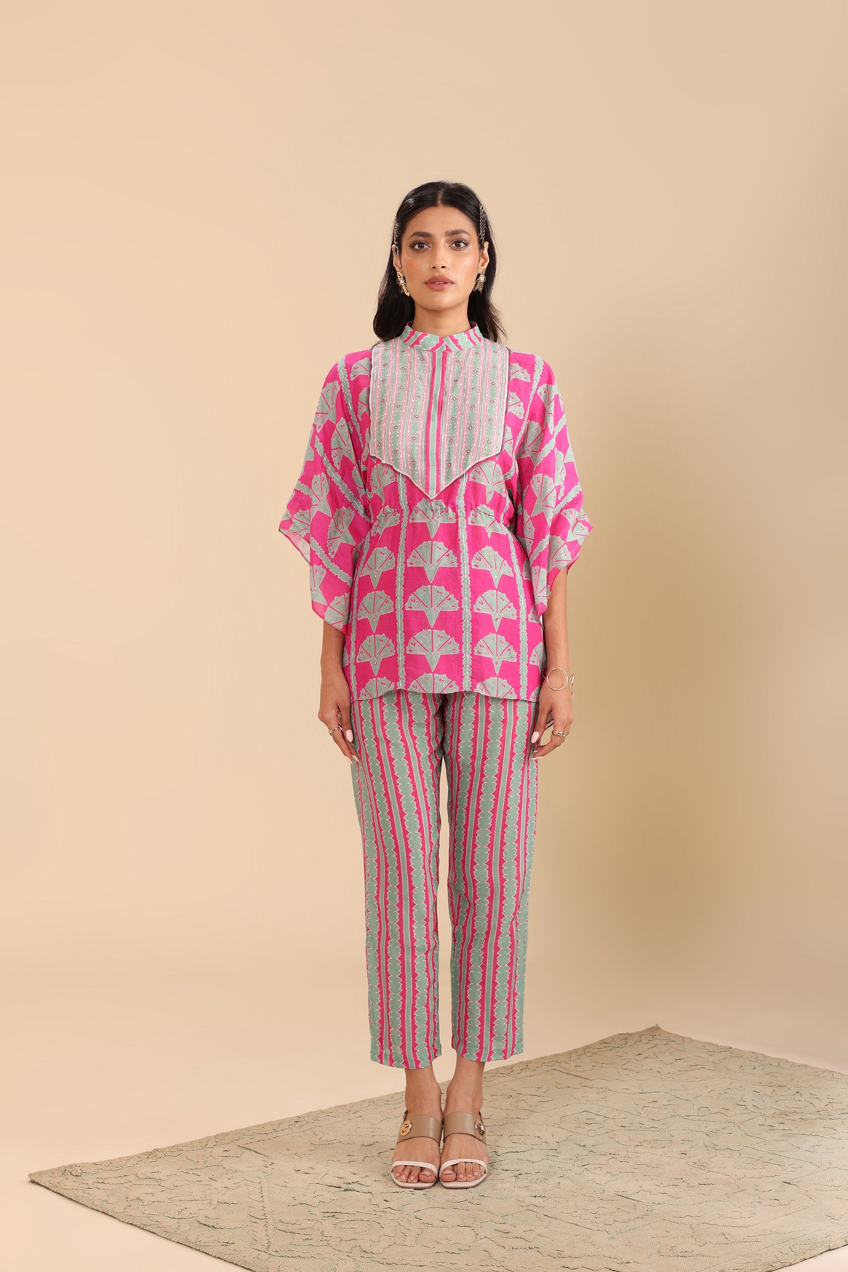 Pink naqsh embellished short kaftan set