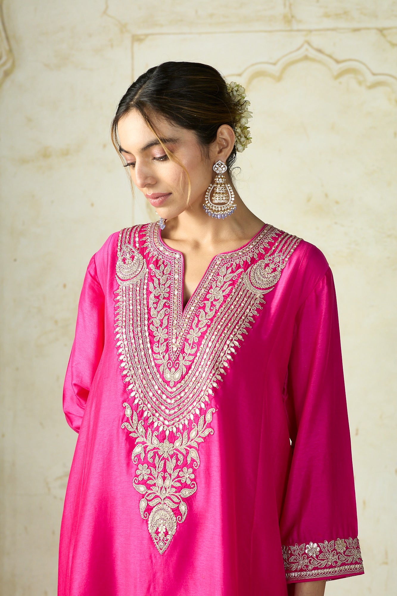 The Asymmetrical Kurta Is Adorned With Intricate Embroidery Along The Neckline, Hem, And Cuffs, Adding A Regal Touch To The Deep Hue. Paired With A Matching Salwar Featuring Delicate Motifs And A Broad Embroidered Hemline, The Ensemble Captures The Essence Of Traditional Sophistication.