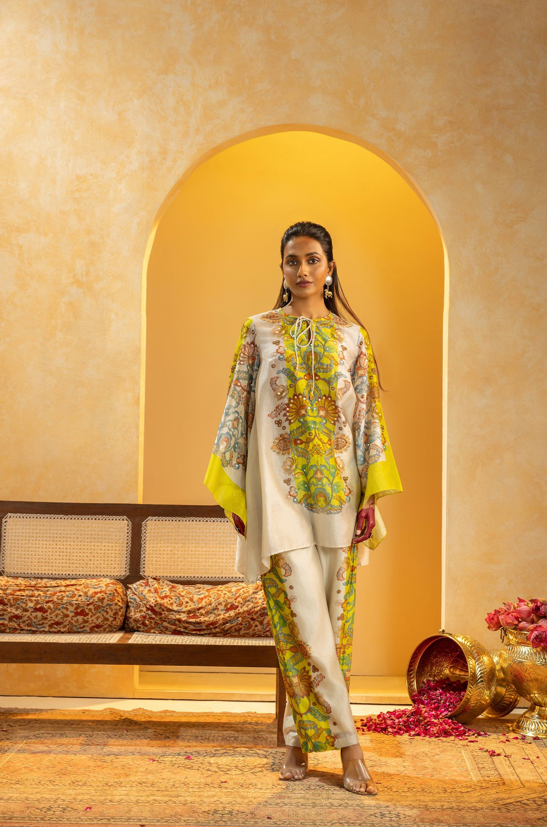 Off-White Rangtara Embellished Kurta With Fllaired Sleeves, Paired With Printed Straight Pants In Chander
