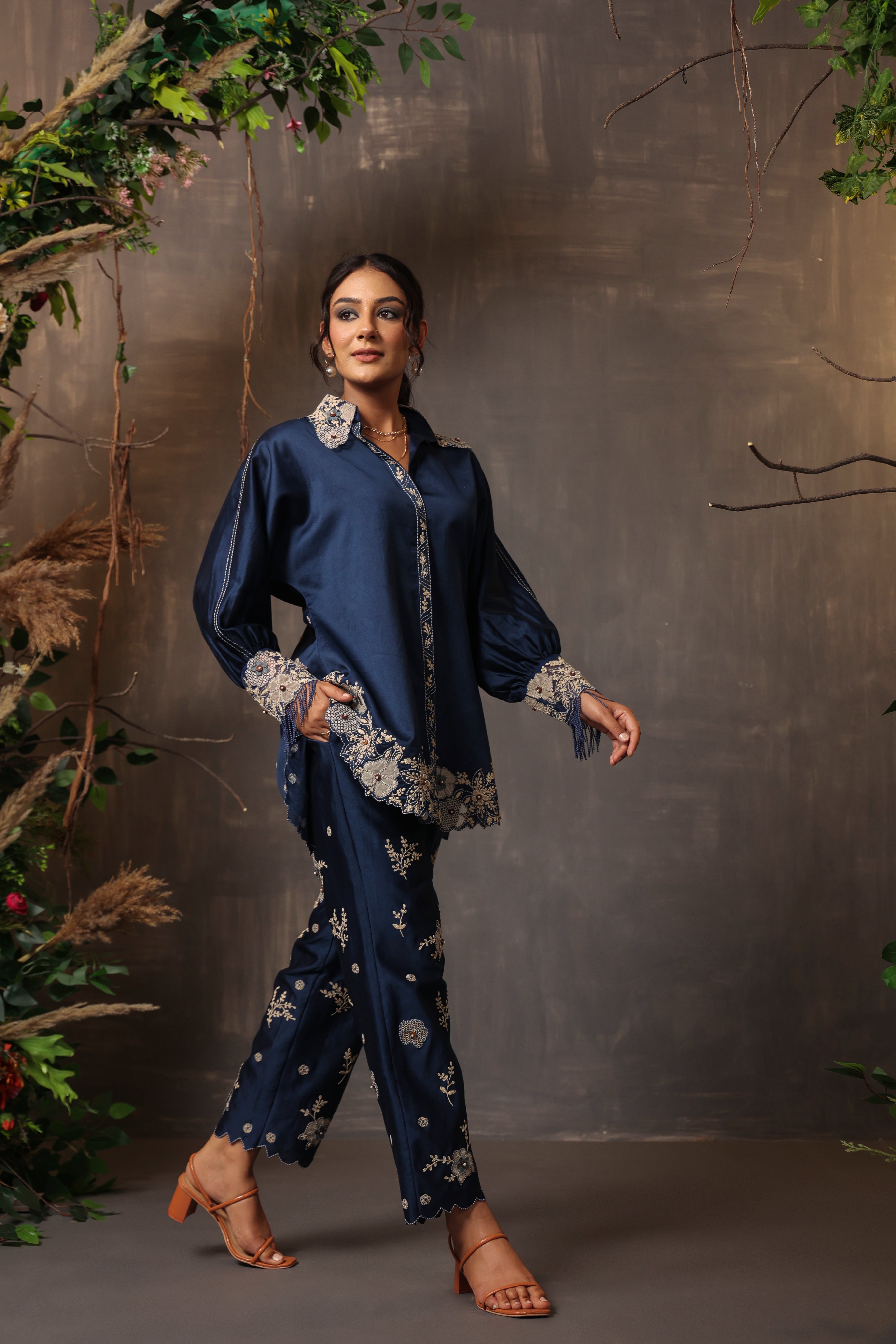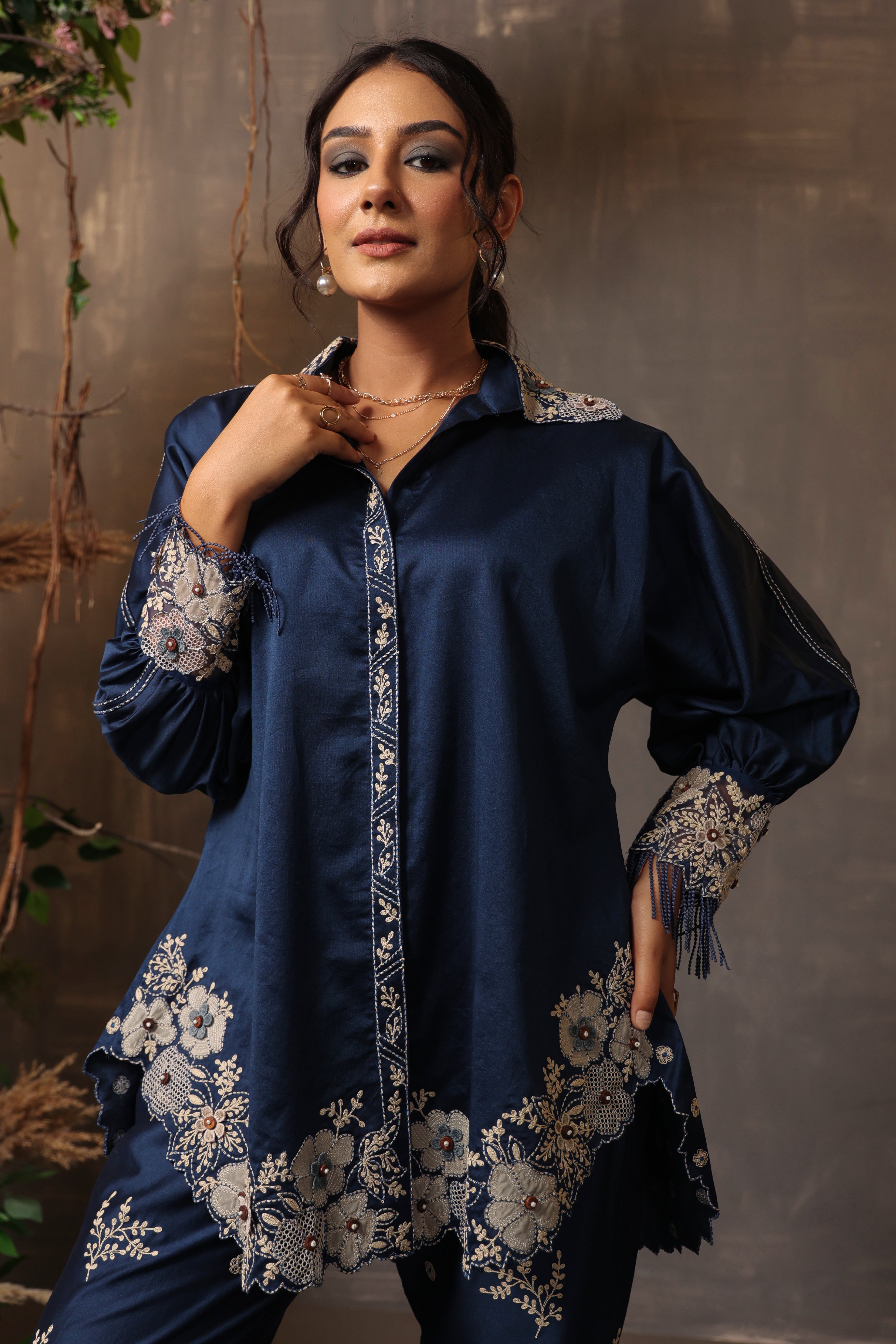 "This 2pc co-ord set is enhanced with dainty applique and cut work embroidery. This oversized shirt is paired with narrow pants.