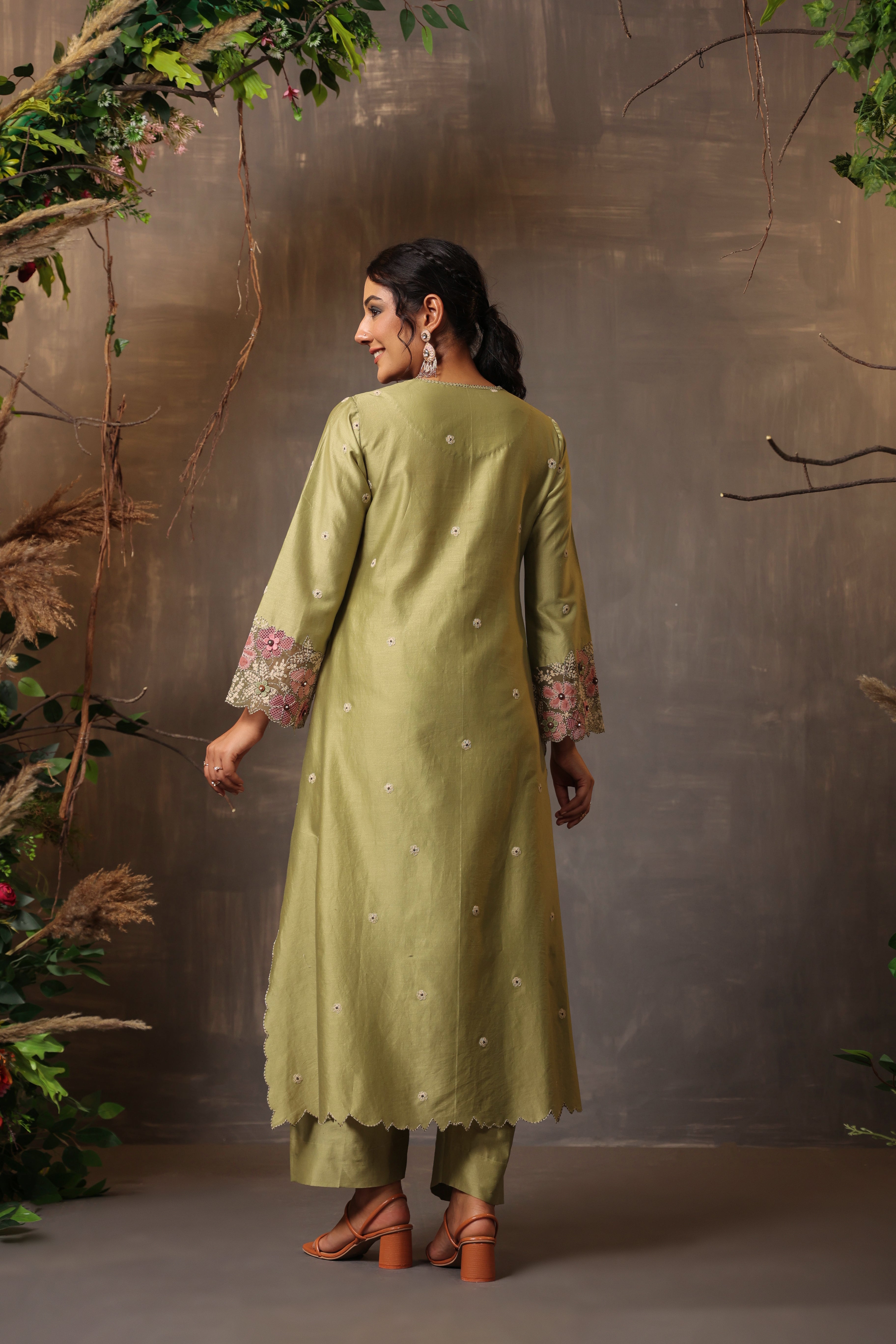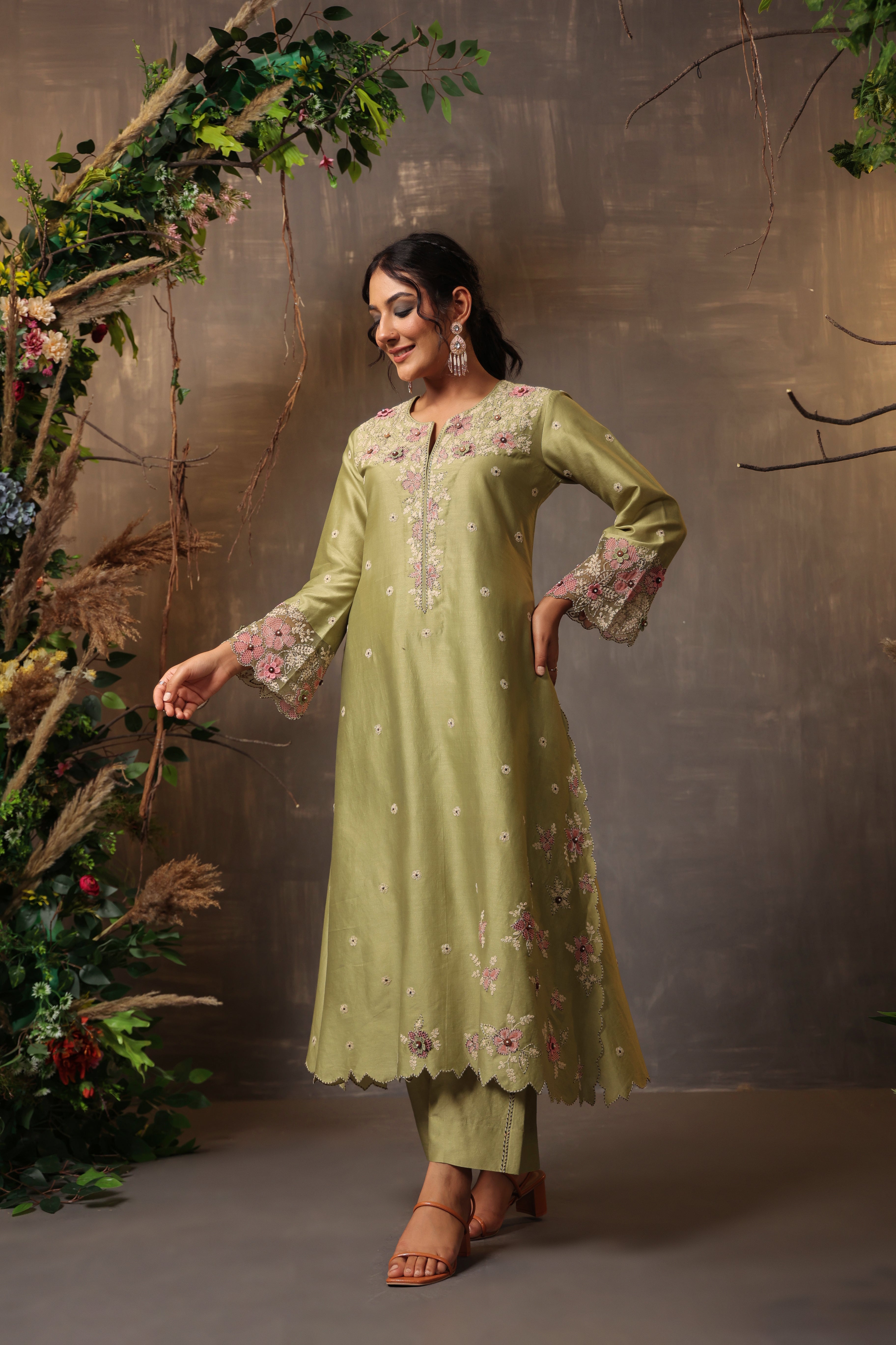 This 2pc Kurta set is enhanced with dainty applique and cut work embroidery. It is paired with embroidered pants . Optional dupatta in chanderi silk available on request .