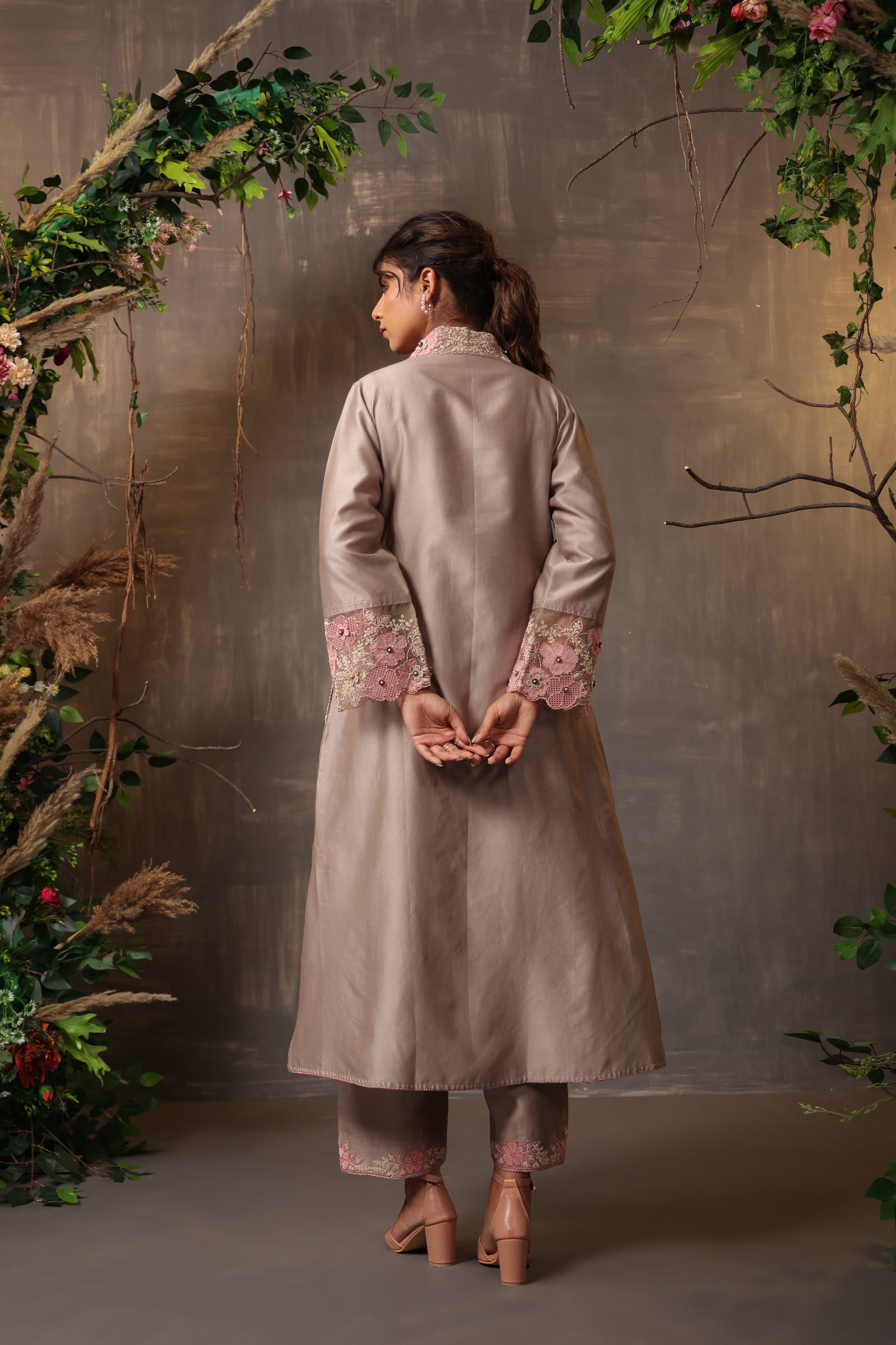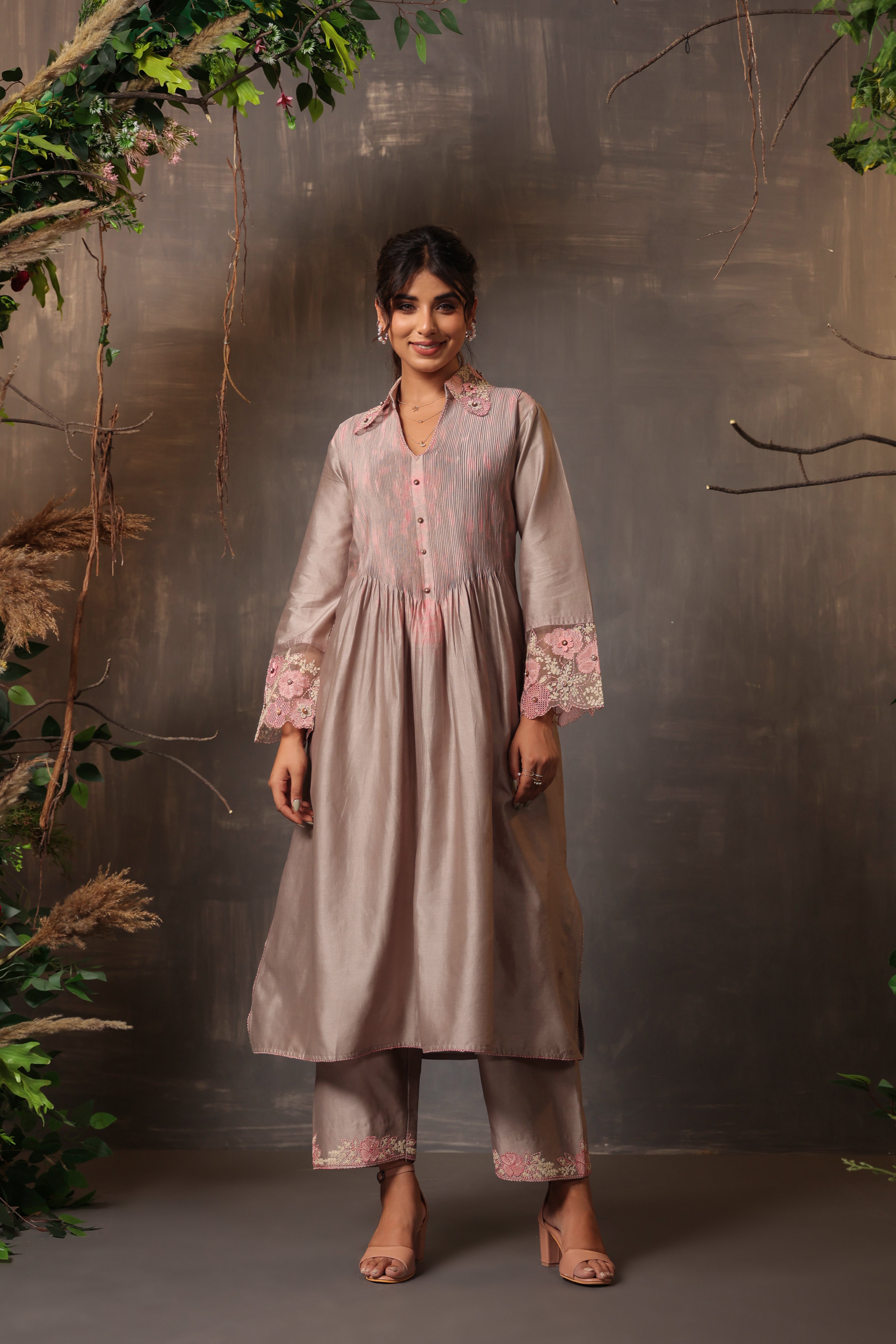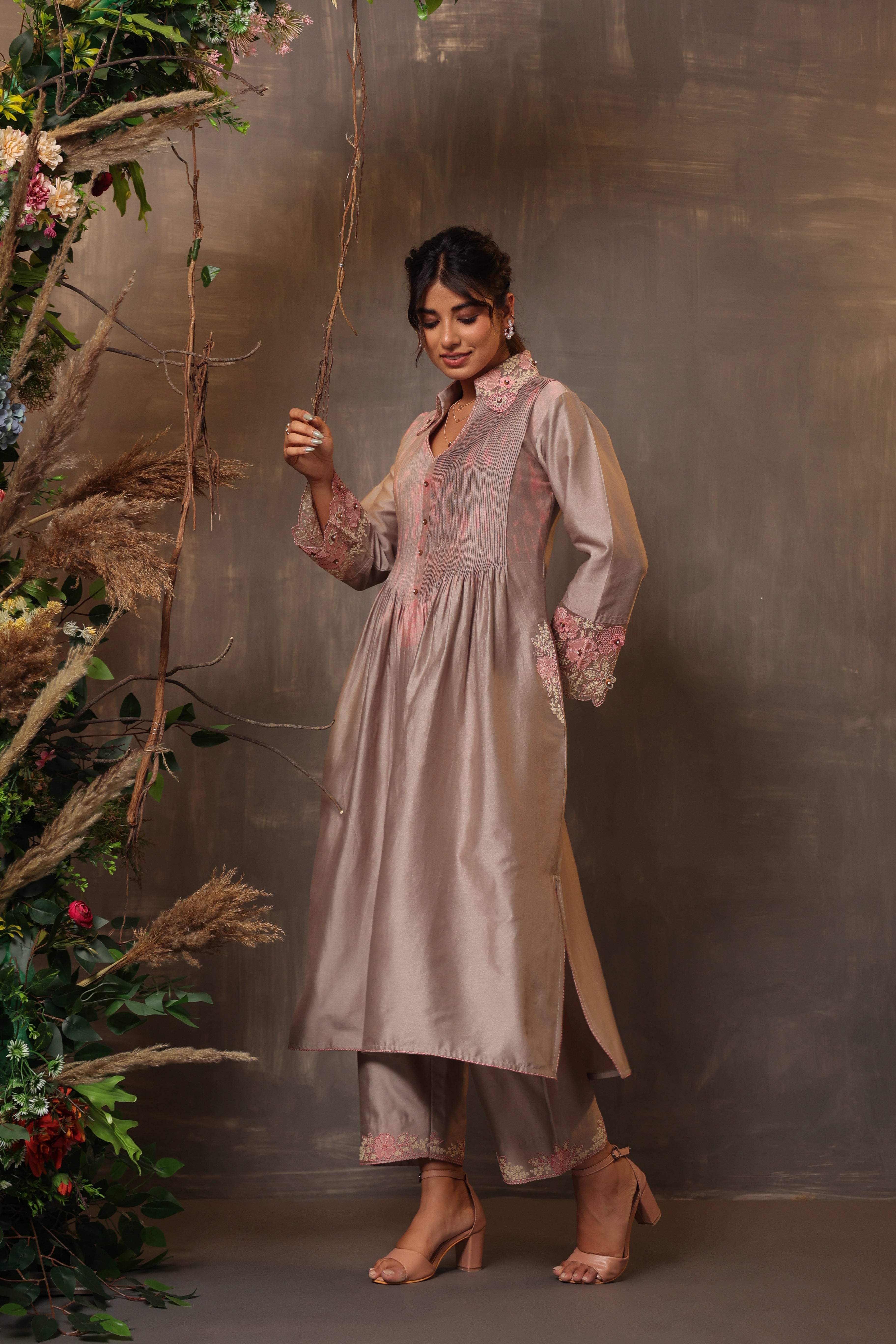 "This 2pc shibori kurta set is enhanced with pintuck detailing along with applique and cut work embroidery. It comes with embroidered palazzo pants.