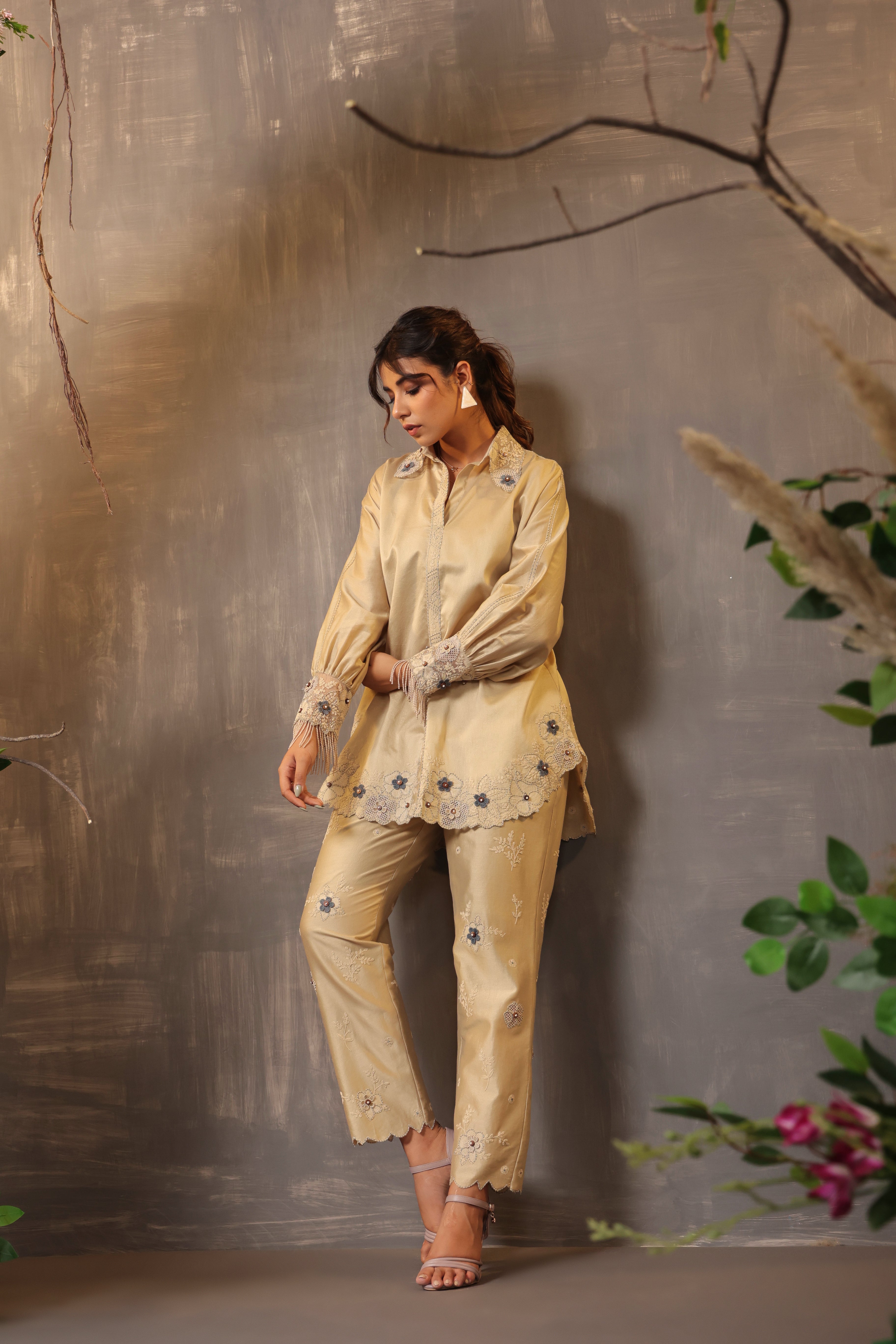 "This 2pc co-ord set is enhanced with dainty applique and cut work embroidery. This oversized shirt is paired with narrow pants.