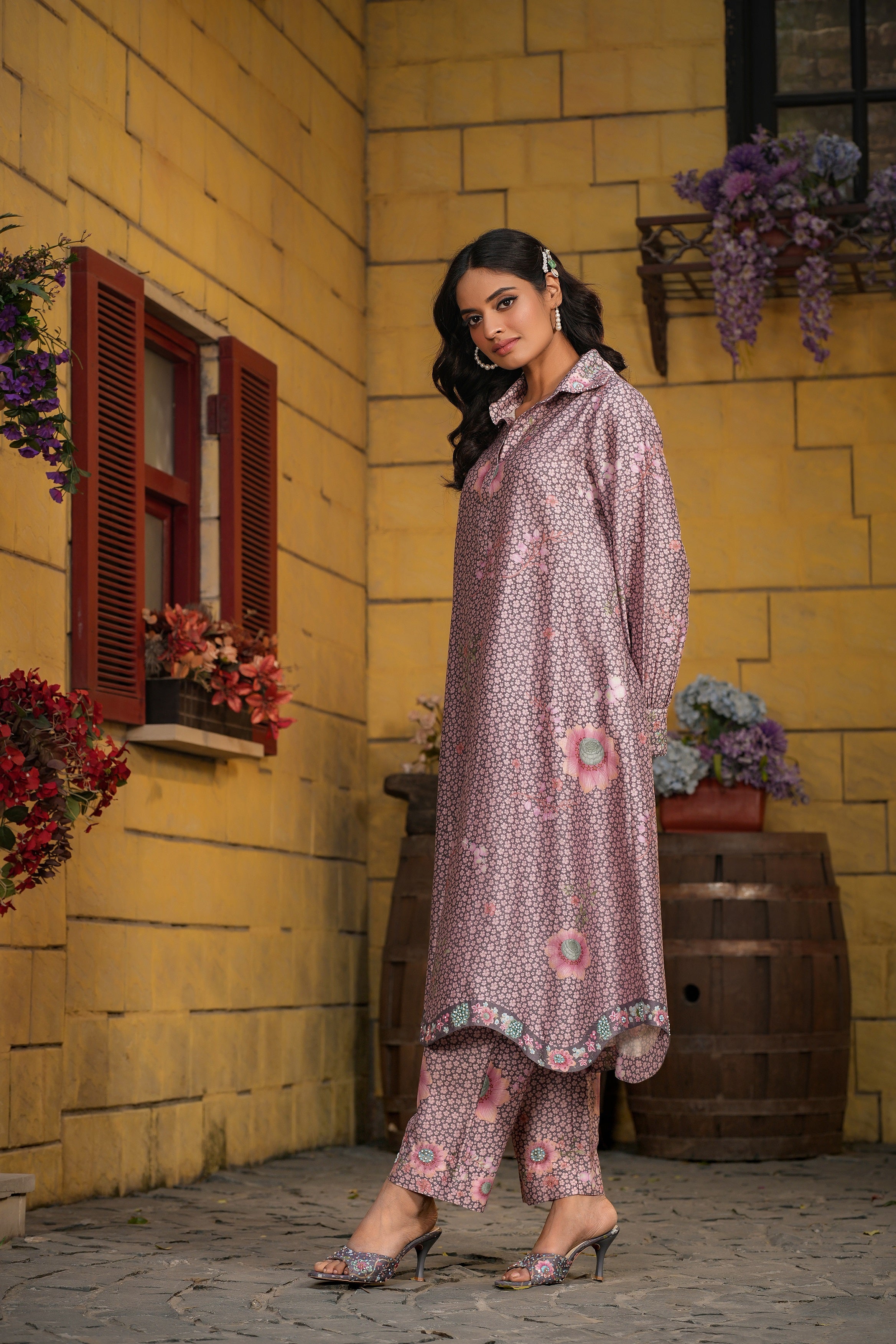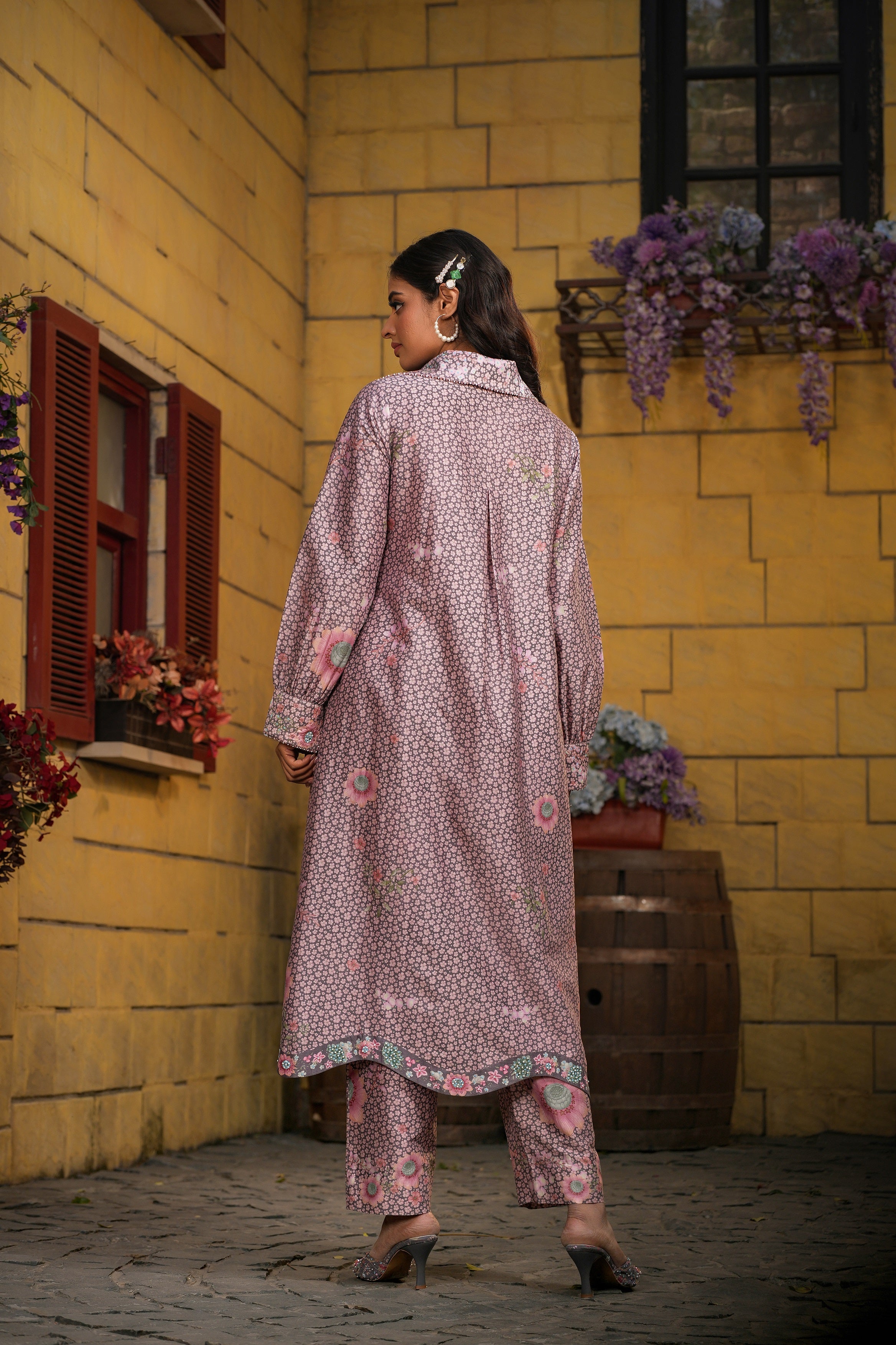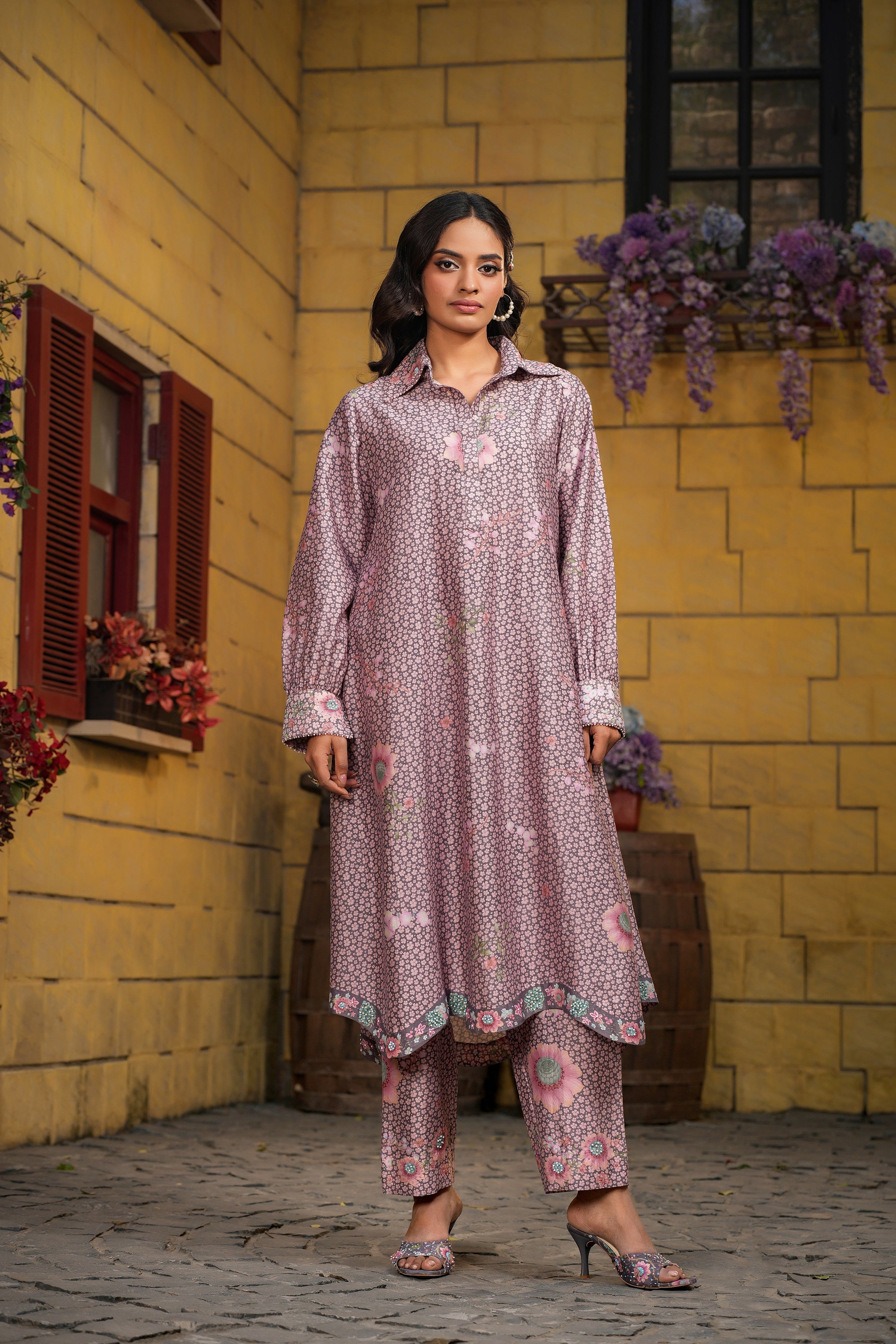 | This 2pc coord set is enhanced with delicate embroidery around collar and cuff of the sleeves . |