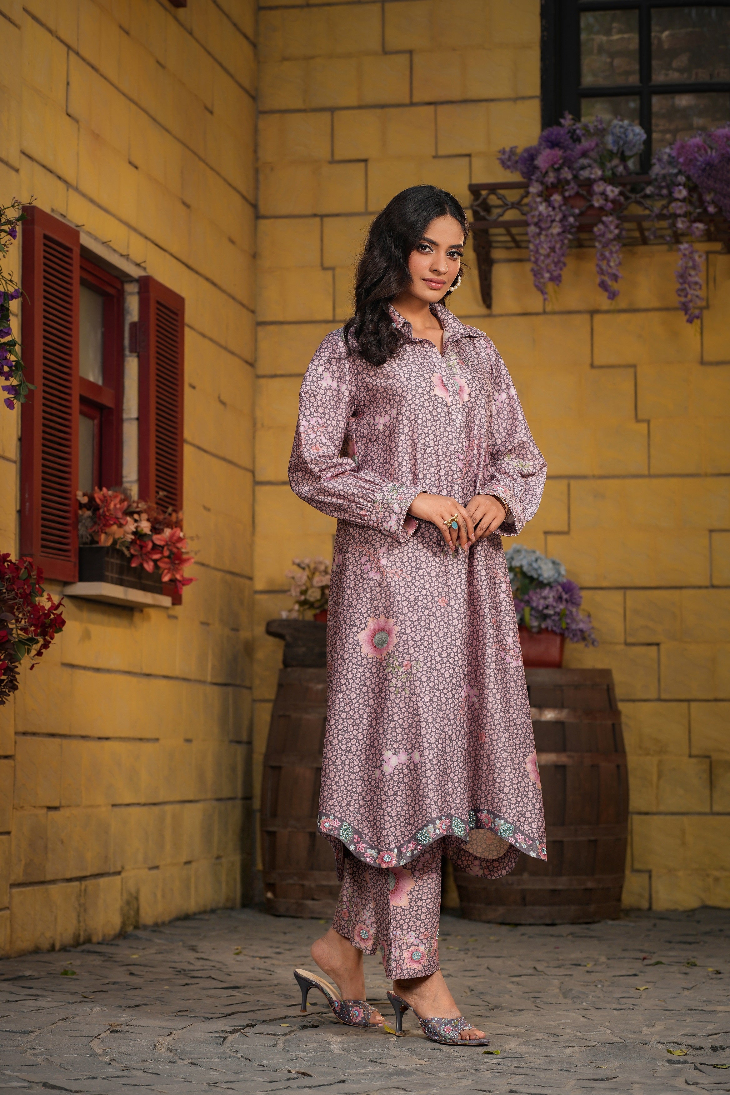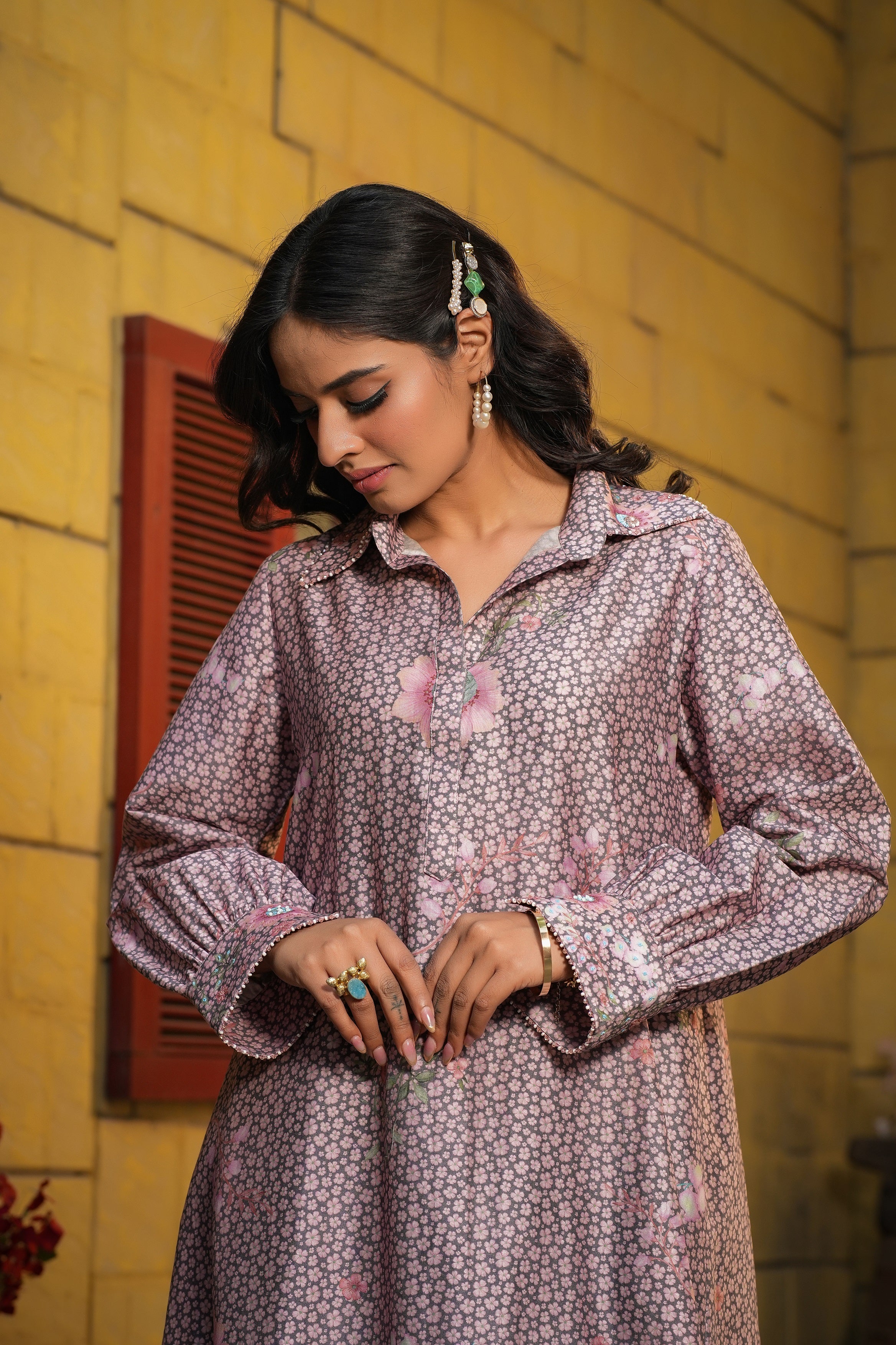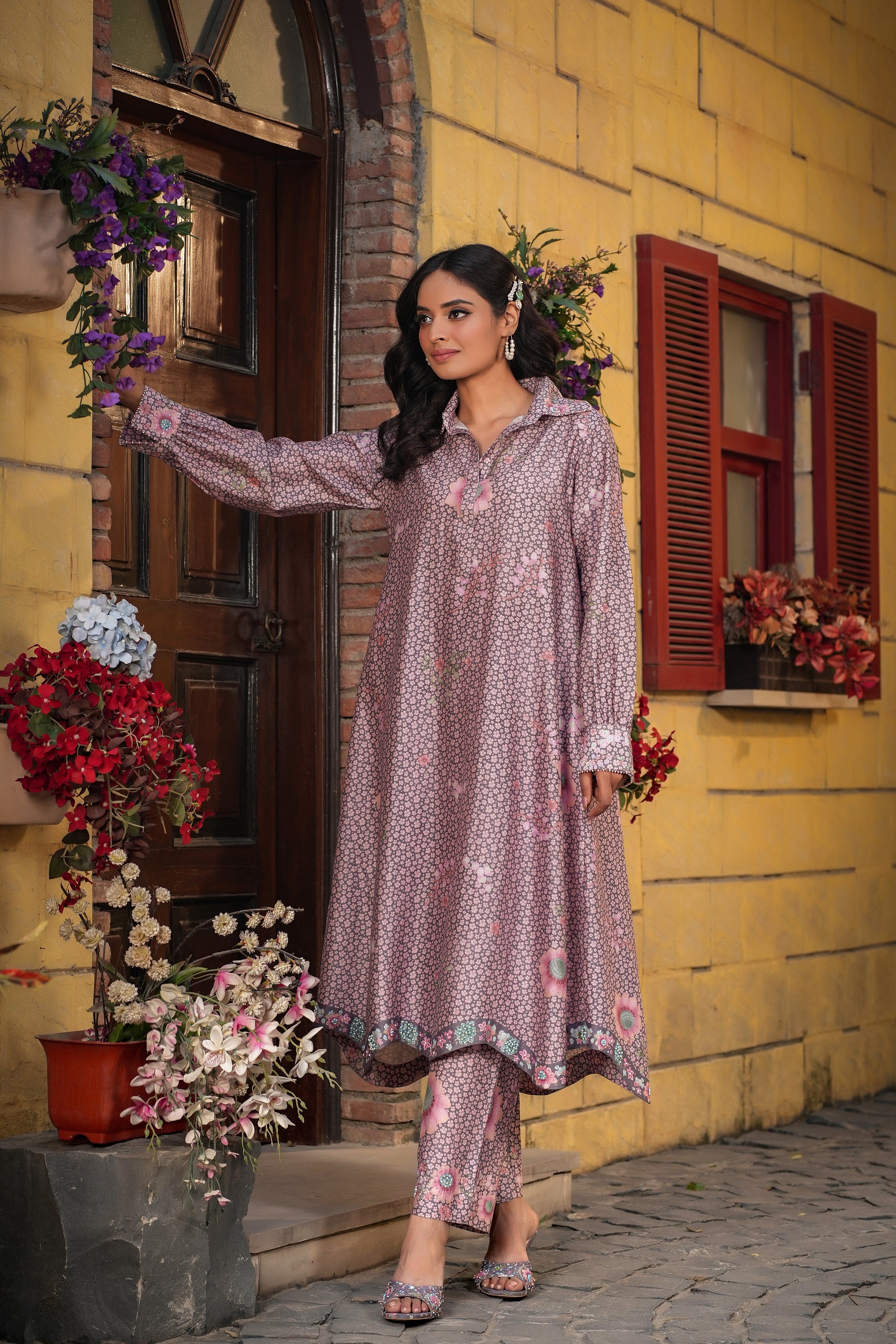 | This 2pc coord set is enhanced with delicate embroidery around collar and cuff of the sleeves . |