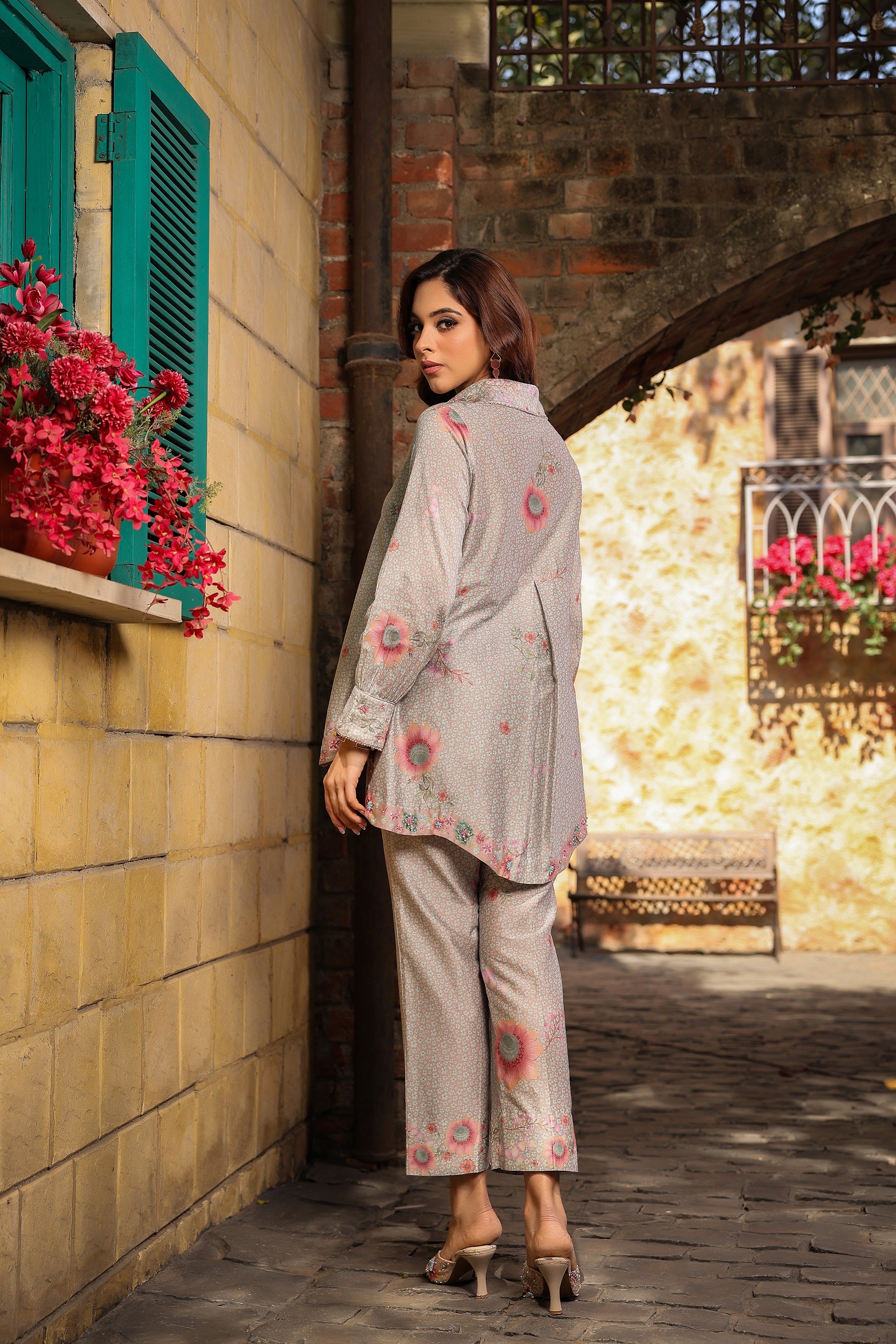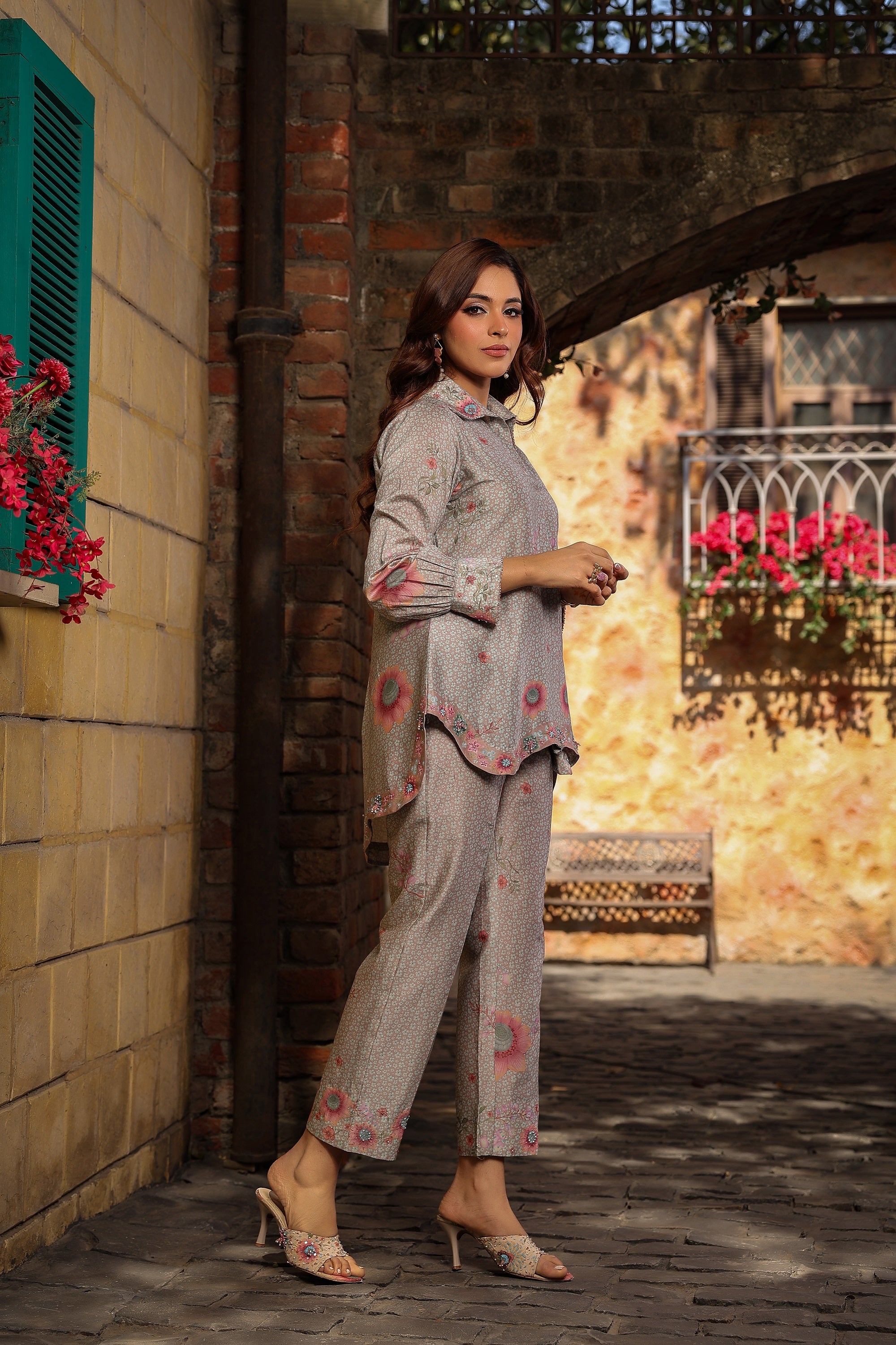| This 2pc coord set is enhanced with delicate embroidery around collar and cuff of the sleeves . |
