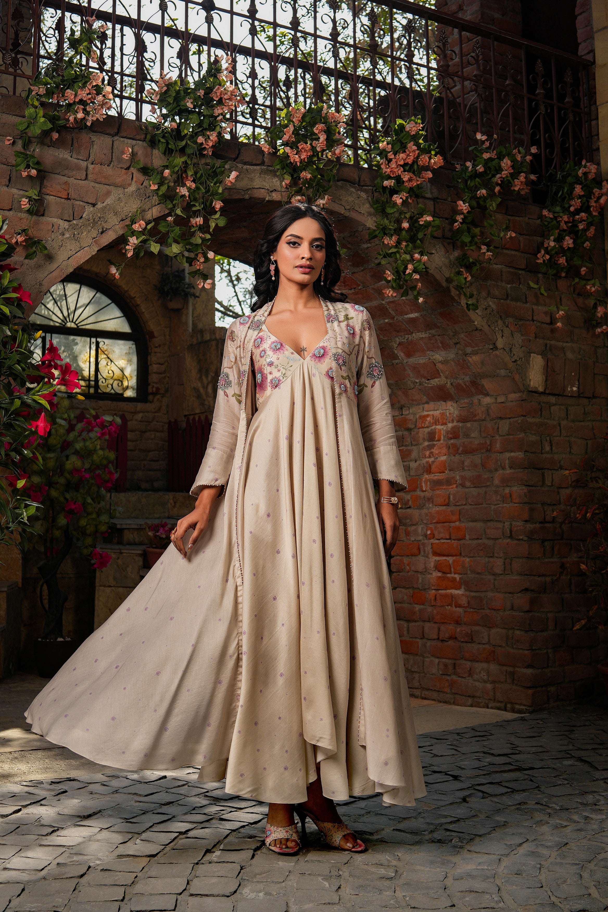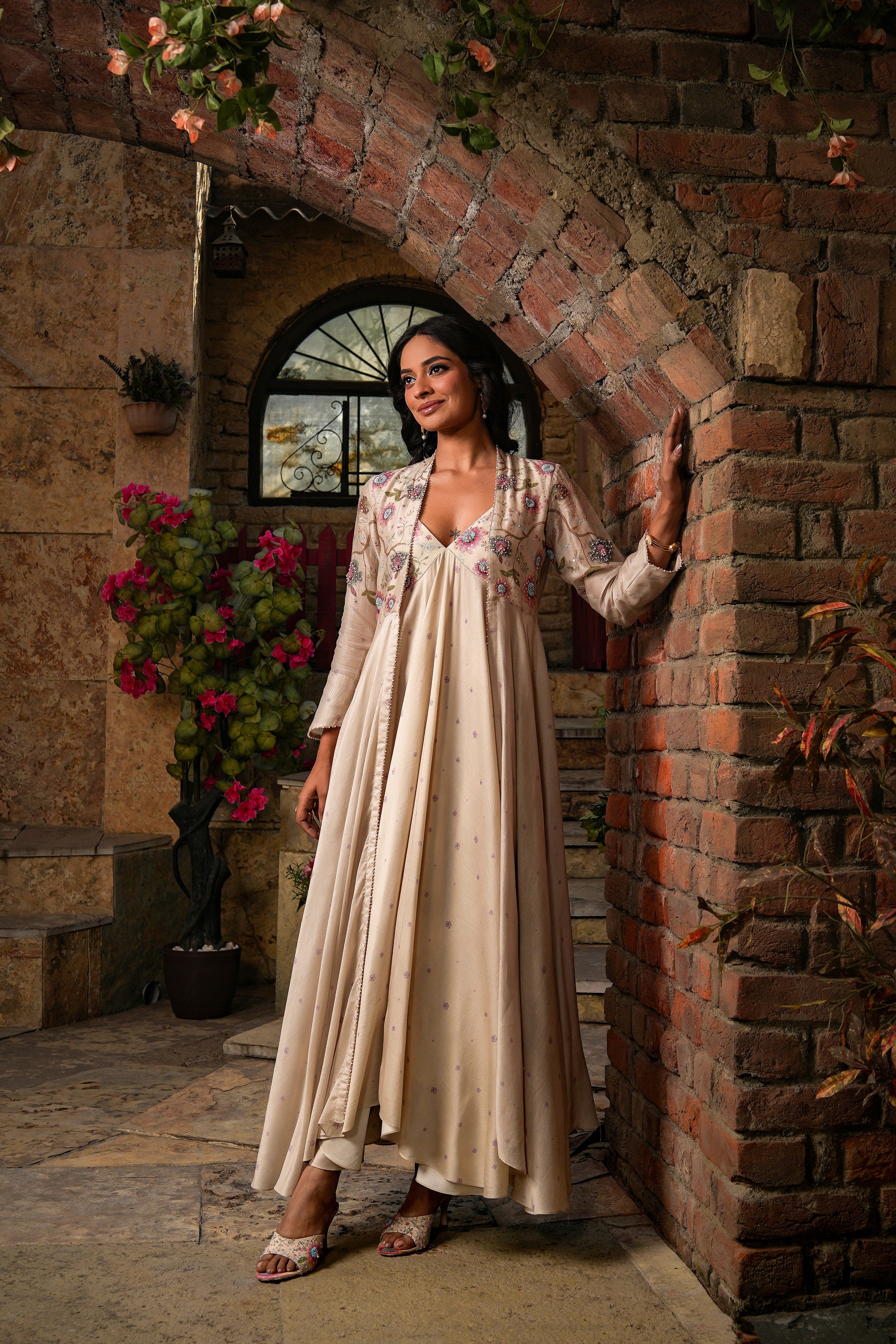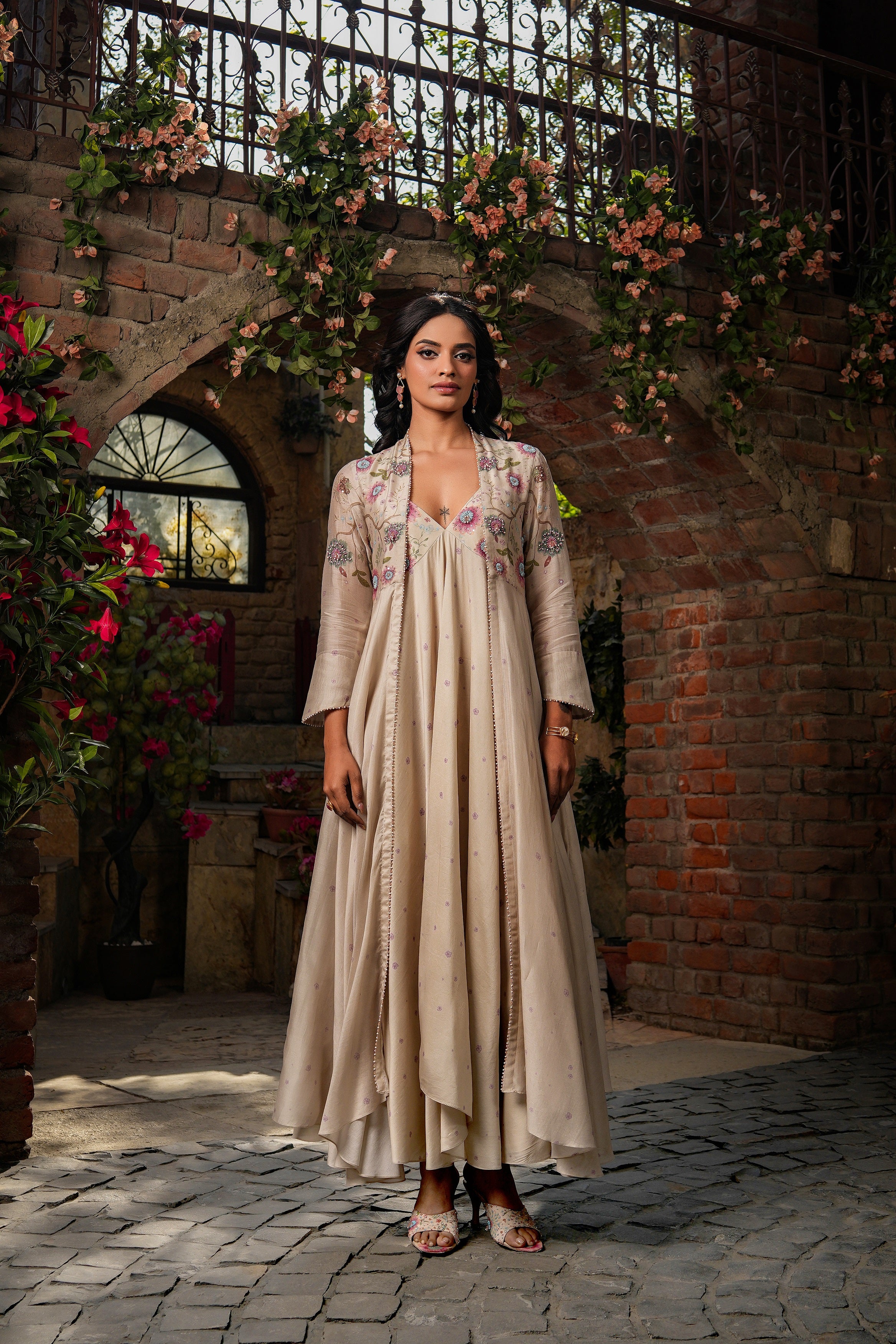 This 2pc jacket style is enhanced with delicate embroidery around the yoke and sleeves. It comes along with an embroidered sleeveless dress.