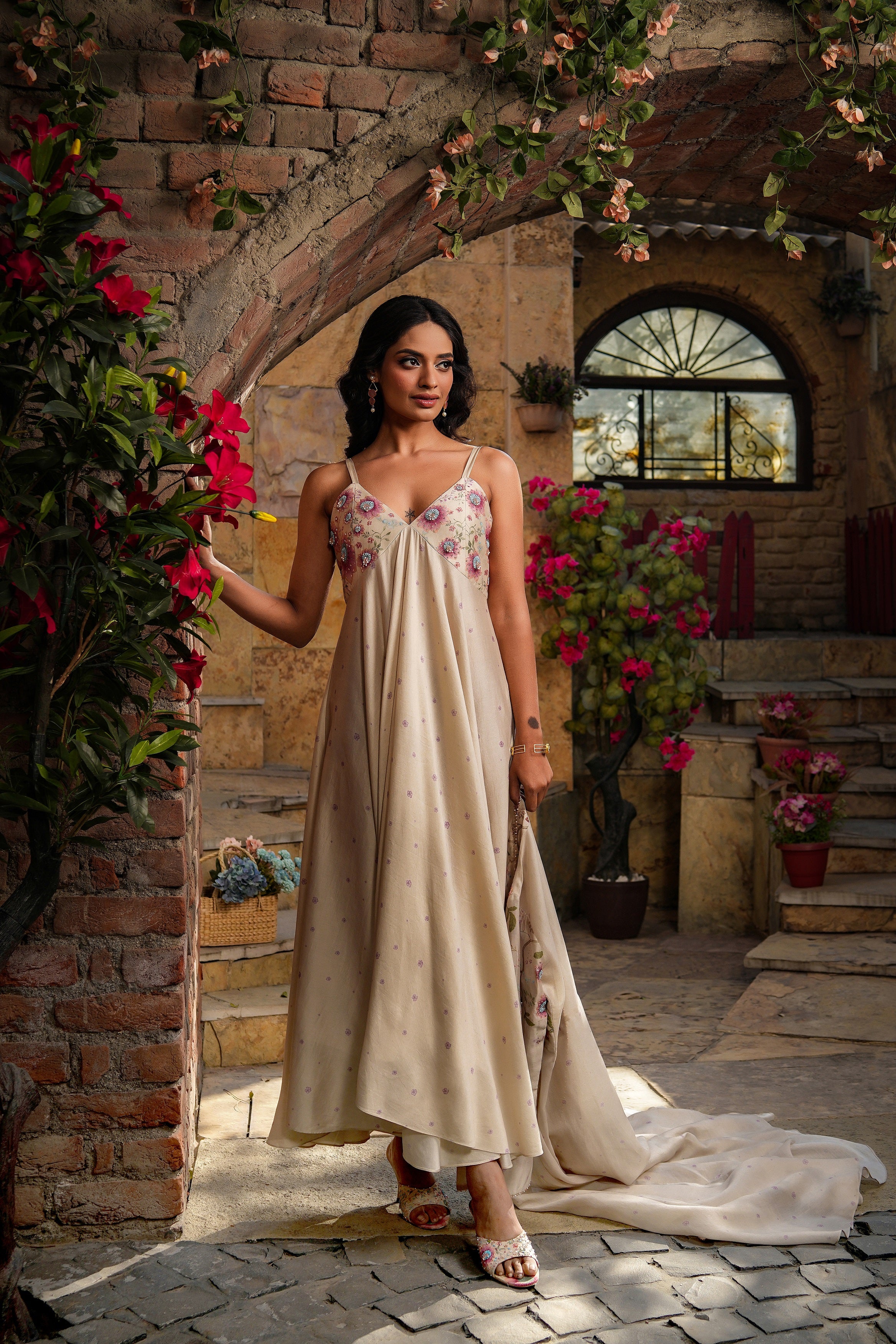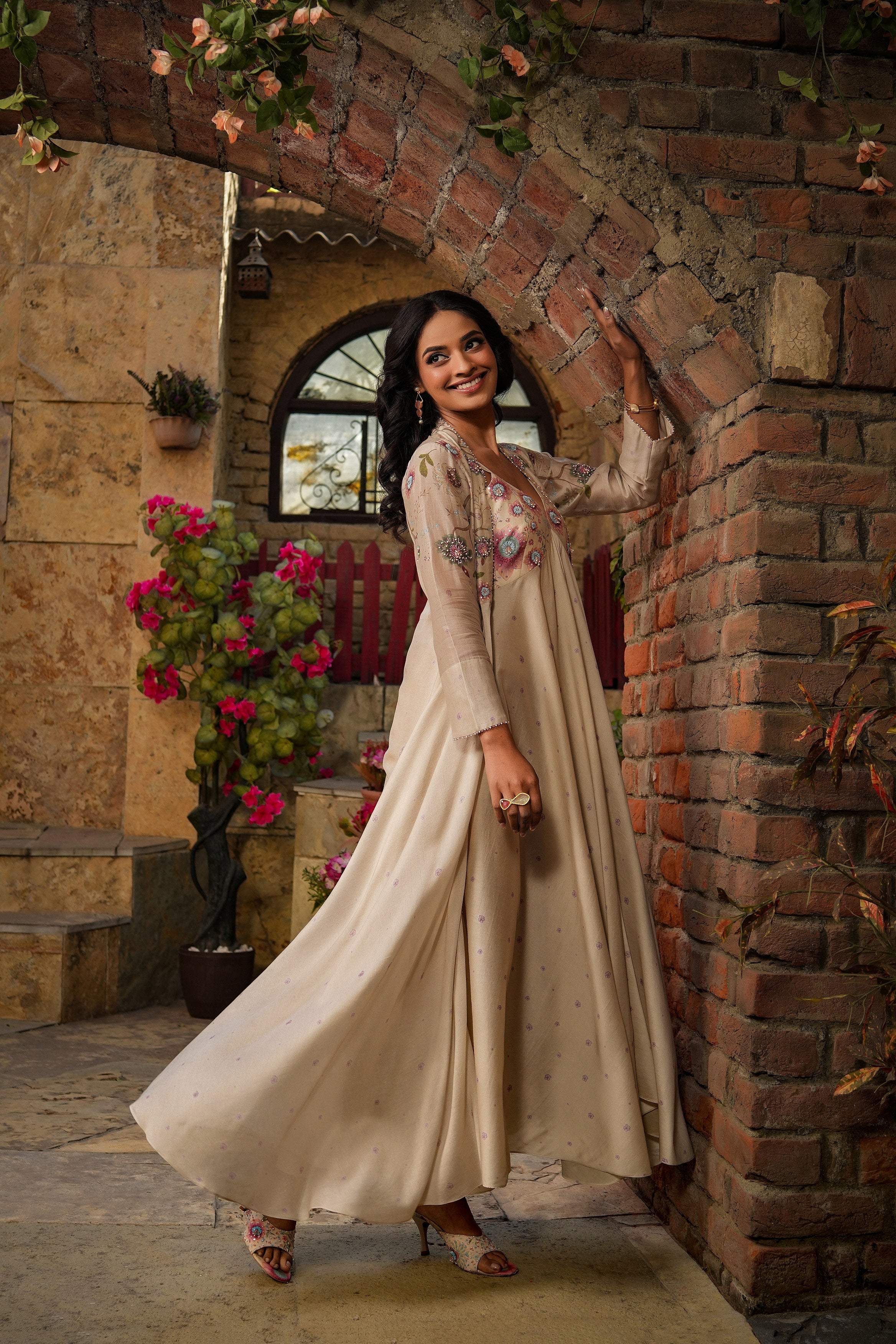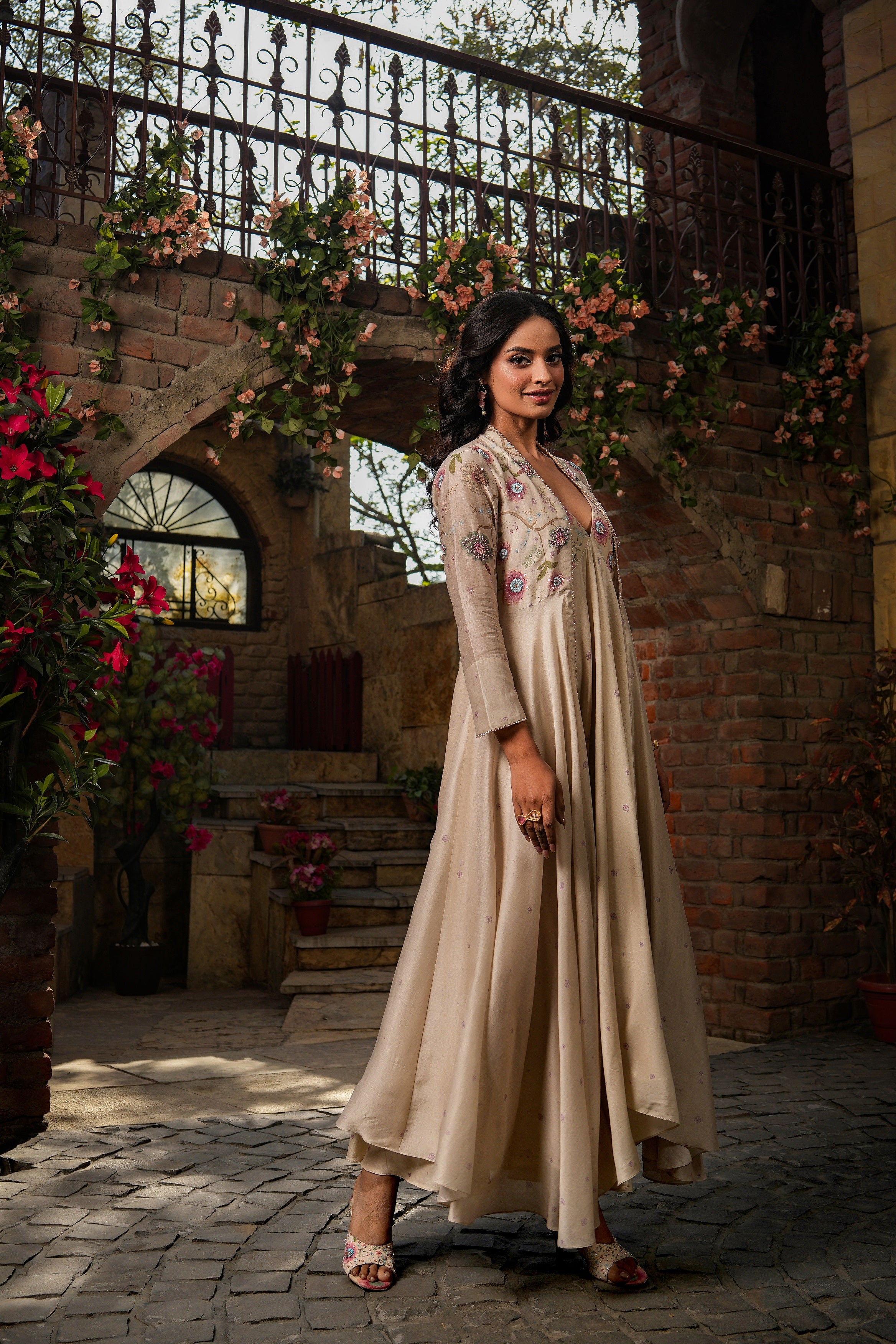 This 2pc jacket style is enhanced with delicate embroidery around the yoke and sleeves. It comes along with an embroidered sleeveless dress.