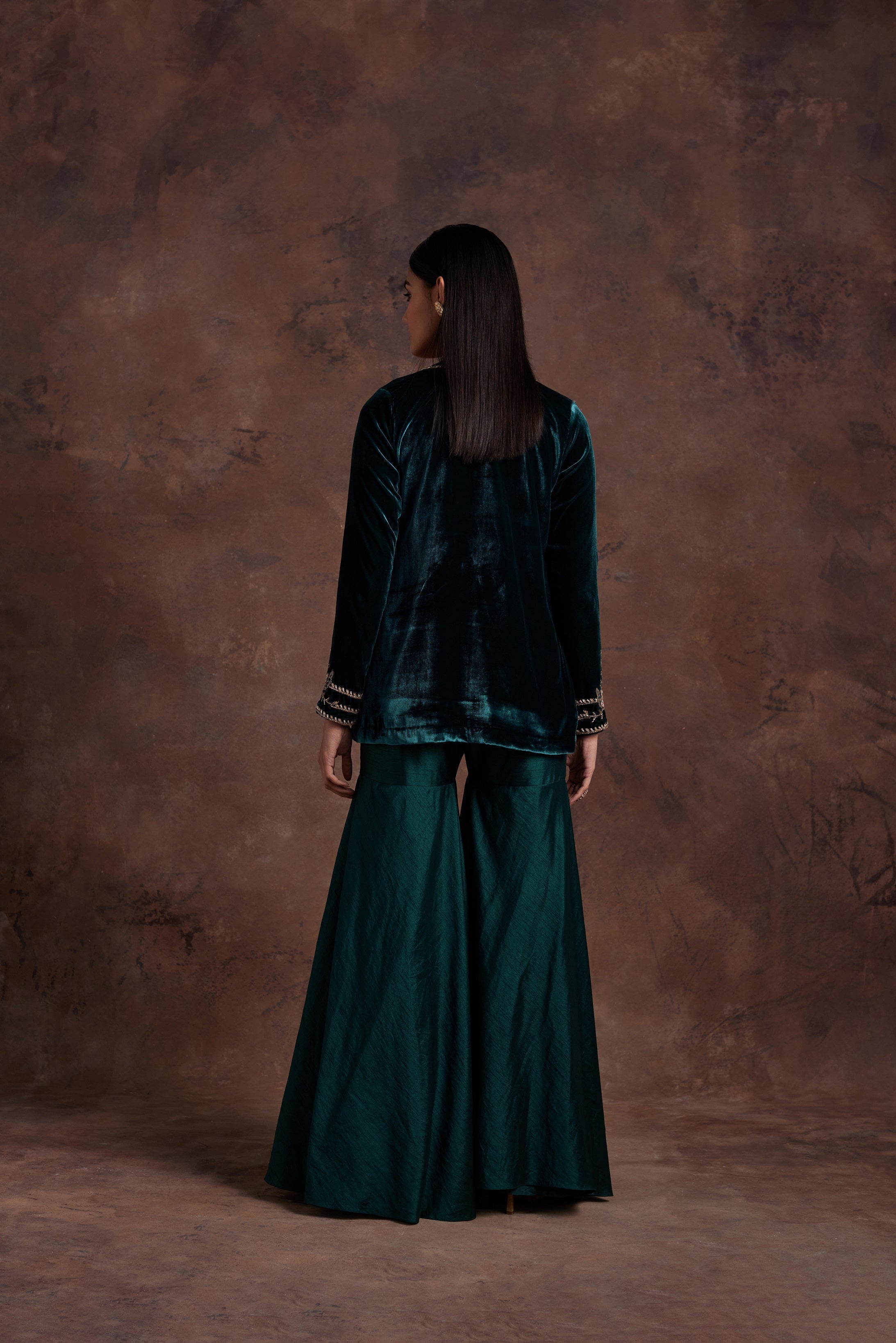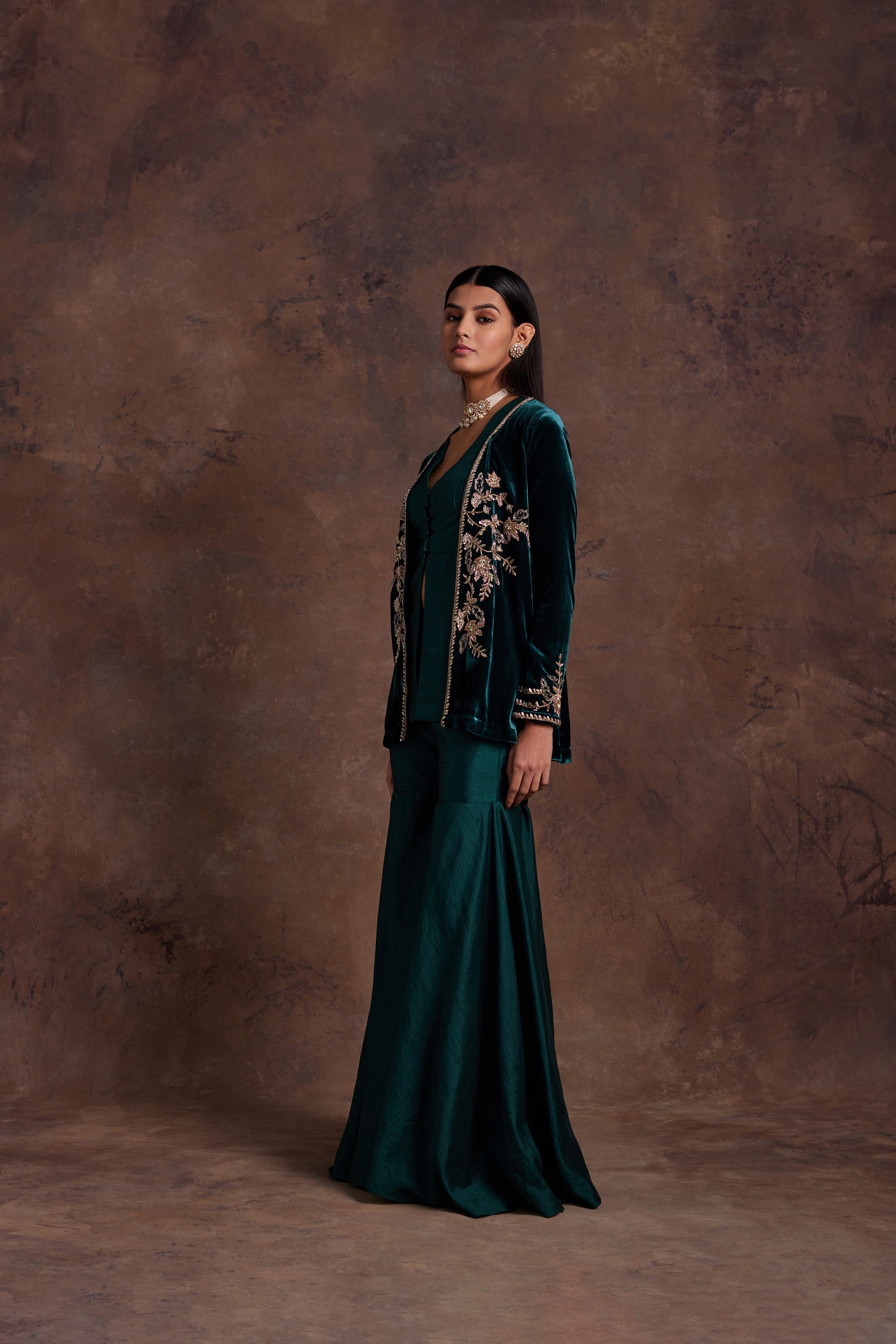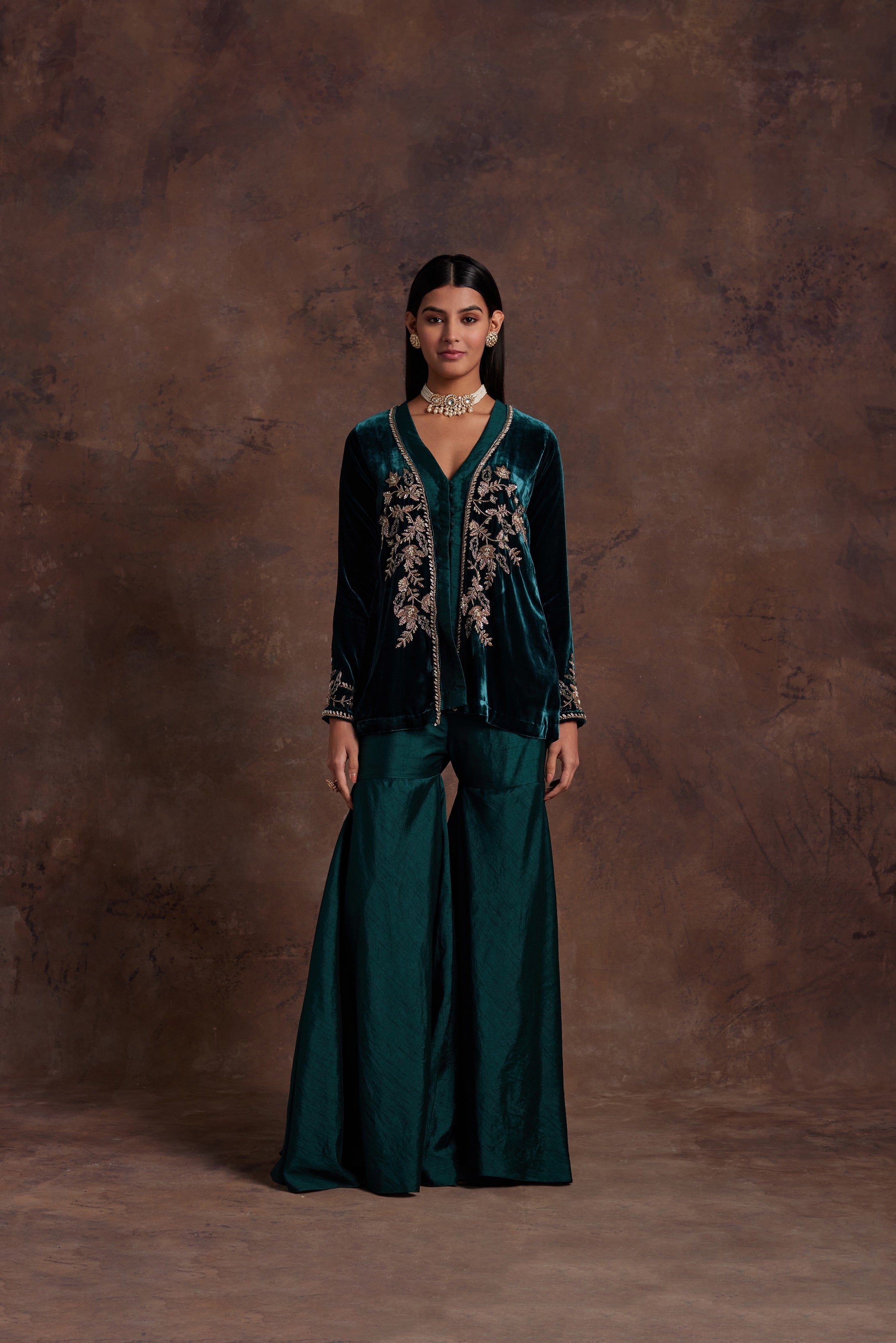 Green silk velvet jacket with hand embroidery at the front center and sleeves, it is paired with a silk peplum with v neckline and potli buttons and sharara pants.
