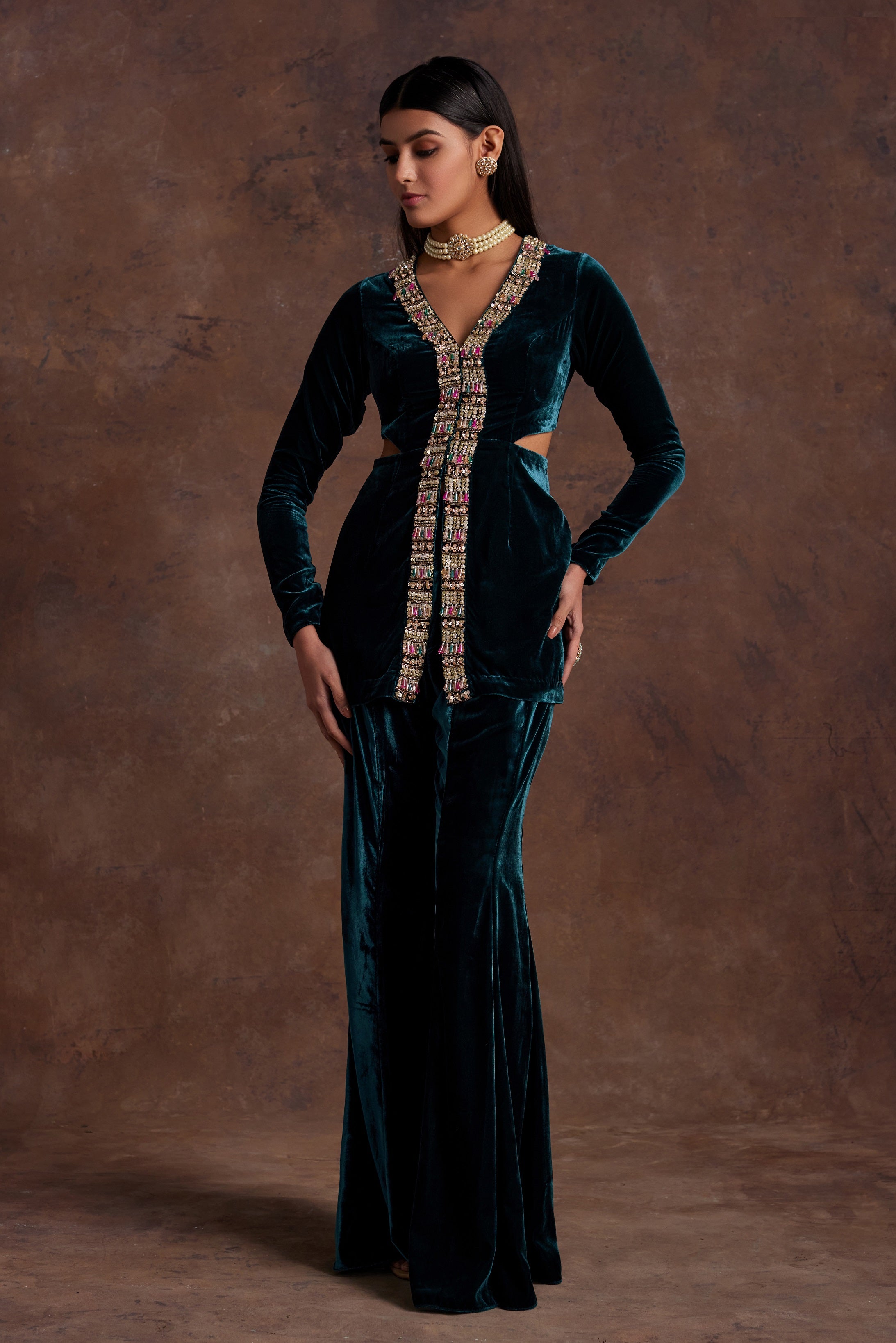 | Green silk velvet pantsuit with hand embroidery having tassel detailing at the center front and cut outs at the waist. |