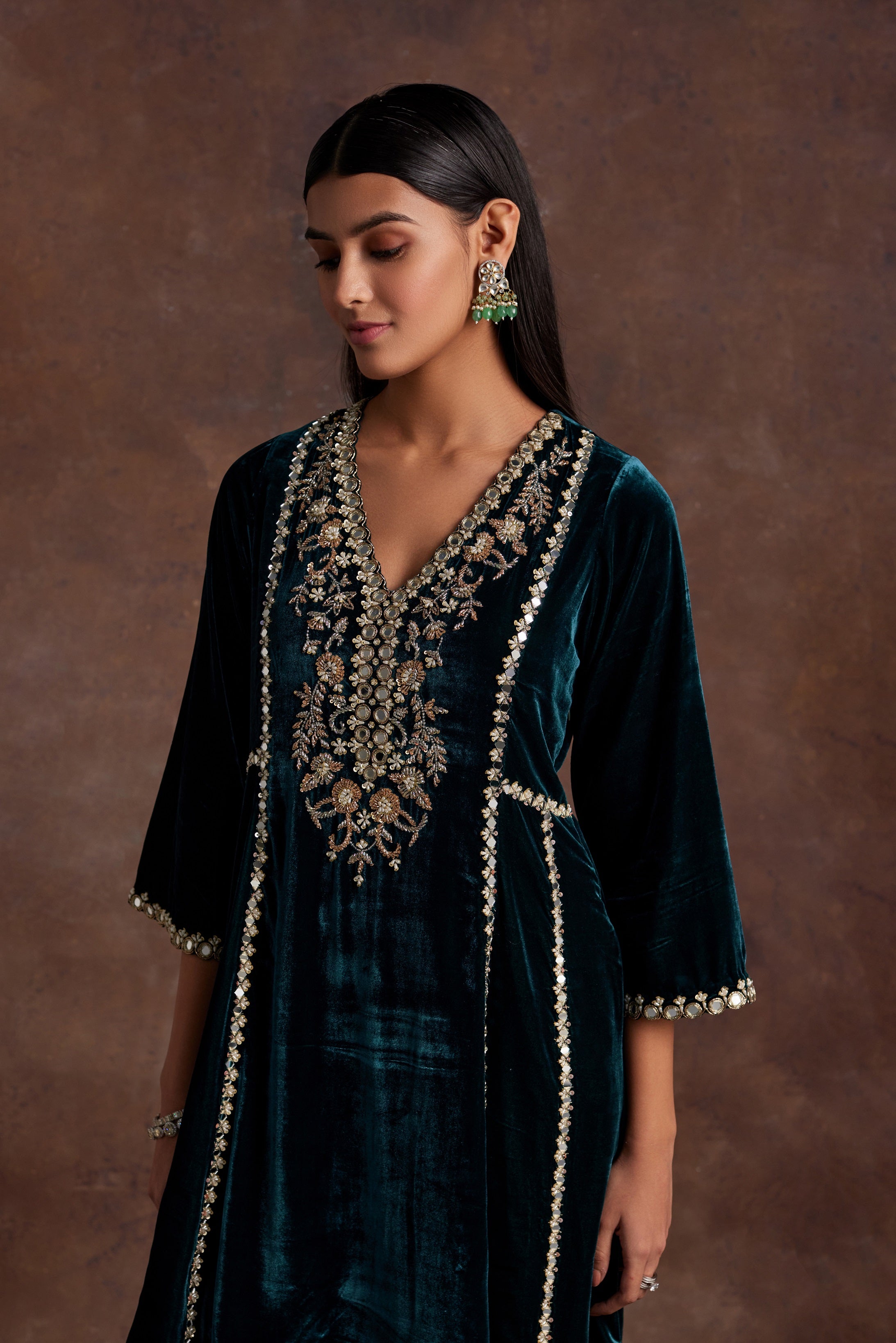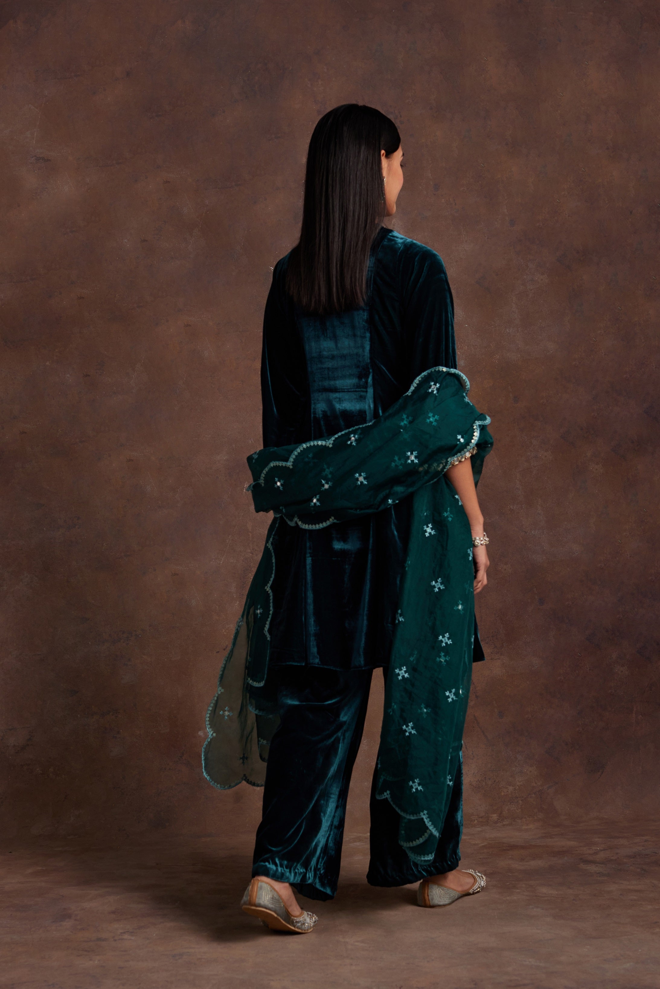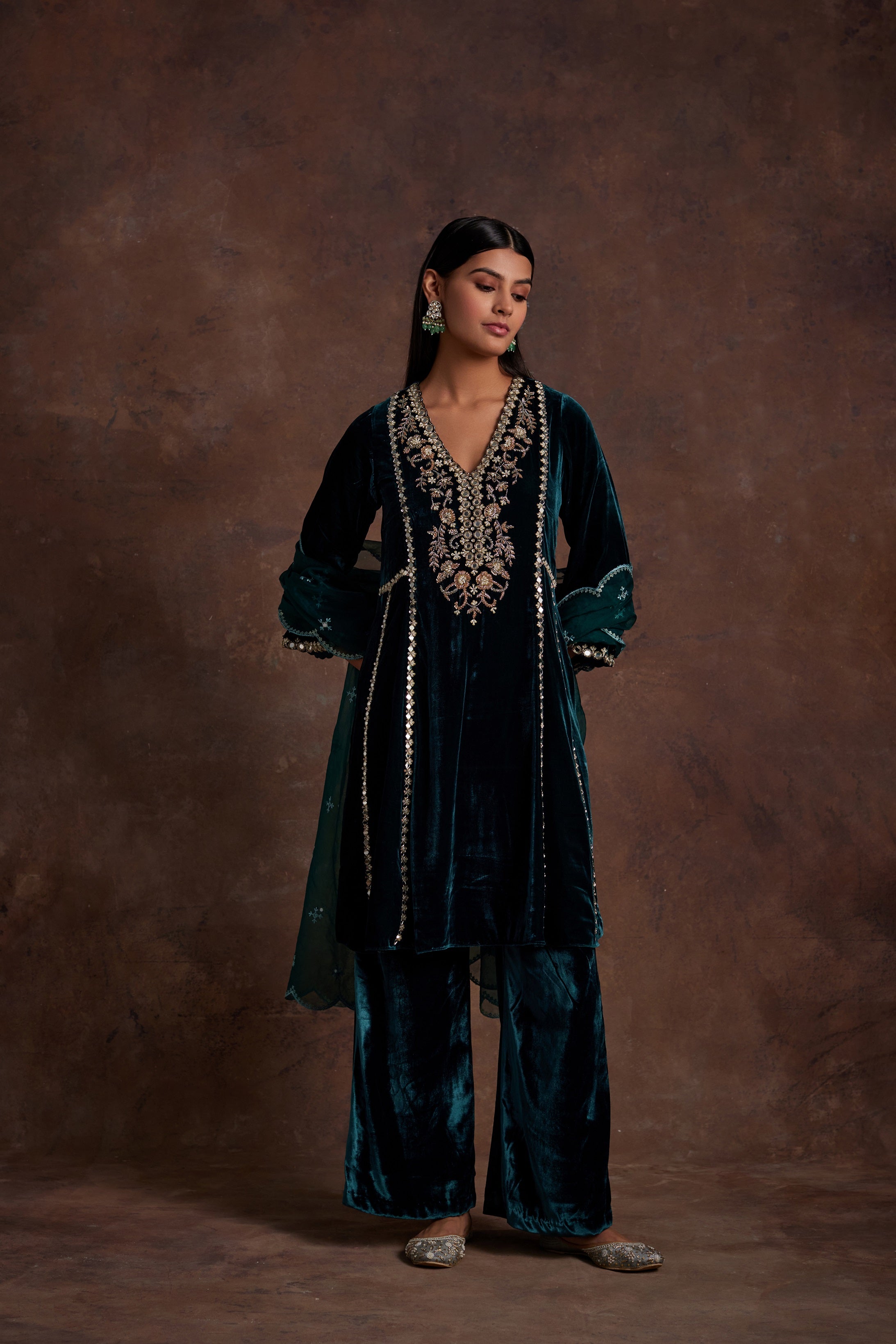 | Green silk velvet suit with embroidery at the neckline and sides, it is paired with ankle length pants and organza dupatta. |