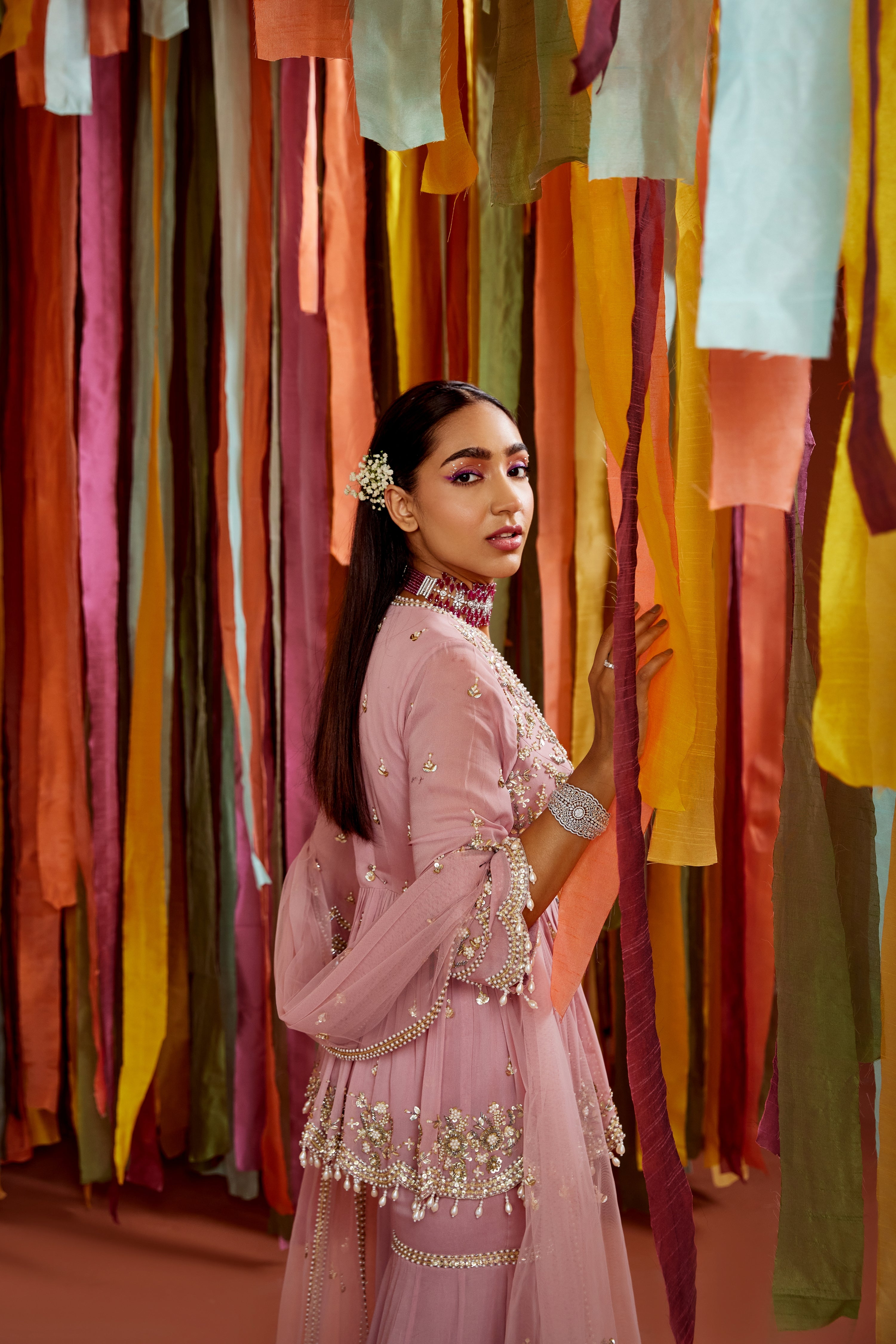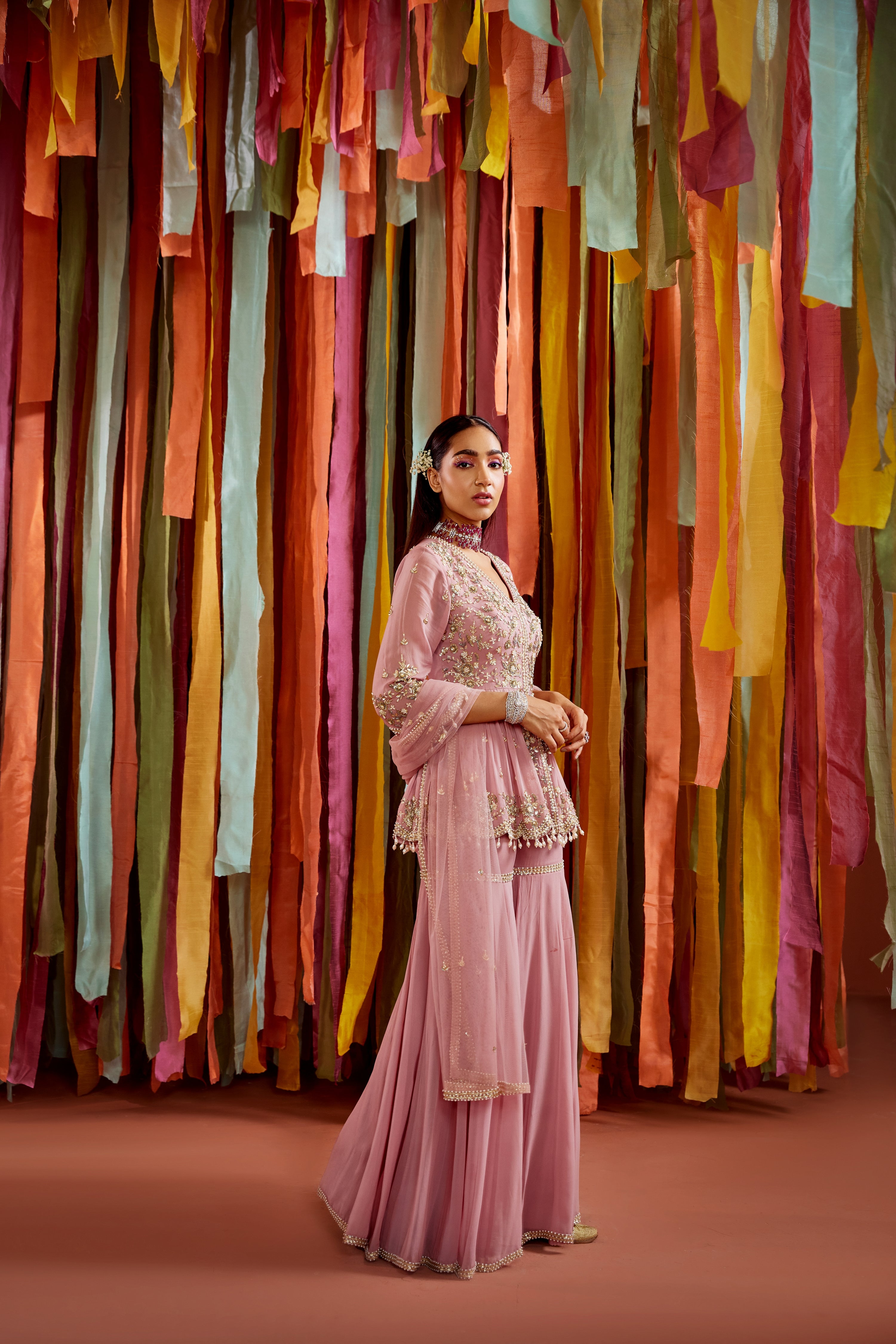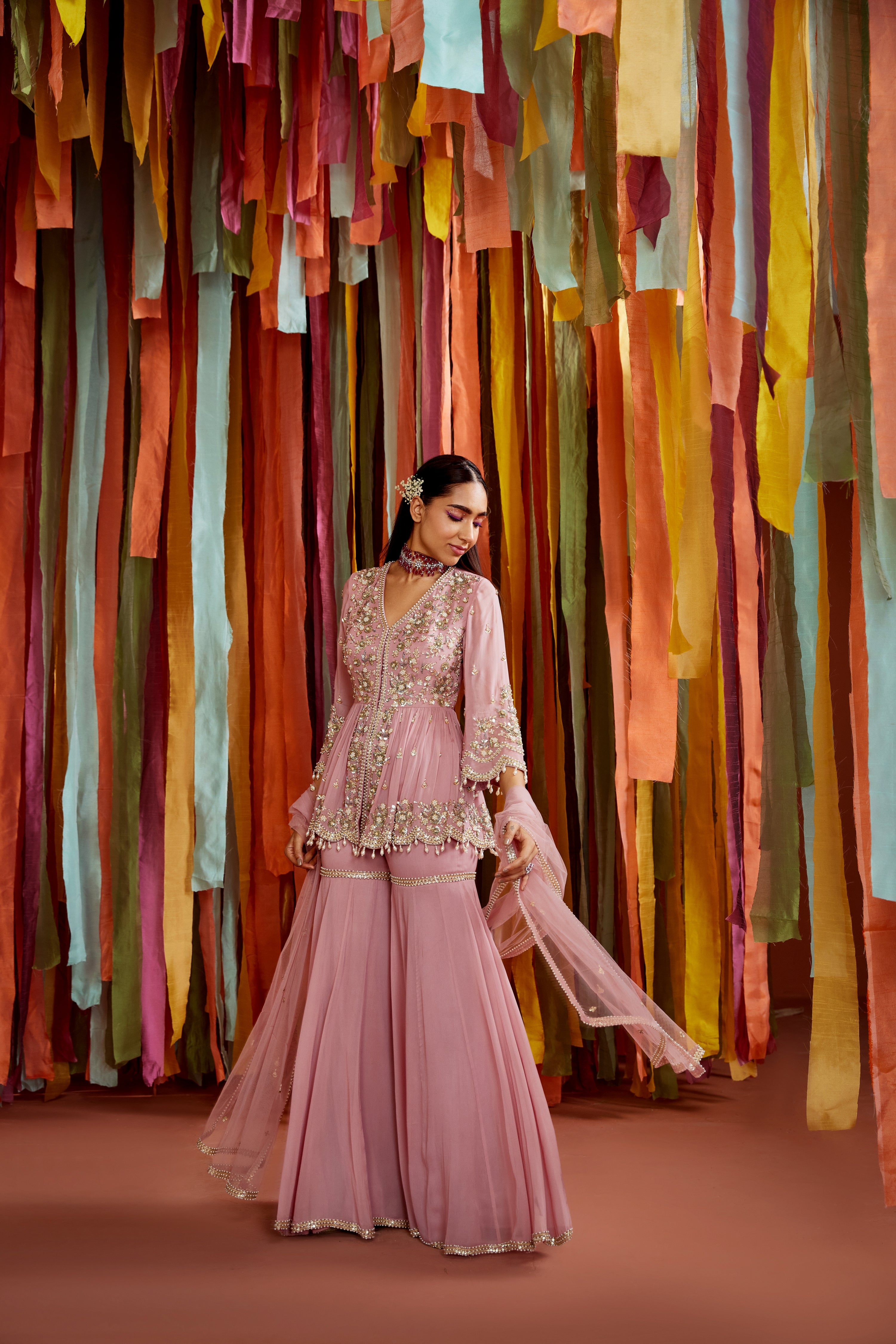 Mauve georgette hand embroidered peplum with gathers. It has a fully embroidered yoke with scallop borders. It is paired with a georgette sharara with embroidery detailing at thigh and borders and a net dupatta with borders and sprinkling.