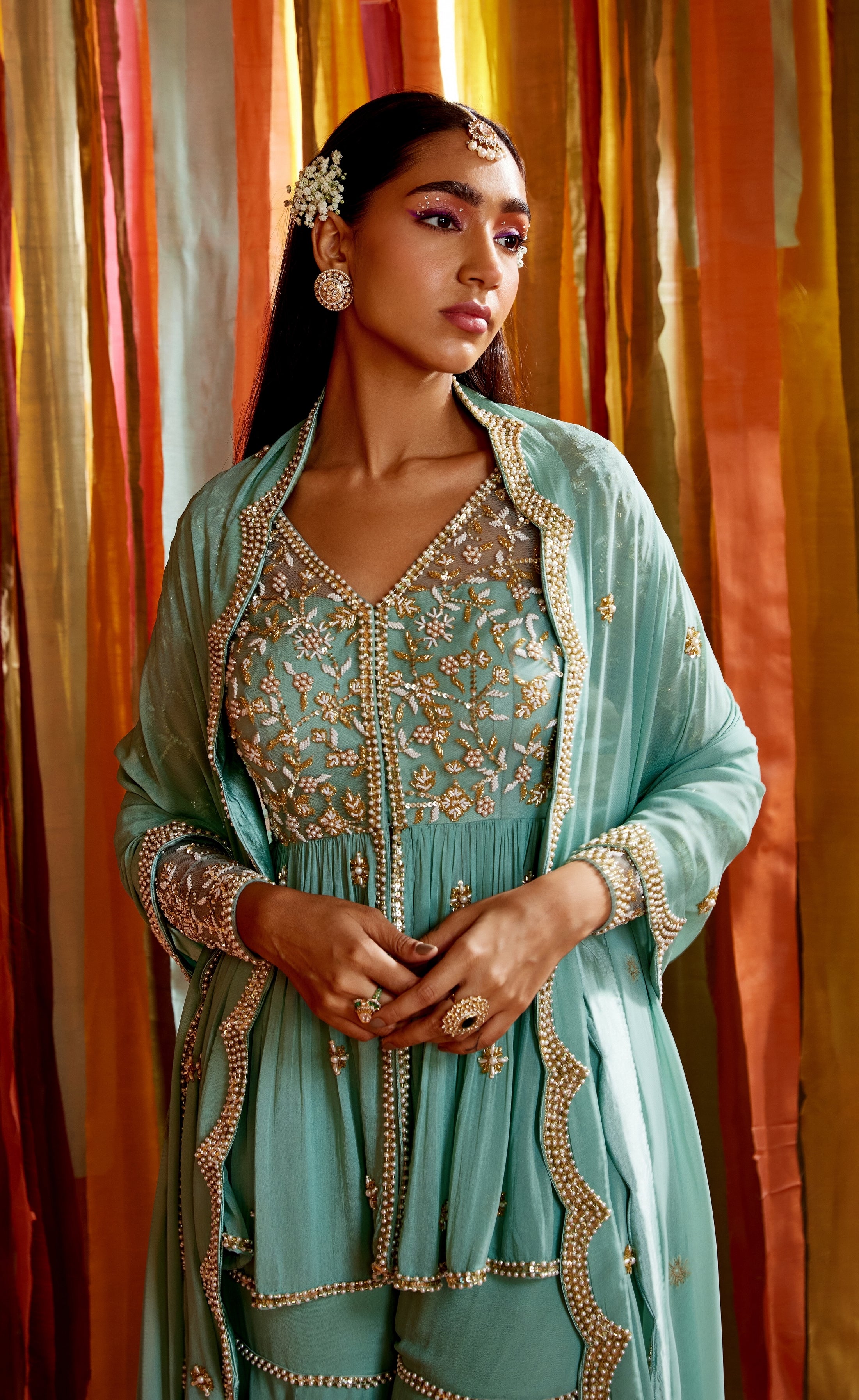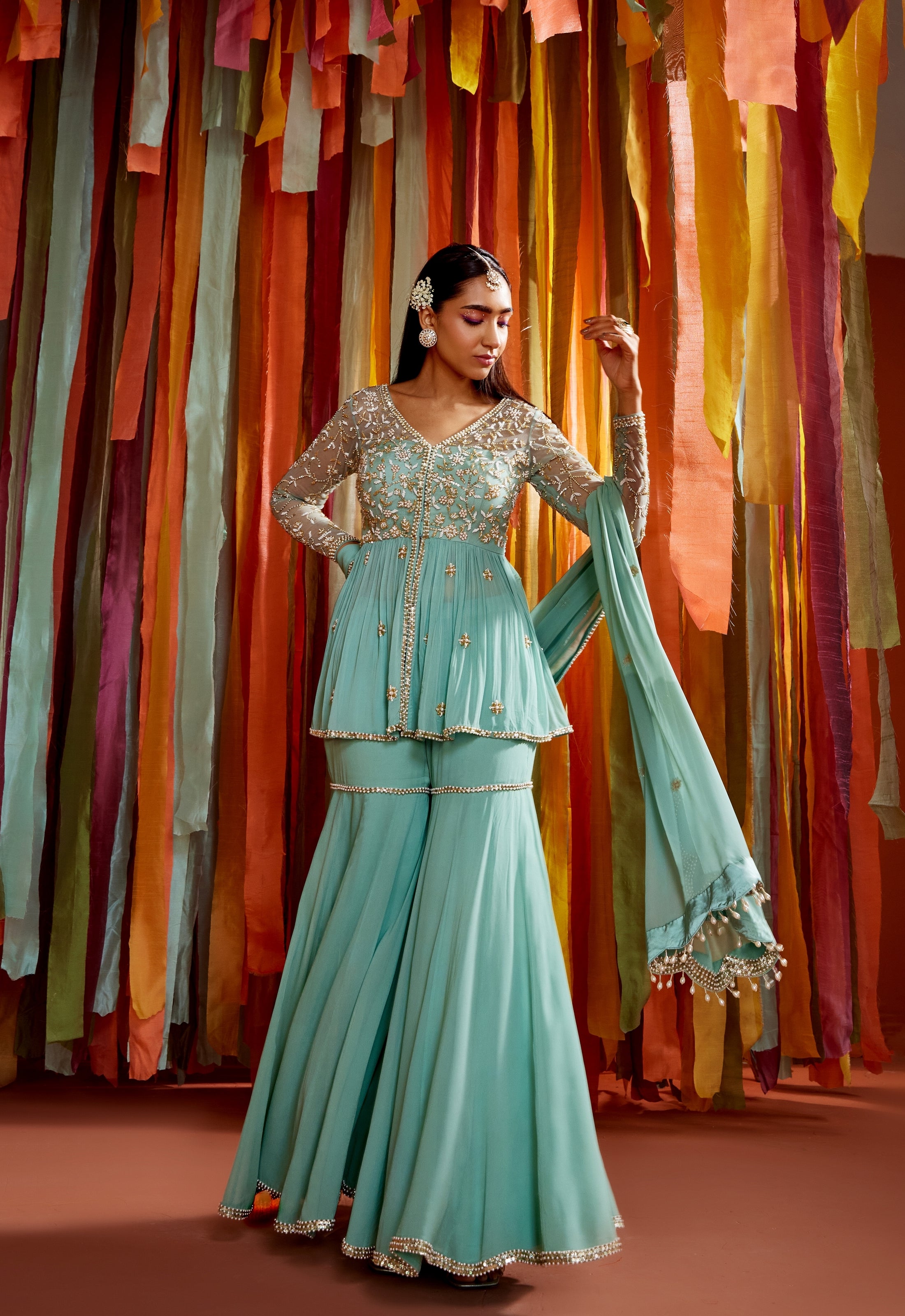 Mint green net and georgette hand embroidered peplum in gold and white color embroidery. It has net sheer sleevs and gathers at the peplum. It is paired with a matching sharara in georgette and has embroidery at the hem and thigh.