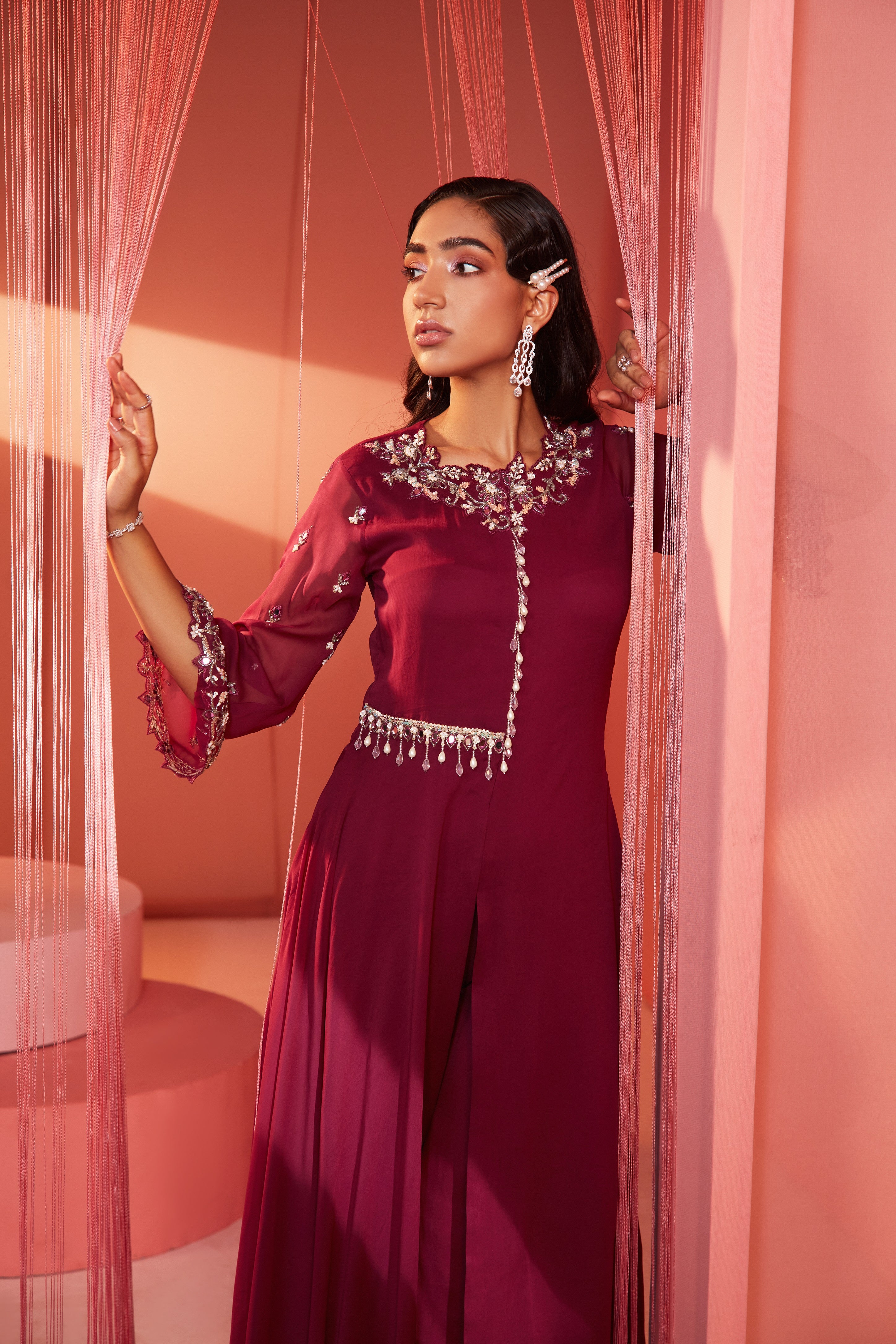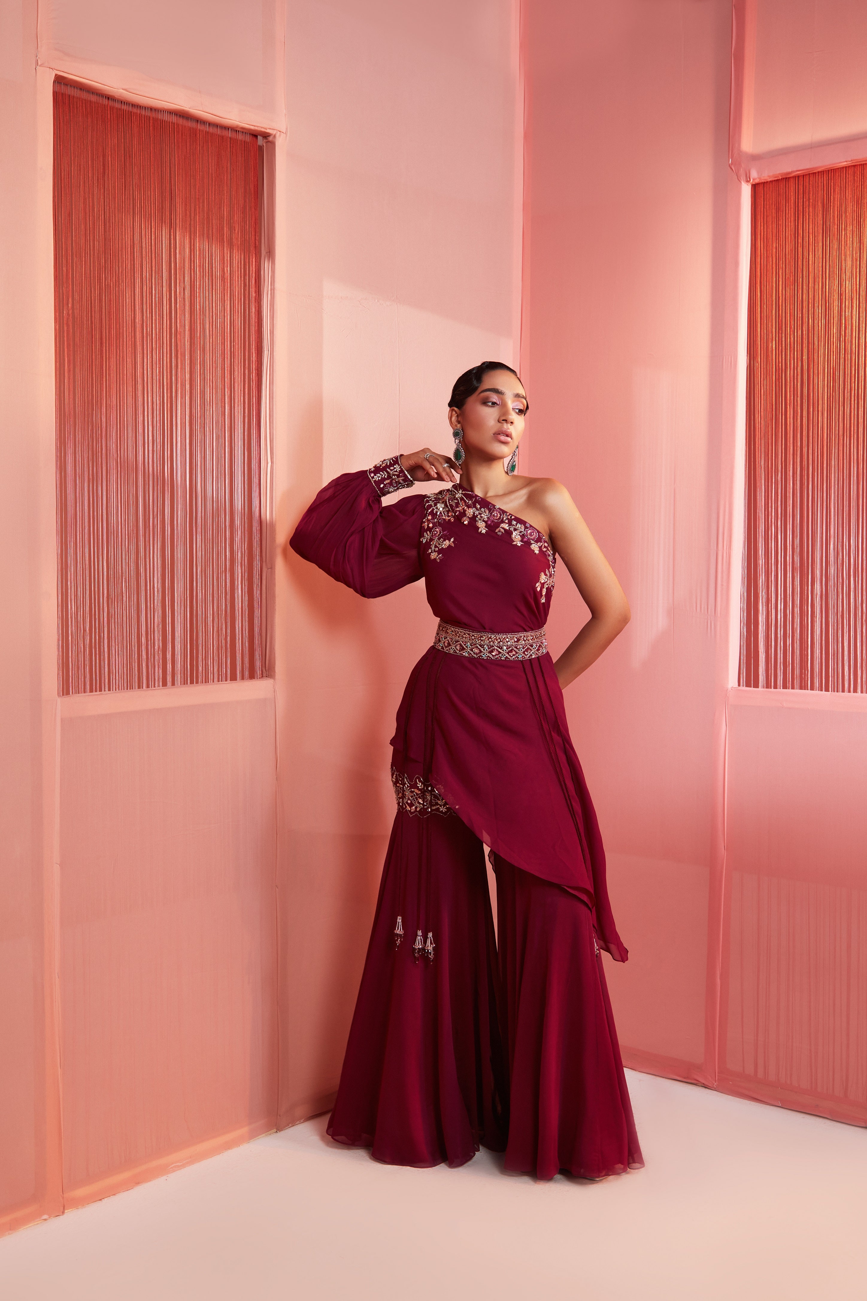 Plum one shoulder cape and sharara